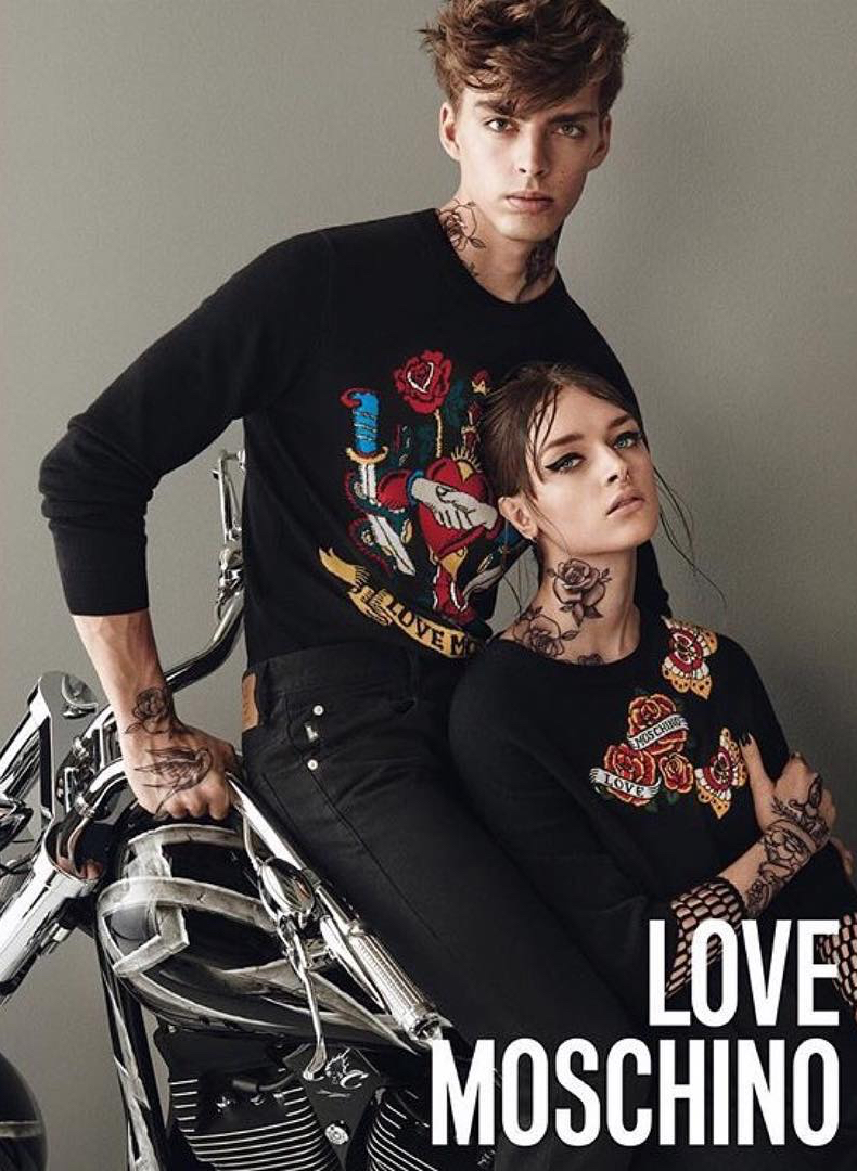 After gracing the pages of Vogue Russia, model Daan van der Deen links up with fashion photographer Giampaolo Sgura for Love Moschino’s latest campaign. Embracing a rebellious young look in black with temporary tattoos, Daan joins model Daga Ziober for the brand’s fall-winter 2015 advertising campaign.