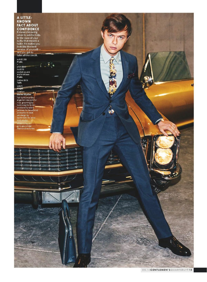 New Money–Dane DeHaan just may be one of our favorite young actors to grace the pages of countless magazines. Transforming to fit each magazine’s vision, The Amazing Spider-Man 2 actor is an engaging personality. For GQ’s, May issue, the Prada campaign star connects with photographer Sebastian Kim. Captured in a car garage, DeHaan is a natural fit for a suiting editorial, donning sharp fits from Burberry London, Emporio Armani and other luxury labels.