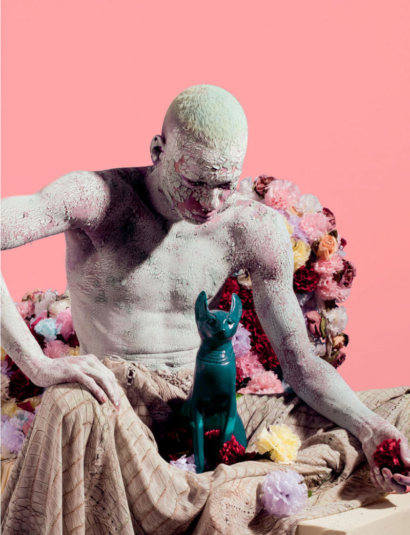 Divine Purpose–Photographer Matthew Stone and stylist Matthew Josephs reunite for the summer issue of i-D. Aided by the grooming of Isamaya Ffrench and set design by David White, Daniel Bamdad, Korrel Kennedy and Theio Maddix join Alek Wek for a visually stunning feat highlighting pieces from labels, ranging from Kenzo to Prada.