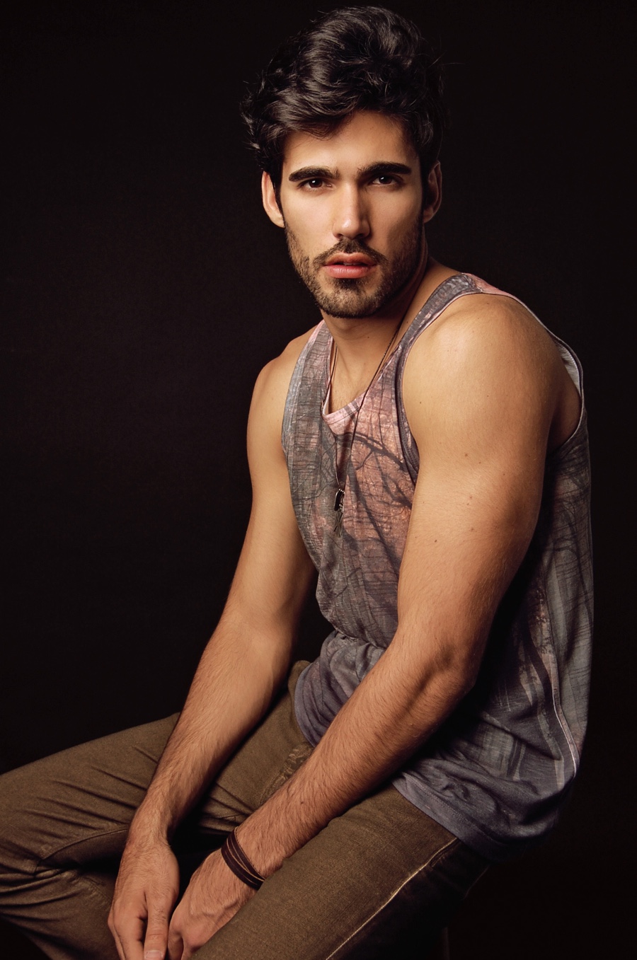 Daniel Kakoulidis sports a graphic tank as he sits for a relaxed photo.