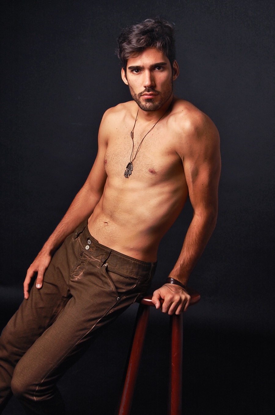 Daniel Kakoulidis goes shirtless in brown slim-fit pants.