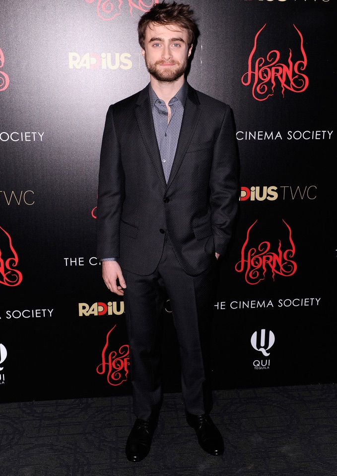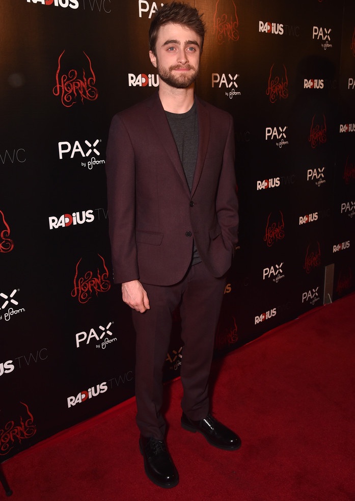 PinRelaxed in burgundy, Daniel Radcliffe paired a slim-cut suit with a simple t-shirt for the Los Angeles premiere of ‘Horns’ on October 30th.