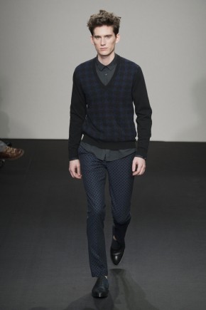 Daniele Alessandrini Fall/Winter 2014–Approaching menswear with a practical sensibility, Daniele Alessandrini sent a lineup down the catwalk boasting the fundamentals for a smart wardrobe. Continuing the slim lines of the season, trousers, sharp jackets and shirts were cut narrow. Dressing the collection in houndstooth, polka dots and stripes, interchangeable pieces were plentiful, easily providing Alessandrini’s man with the style tools to take his look from casual to formal at a moment’s notice.