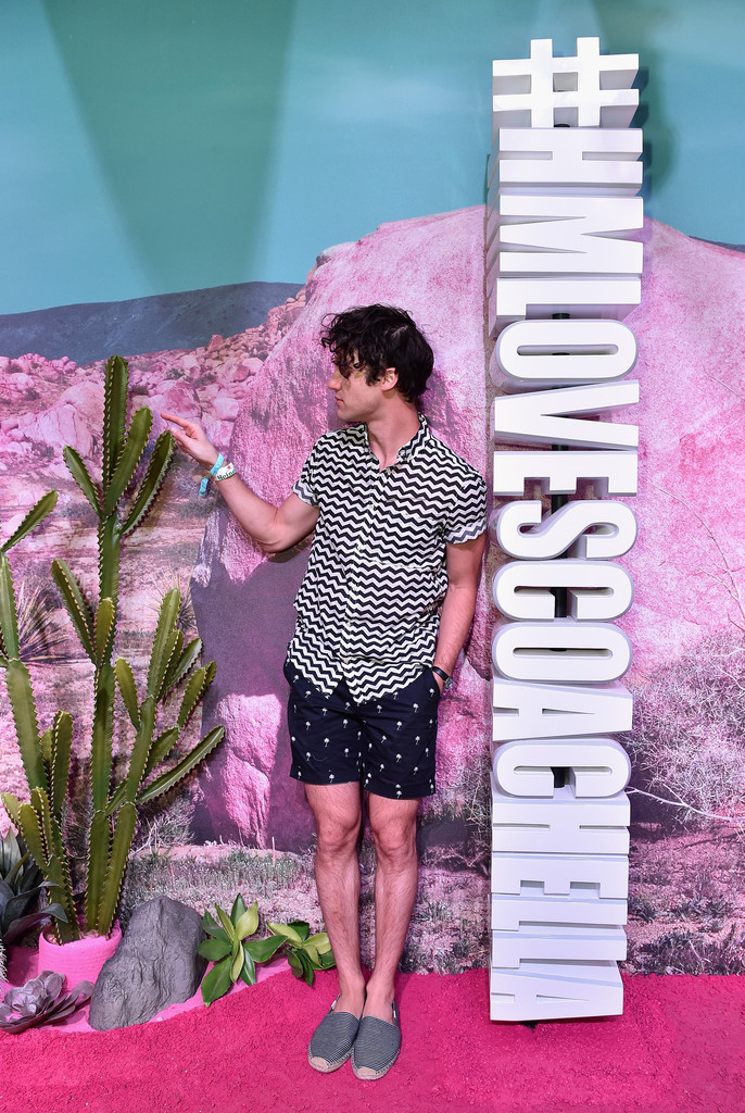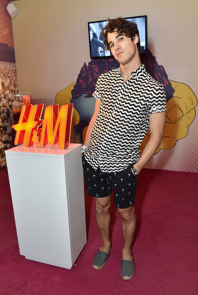 Darren Criss was on-hand for the H&M Love Coachella Pop Up in Indio, California. Criss went casual for the occasion, wearing clothes from H&M’s latest men’s arrivals. Donning a pair of striped espadrilles, the 29-year-old actor embraced a mix of head-to-toe prints. Channeling, carefree style, Criss is pictured in a short-sleeve zigzag shirt with cotton palm tree print shorts.