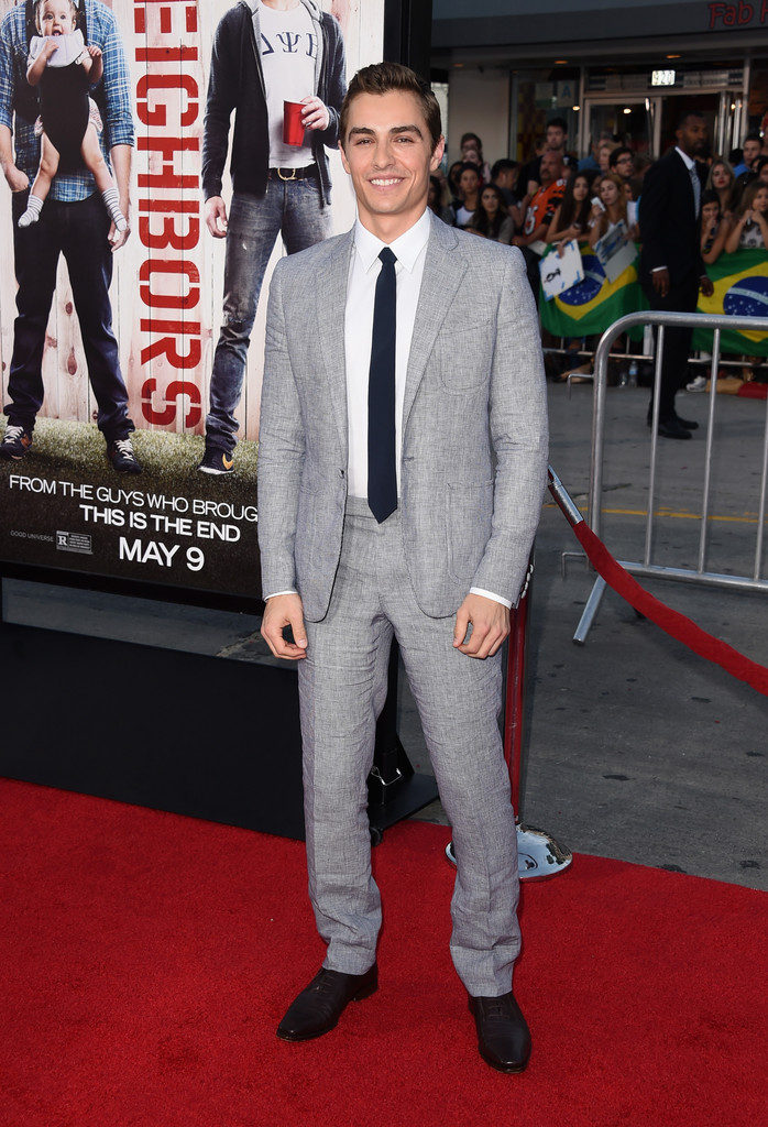 Franco in Band of Outsiders-Joining his costars Zac Efron and Seth Rogen at the Los Angeles premiere of Neighbors on April 28, 2014, actor Dave Franco joined the gray party in a tailored suit from Band of Outsiders. Always dapper, as seen at the opening night of his brother, James Franco’s Broadway stint for Of Mice and Men, Franco enlisted Band of Outsiders for a great suit in a light summer weight with a touch of texture.