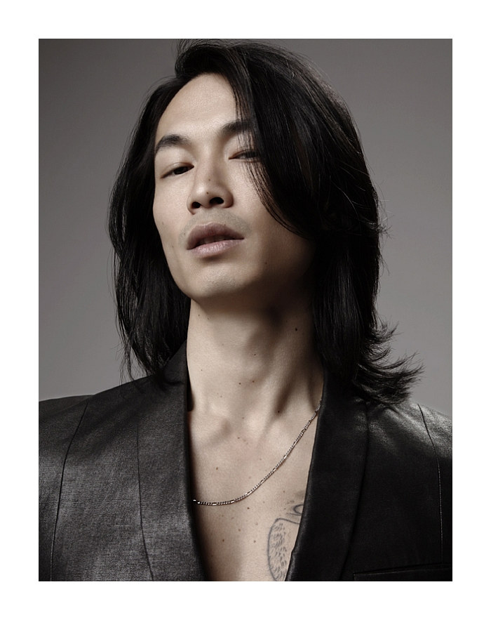 Jae wears leather jacket, trousers and shoes Robert Geller
