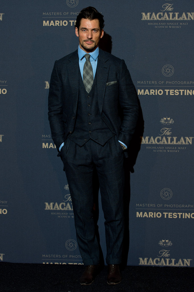 British model David Gandy stepped out with a dapper flair on November 12th to support the launch of The Macallan Masters of Photography: Mario Testino Edition in London. Posing for photos, David wore a three-piece suit with a matching plaid tie and pocket scarf.