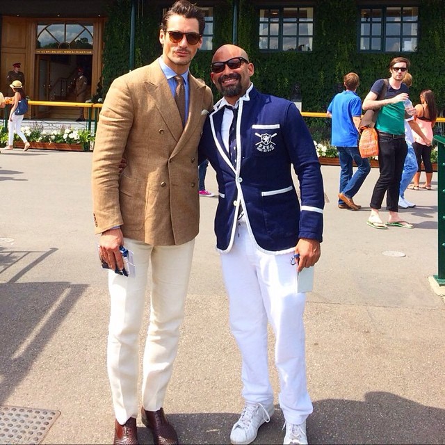 Wimbledon 2014–British model David Gandy was in attendance for the quarter finals of the men’s tournament at Wimbledon earlier this week, looking distinguished in pieces by Ralph Lauren. A very dapper double breasted herringbone jacked was paired with a taupe knit tie and a cream linen trouser to great effect. Gandy took to his Instagram account to share a photograph of himself at the event with fashion photographer Arnaldo Anaya-Lucca, who was also wearing Ralph Lauren.