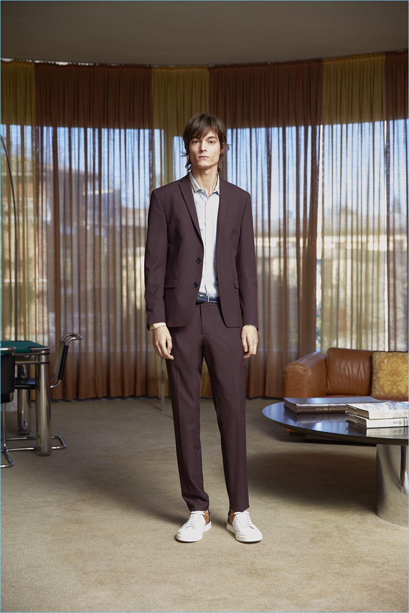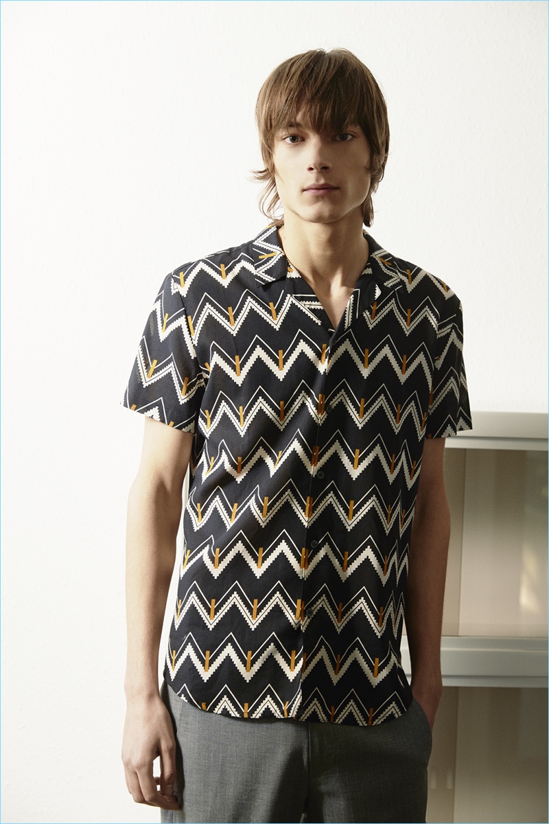 A color palette of burgundy, grey, white, black, and vibrant pops of color complement prints inspired by the 1970s. Embracing a retro attitude, David Naman also features Cuban collared shirts and chevron patterns for the season. / Grooming by Serena Congiu.