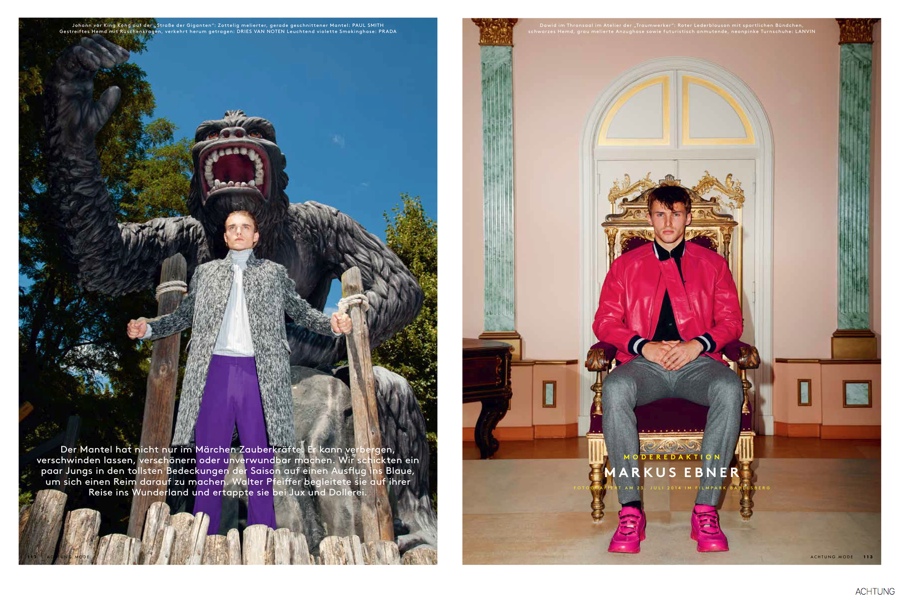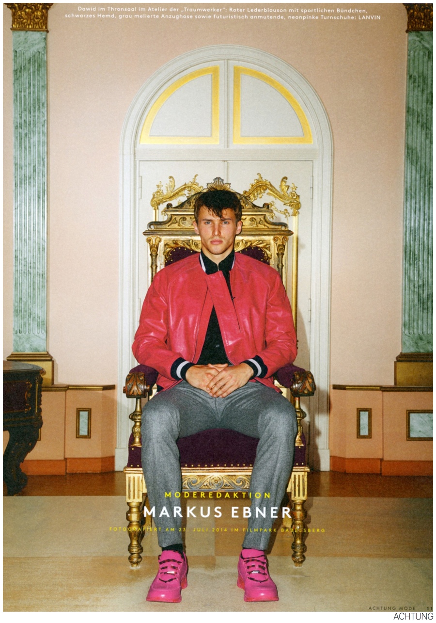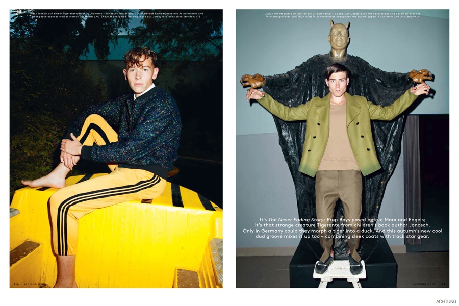 Color Outing-Photographed by Walter Pfeiffer, models Dawid Schaffranke, Johann Becker, Julius Pfister and Franz Joseph head to German ‘Filmpark’ Babelsberg for the latest edition of Achtung magazine. Exhibiting a playful energy, the models are captured in bold, colorful fashions from Lanvin, Dior Homme, Burberry Prorsum and more as they pose in looks styled by Markus Ebner. / Makeup by Jodi Gardner.