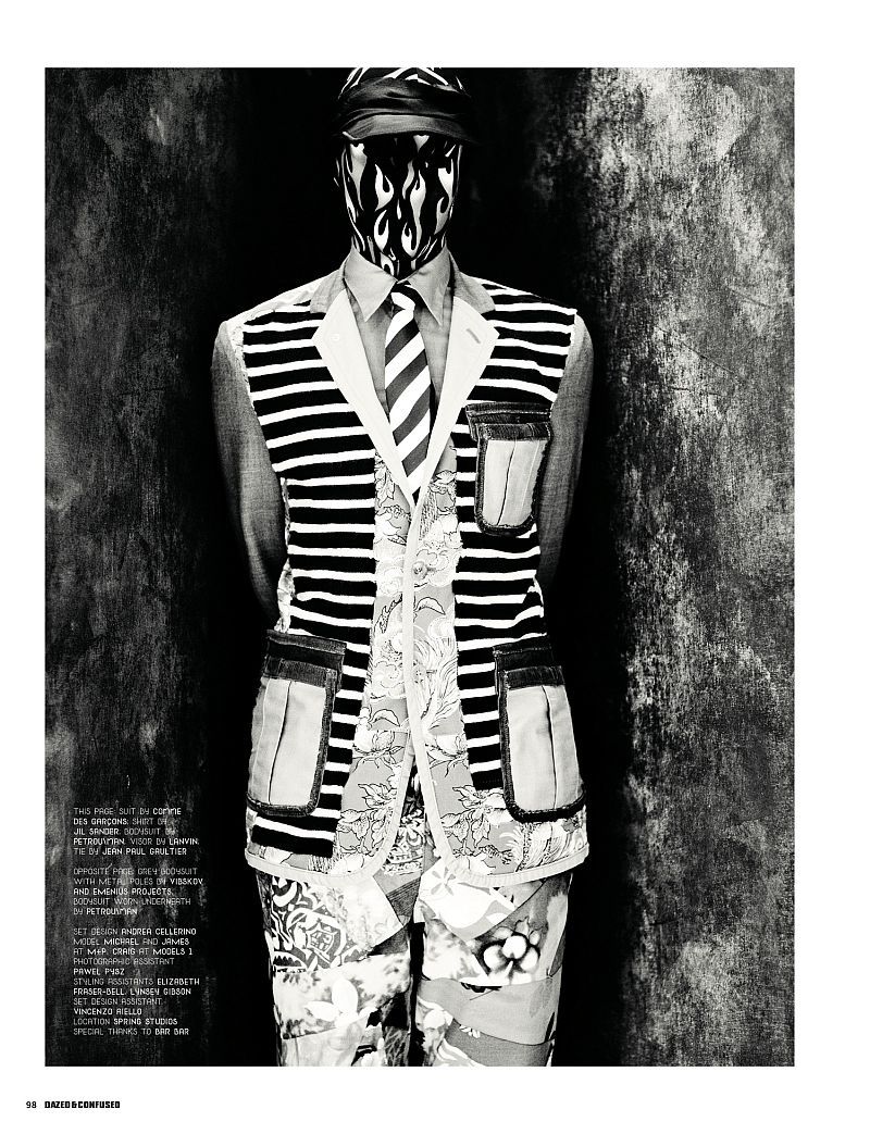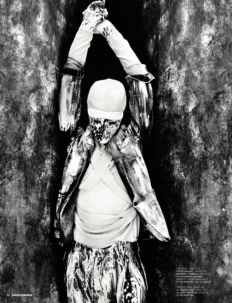 Dazed & Confused fashion editor Robbie Spencer works with PETROUMAN once more, using Petrou’s bodysuits to craft faceless silhouettes for the magazine’s February issue. Photographed by Kacper Kasprzyk, Craig (Models 1), Michael and James (M+P) become anonymous forms to showcase several of spring’s prints from the likes of Kenzo, Prada and Alexander McQueen.