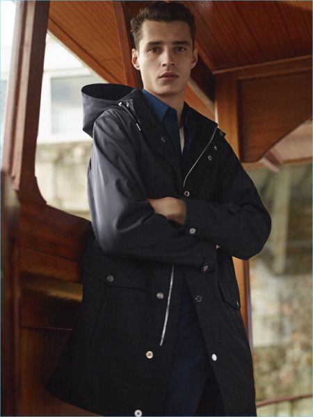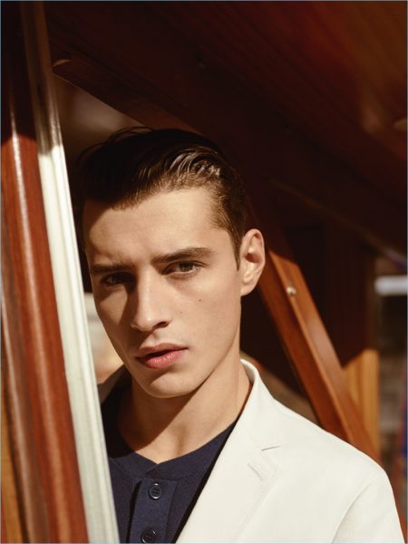 De Fursac delivers a bounty of men’s classics as the label bridges the gap between relaxed style and the impeccably tailored lines of its fine suits. Adrien sports several standouts for the season. Timeless wardrobe pieces range from a long-sleeve striped polo and a vacation ready short-sleeve button-down to an essential trench coat. / Art direction by Atelier Franck Durand.