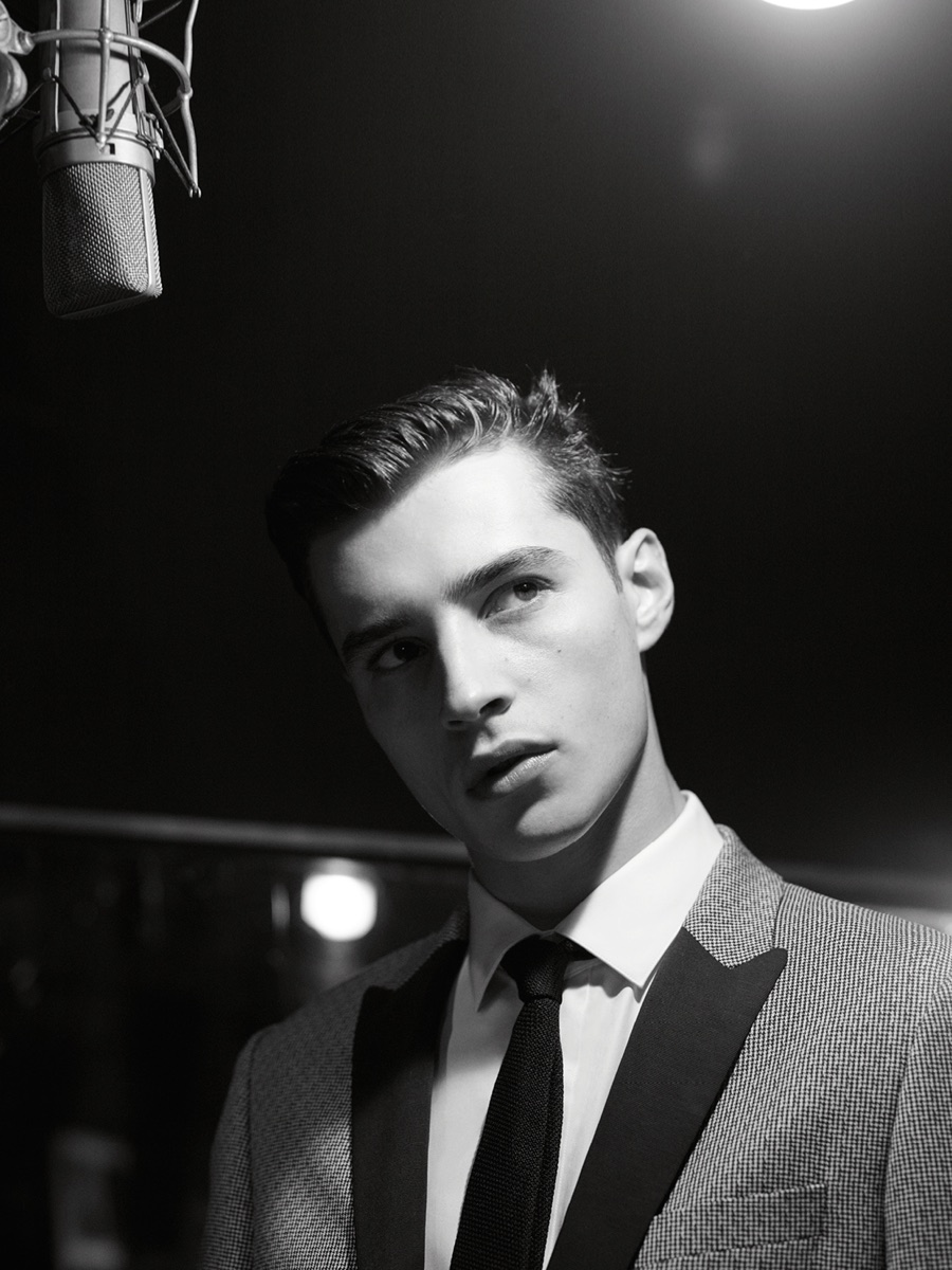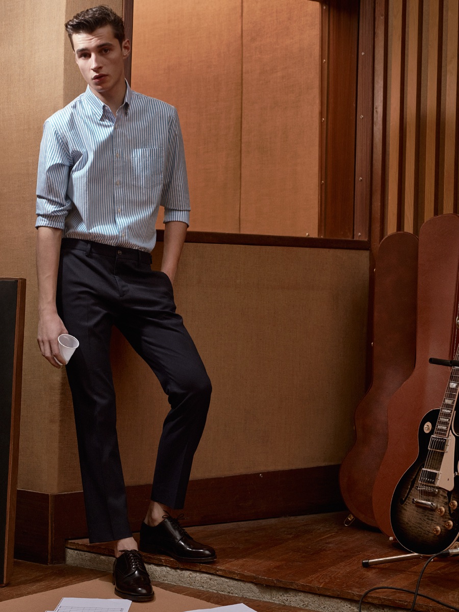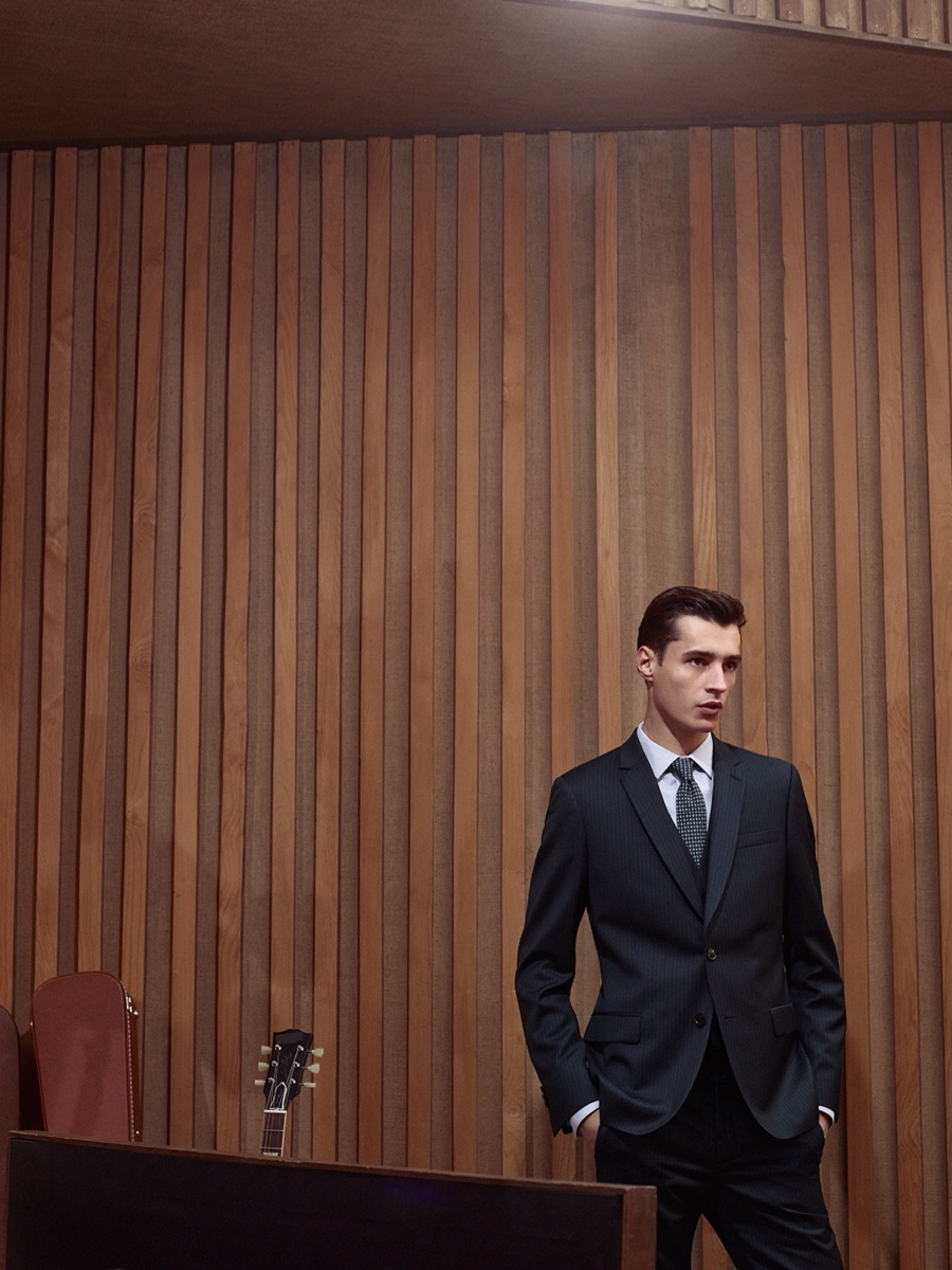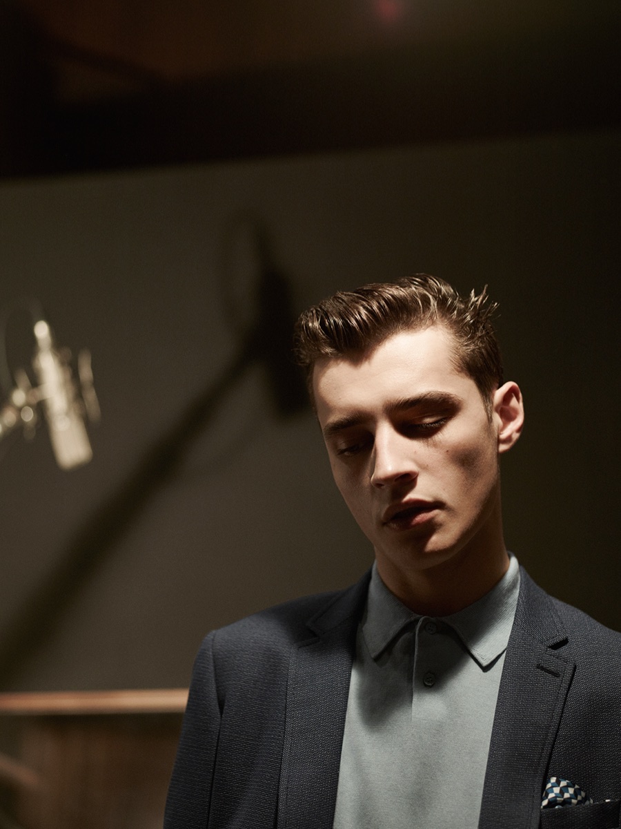 Longtime De Fursac muse Adrien Sahores is back for another season, connecting with photographer Karim Sadli for spring-summer 2016. Charming as usual, Adrien steps into the role of musician. Heading to the studio for a recording session, Adrien calls to mind the image of music legends such as Frank Sinatra and Sammy Davis Jr.