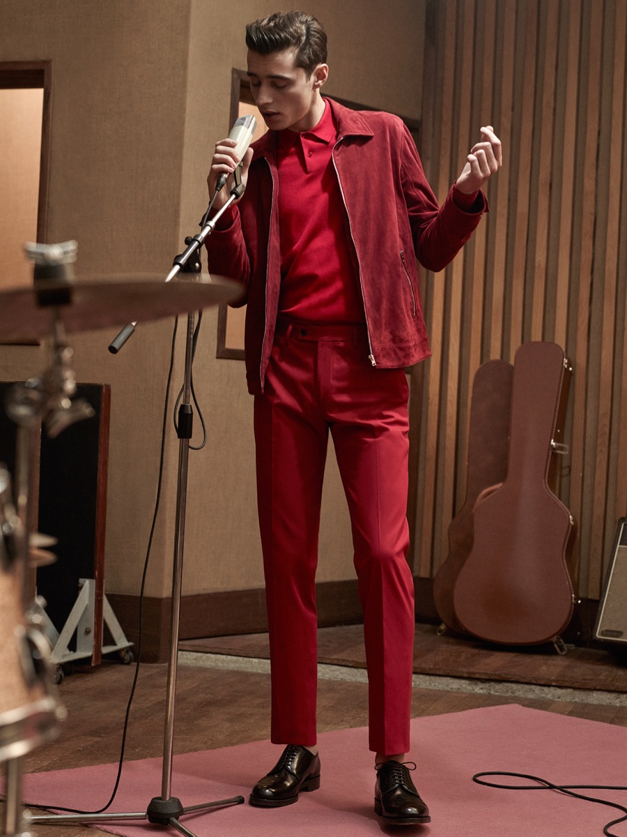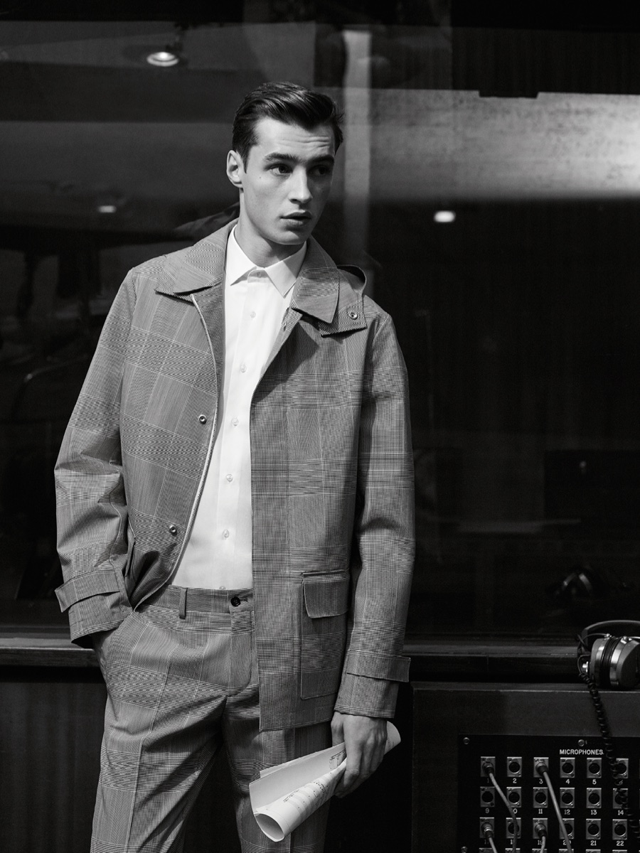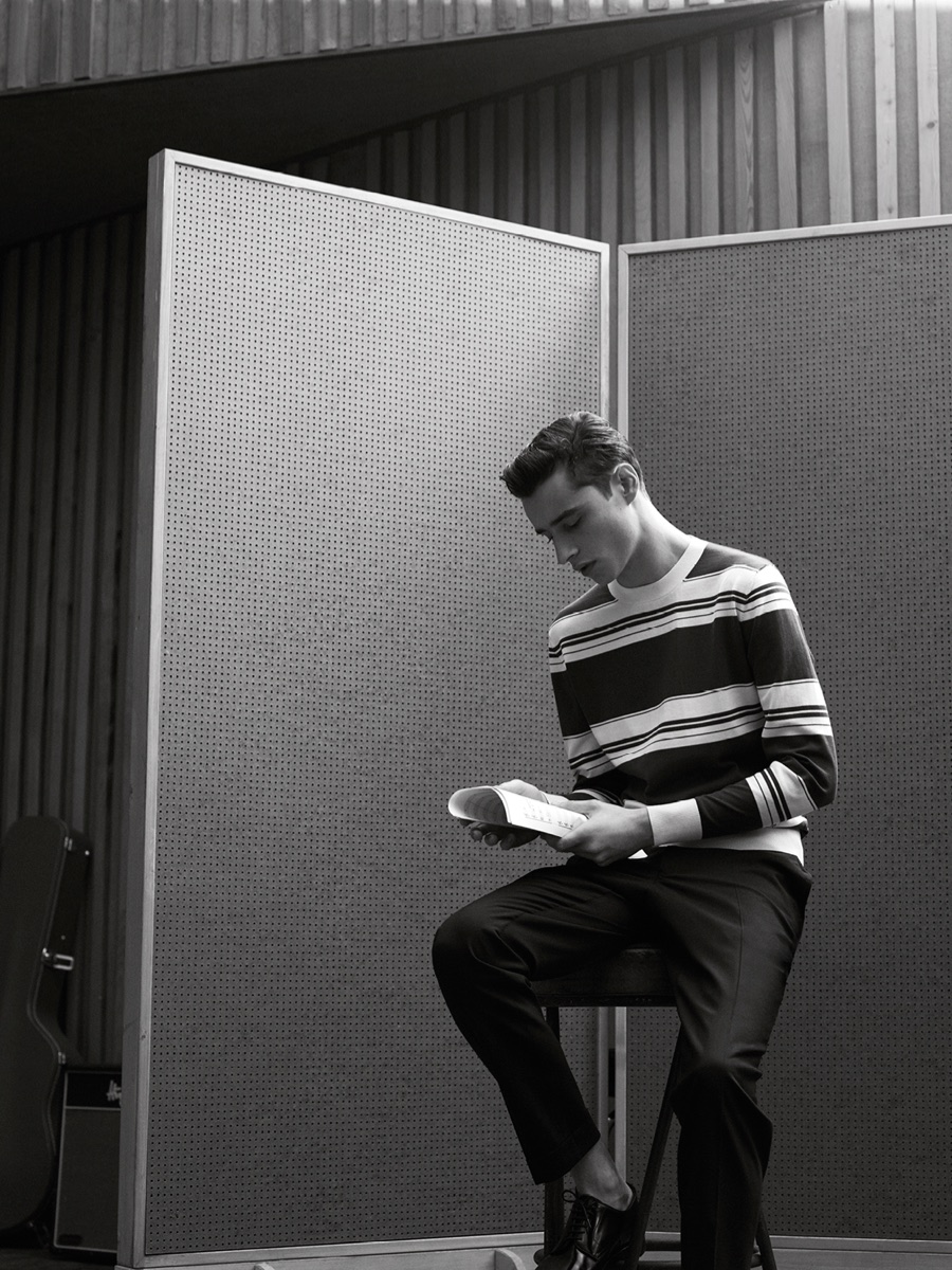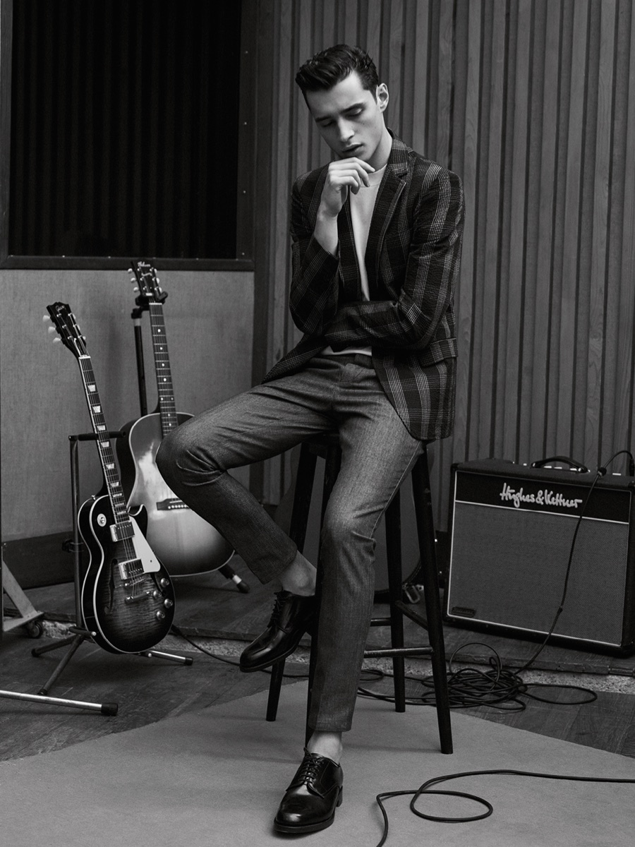 Longtime De Fursac muse Adrien Sahores is back for another season, connecting with photographer Karim Sadli for spring-summer 2016. Charming as usual, Adrien steps into the role of musician. Heading to the studio for a recording session, Adrien calls to mind the image of music legends such as Frank Sinatra and Sammy Davis Jr.