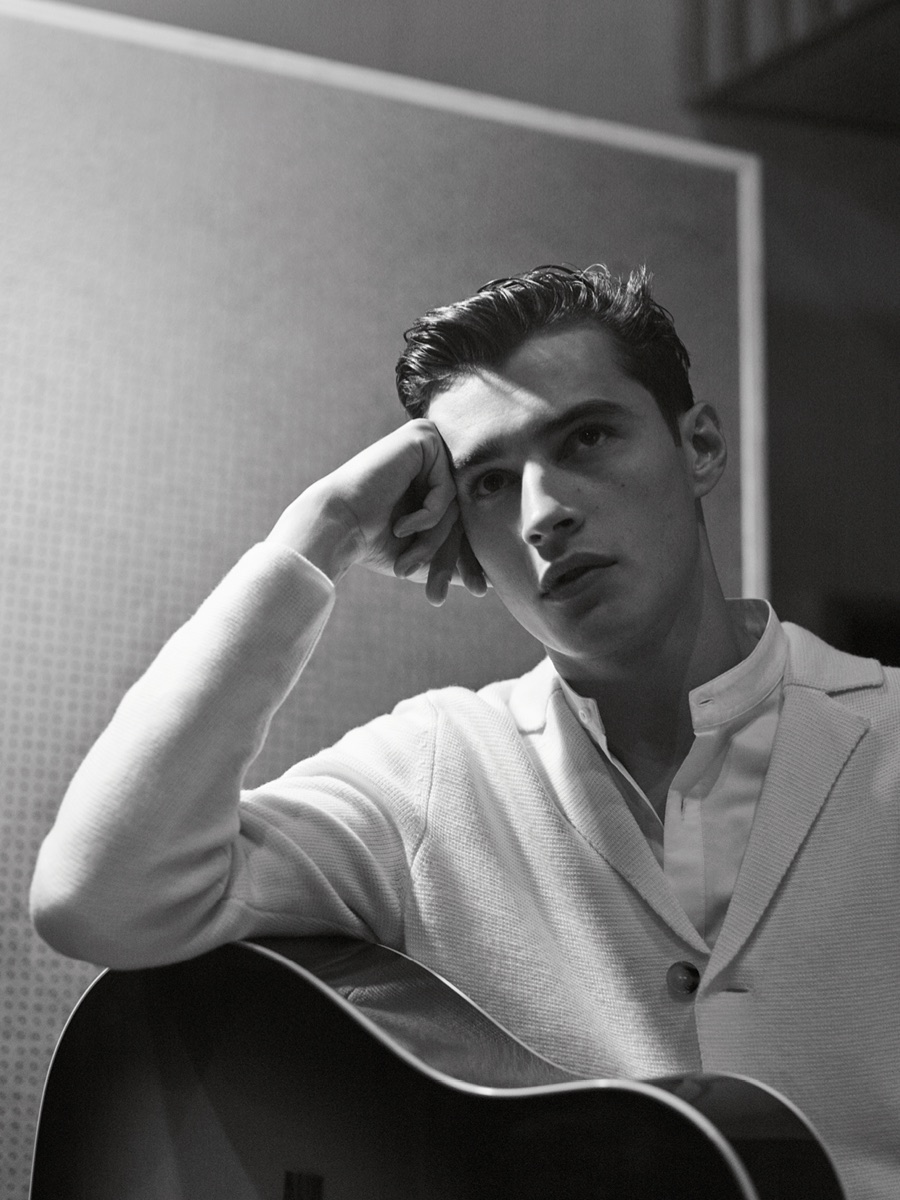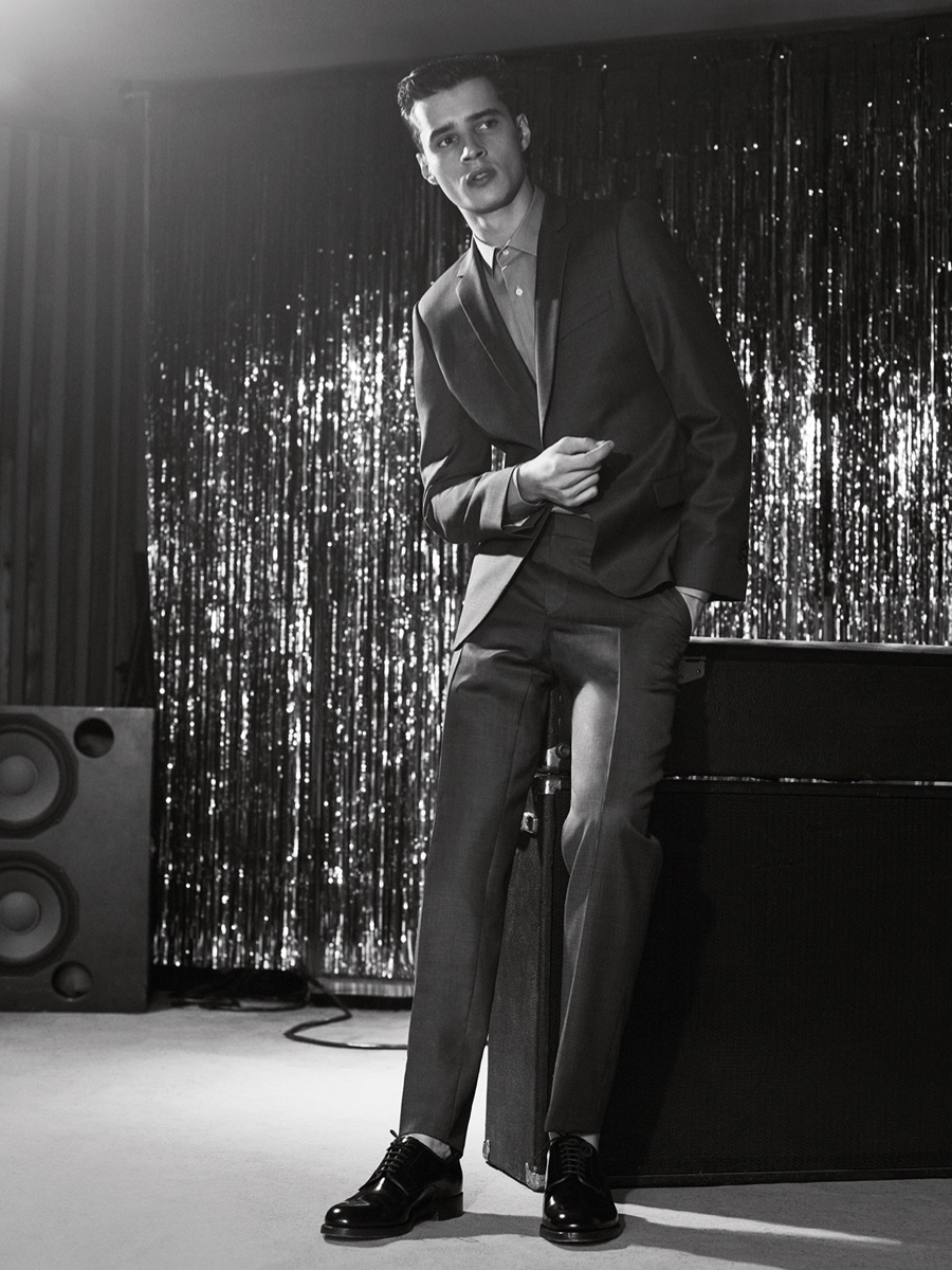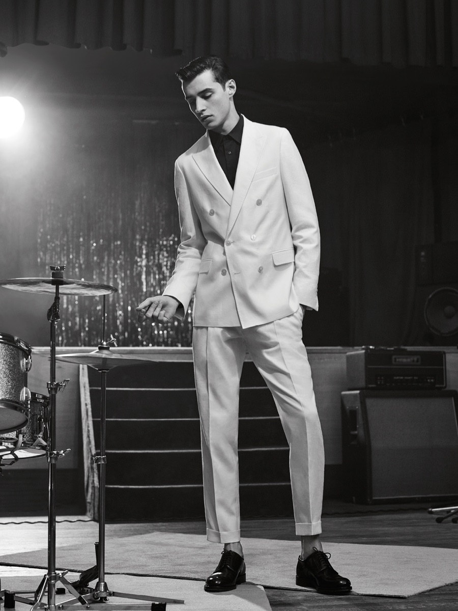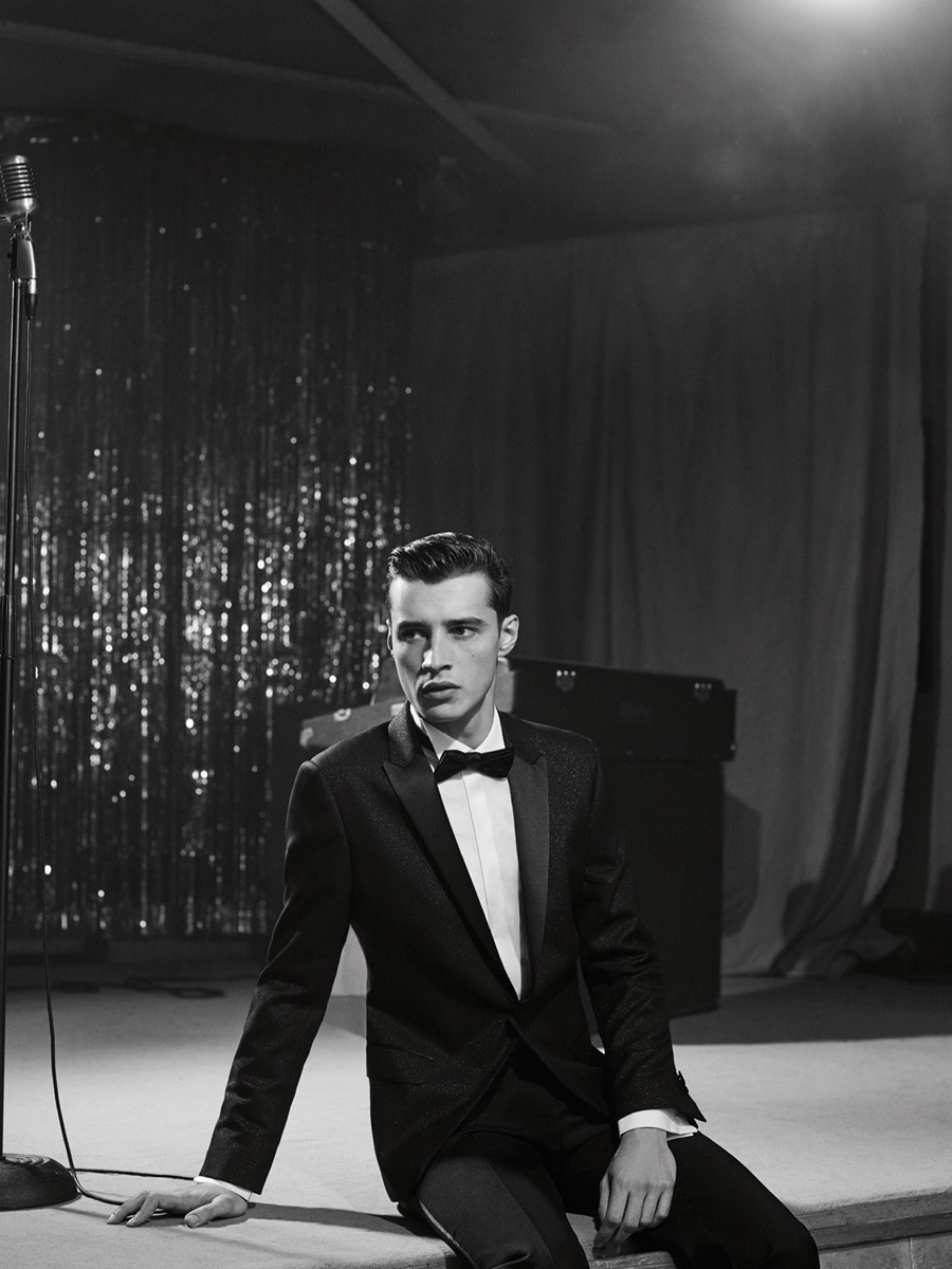 Longtime De Fursac muse Adrien Sahores is back for another season, connecting with photographer Karim Sadli for spring-summer 2016. Charming as usual, Adrien steps into the role of musician. Heading to the studio for a recording session, Adrien calls to mind the image of music legends such as Frank Sinatra and Sammy Davis Jr.
