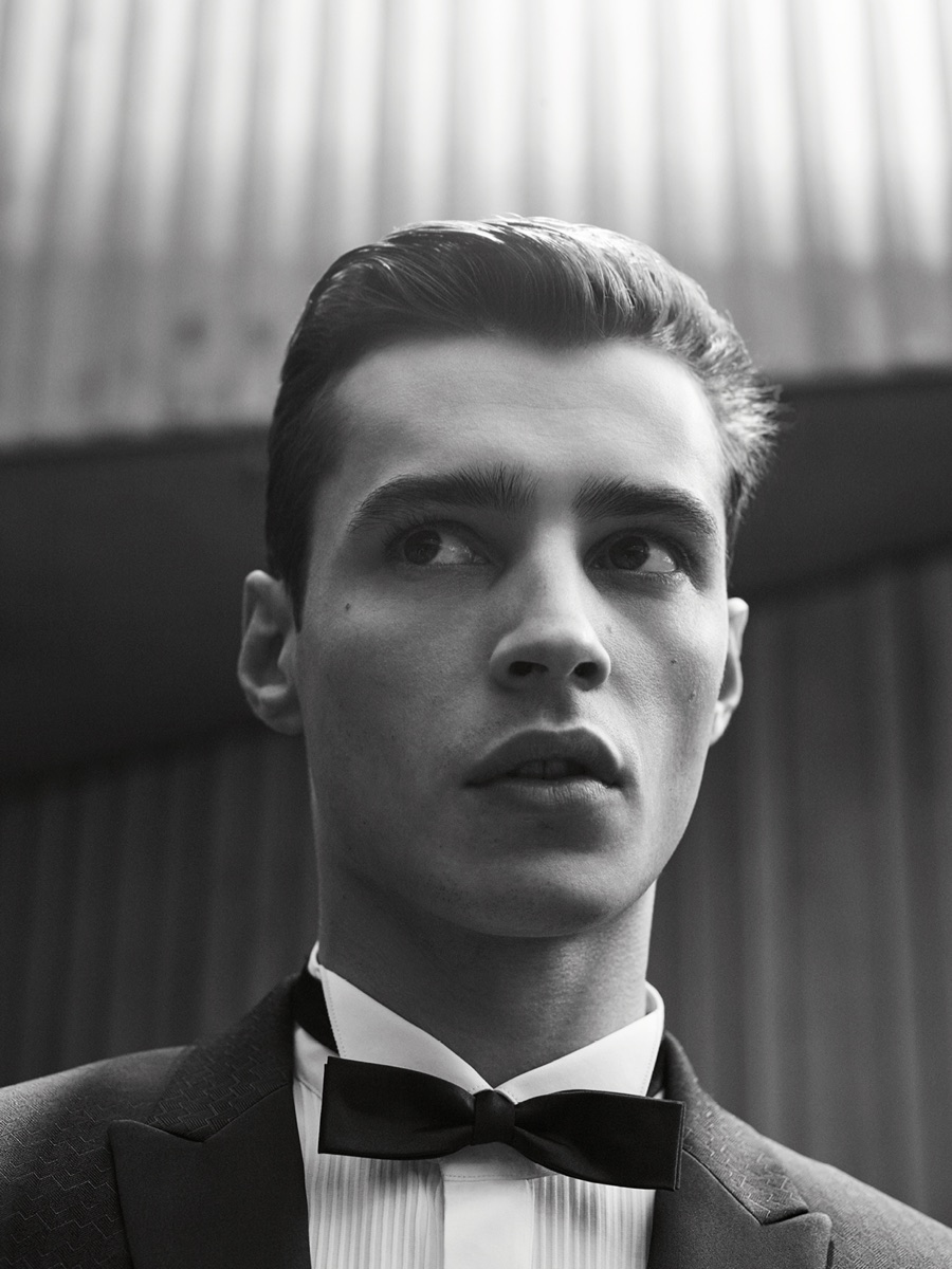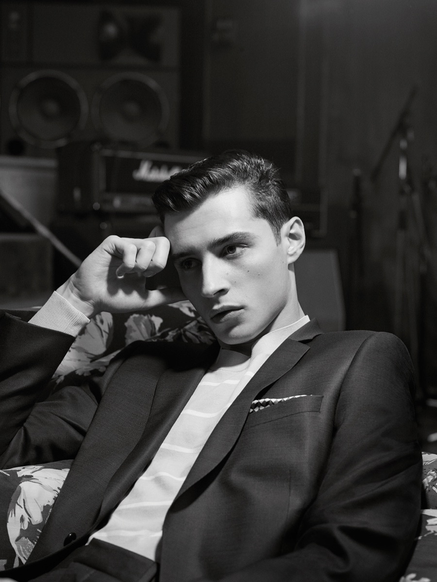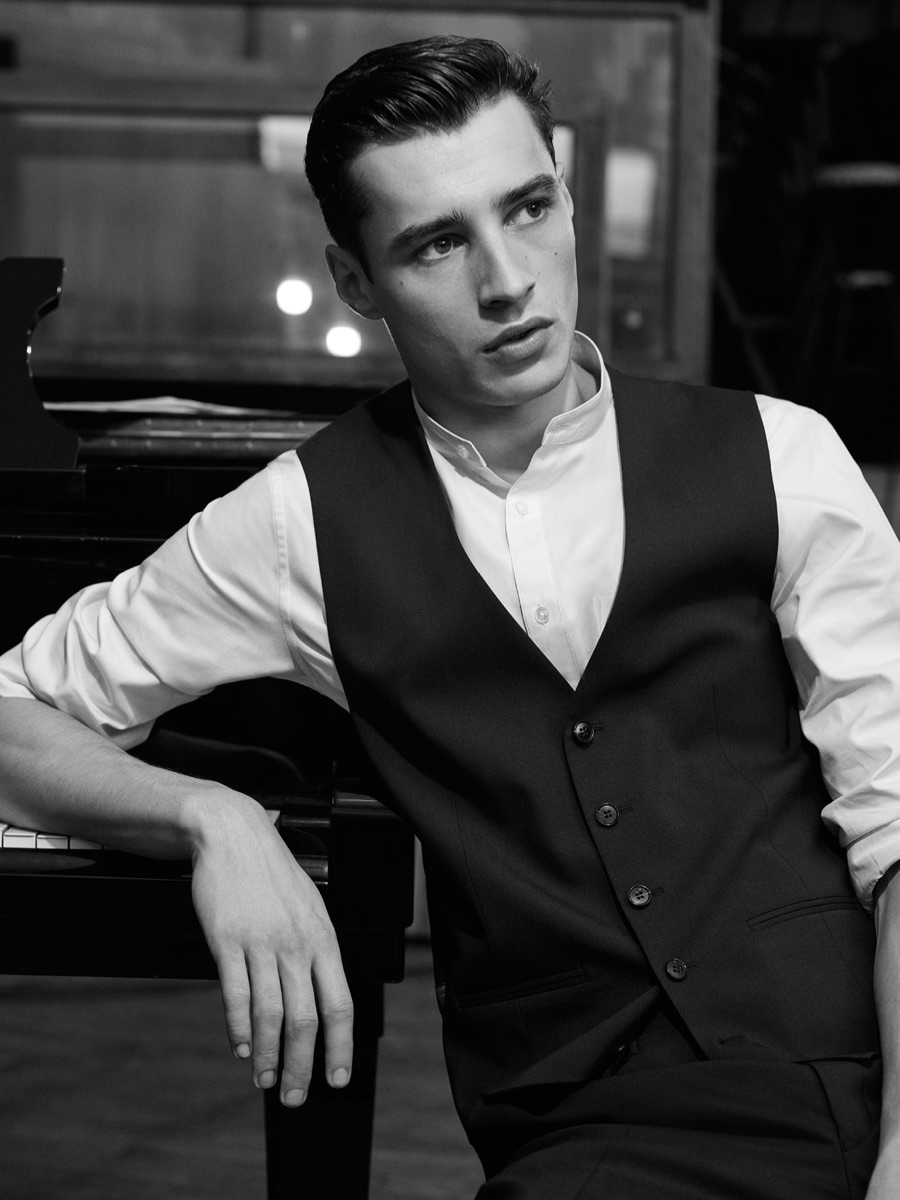 Showcasing De Fursac’s sleek approach to menswear, Adrien is quite the inspiring vision in slim-fit sportswear that includes polo shirts, suede jackets and pleated chinos. The leading French model also shows off the Parisian brand’s expert suiting.