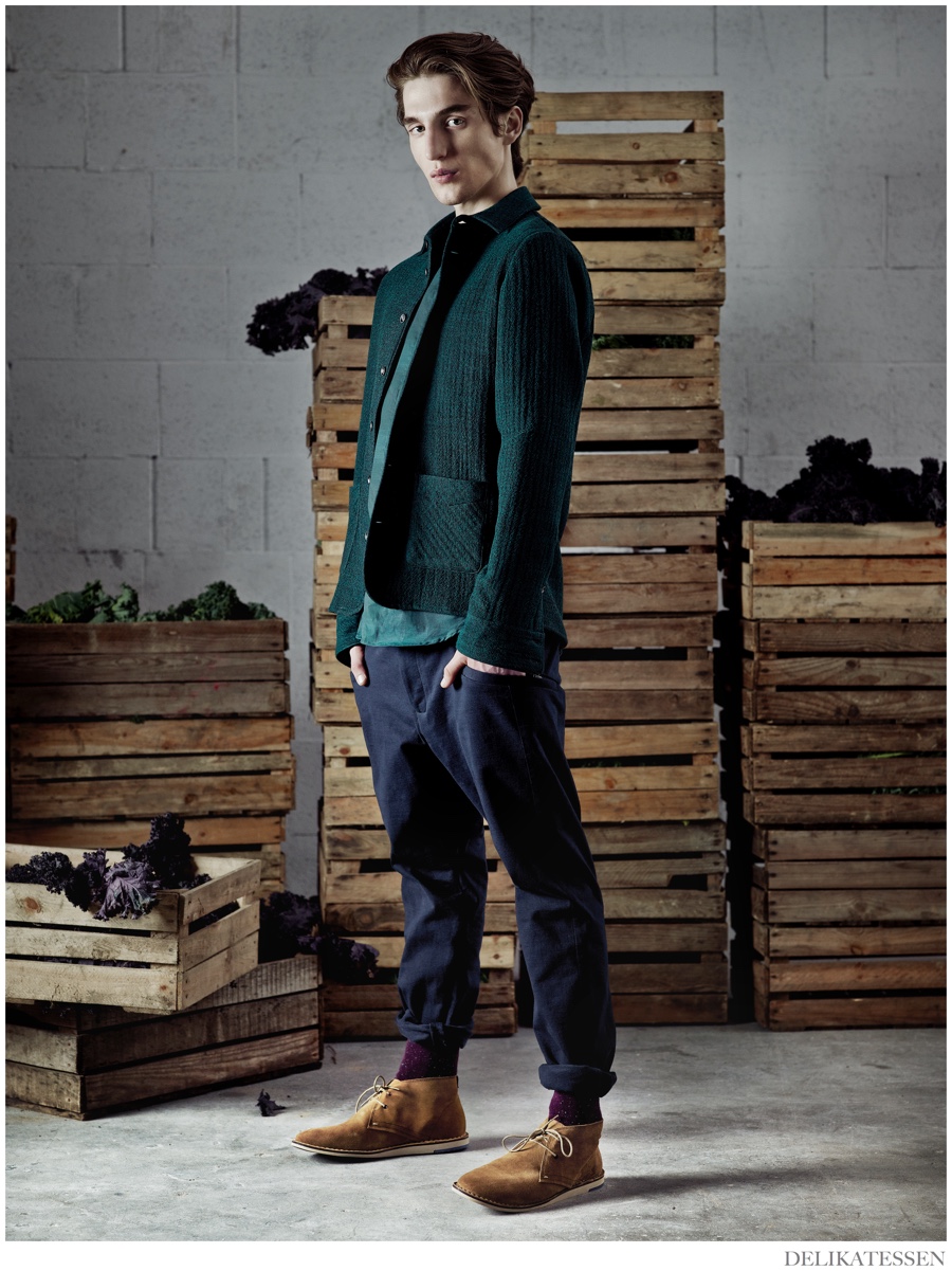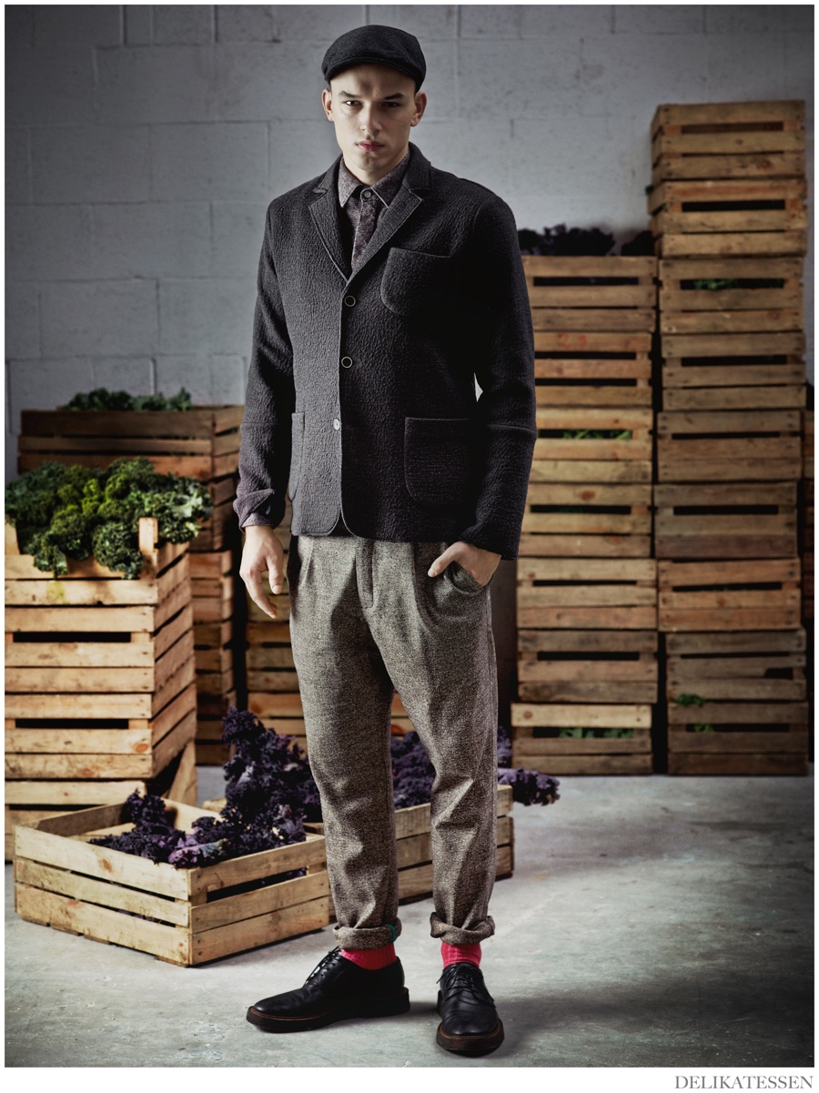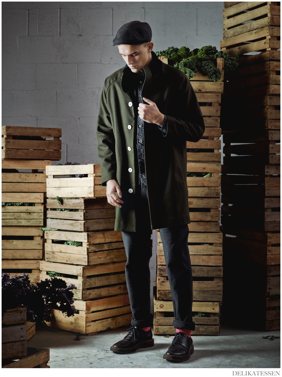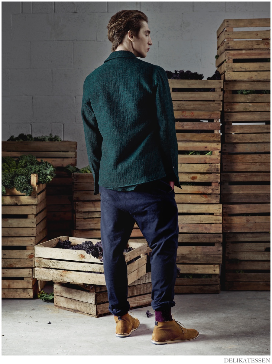 Delikatessen Fall/Winter 2014-Fashion brand Delikatessen delivers an earthy fall outing with its latest collection, which was inspired by harvest season. Delikatessen designers Andre Lisowski and Stephen Hartog add a personal touch to the range, thinking of their own garden in Burgundy, France when dressing many of the collection’s separates in leafy greens that reflect kale. Looking to turn out an honest range, timeless separates come together with relaxed silhouettes for effortless looks made from cottons, wools, silks, vintage chambrays and more.