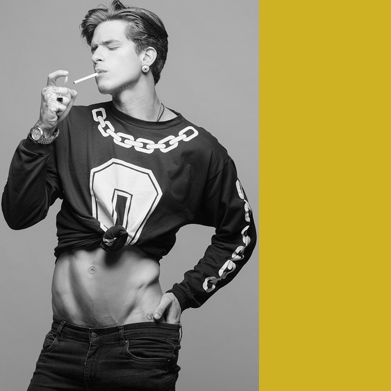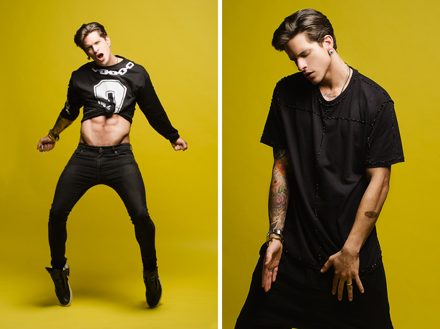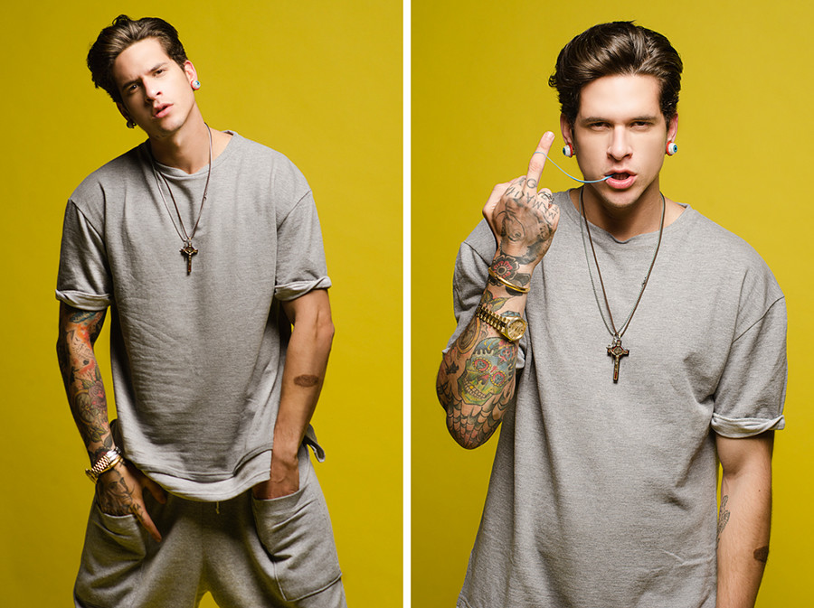 Diego wears t-shirt Zara, leggings Topman, shorts Jeremy Scott for Adidas, sneakers Rick Owens and necklace VERDE.