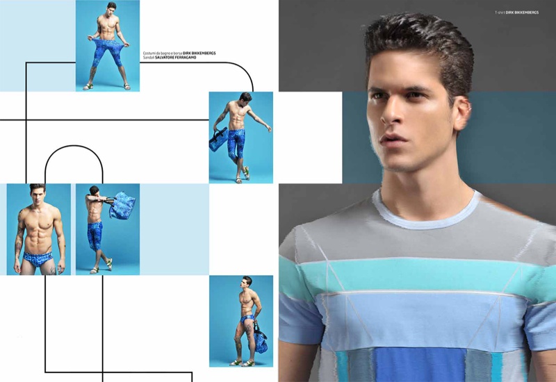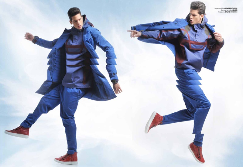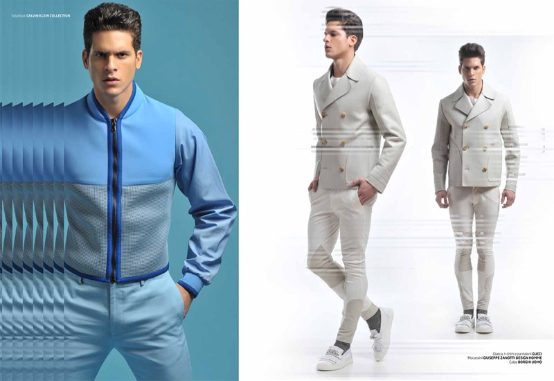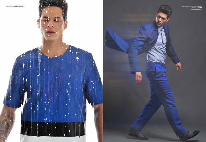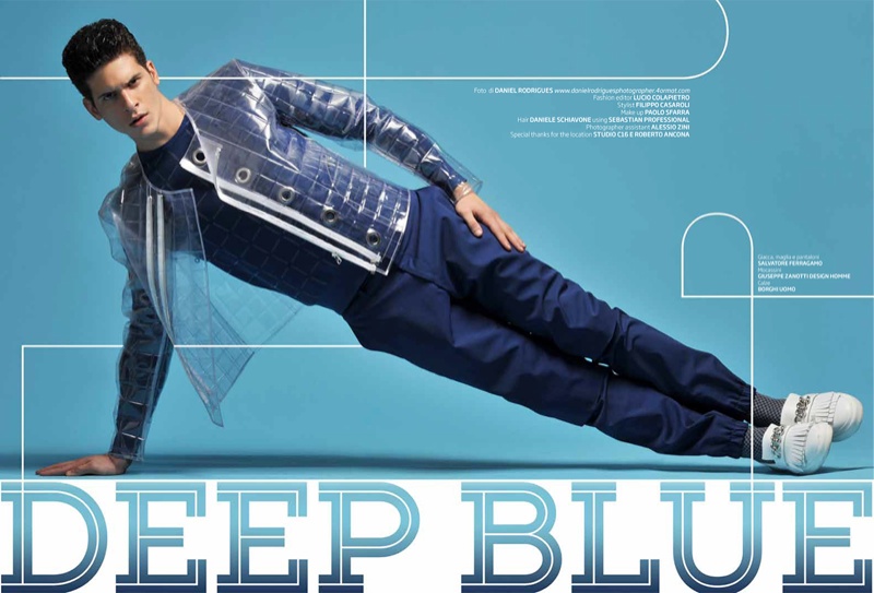 Blue Fashion Trend–Starring in an editorial entitled Deep Blue, model Diego Fragoso connects with photographer Daniel Rodrigues for a shoot in Maxim Italia. Embracing a blue fashion trend for spring, Diego is outfitted in the cool color by stylist Filippo Casaroli. / Makeup by Paolo Sfarra. Hair by Daniele Schiavone. Photo assistance by Alessio Zini.