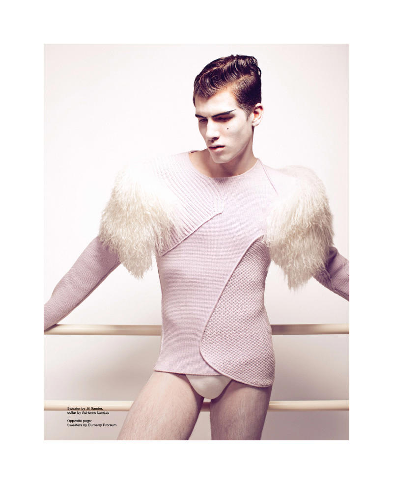 Wilhelmina models Diego Miguel and Adrian Cardoso get their toes in check for a DaMan story photographed by Greg Broom. Inspired by Swan Lake, Diego takes the lead, relying on a dancing background as the intriguing duo model shearling pieces styled by Micah Johnson.
