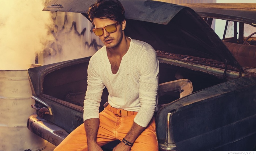 Colored Denim Focus-Brazilian label Acostamento creates a relaxed summer image for its latest advertising campaign. Colored denim jeans in red, orange and yellow are the focus as model Diego Miguel (Sight Management) puts on Acostamento’s slim styles. Pairing the trendy colored jeans with simple tops, Diego is photographed by Jacques Dequeker, posing near an old car and storage units.