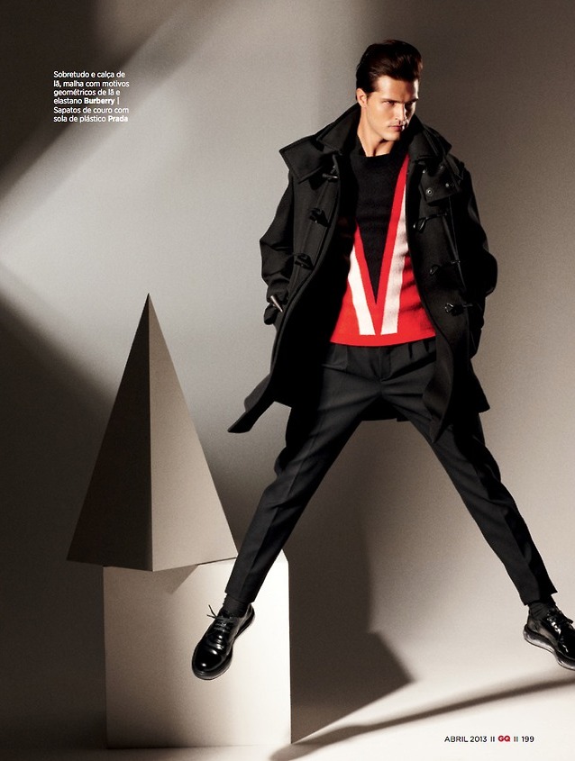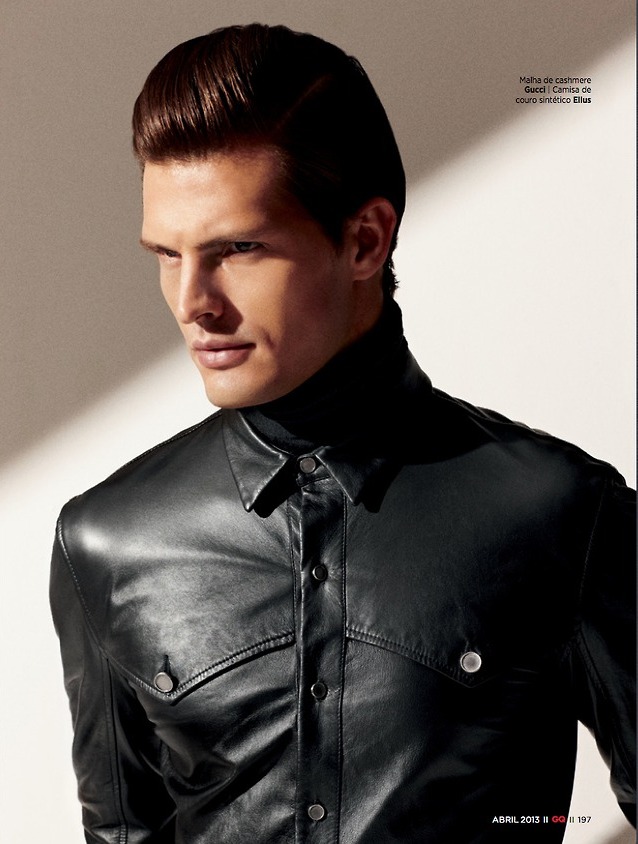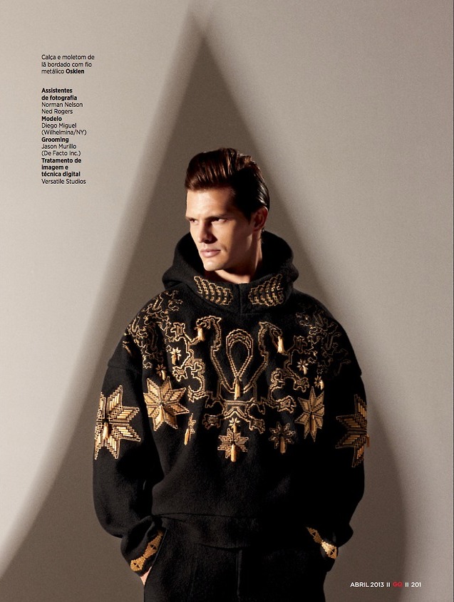 Man In Black–Photographed by Arnaldo Anaya-Lucca, Brazilian model Diego Miguel appears in a spread published in the latest issue of GQ Brasil. Posing in a studio in New York City, the Wilhelmina model sports a selection of urban black designs, assembled for the occasion by stylist Antonio Branco. Dressed in pieces that come straight from the spring collections of prestigious labels, including Givenchy, Prada, Gucci and others, Diego stuns in strict black leather numbers, structured outerwear pieces and quilted jackets. / Photography assistance by Norman Nelson and Ned Rogers. Grooming by Jason Murillo.
