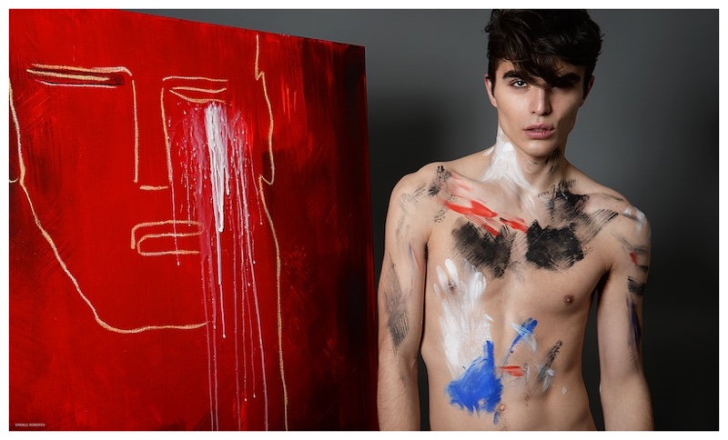 A shirtless Diego Villarreal becomes the blank canvas.Pin