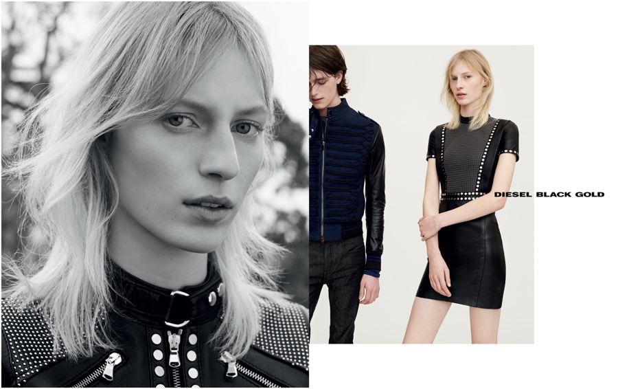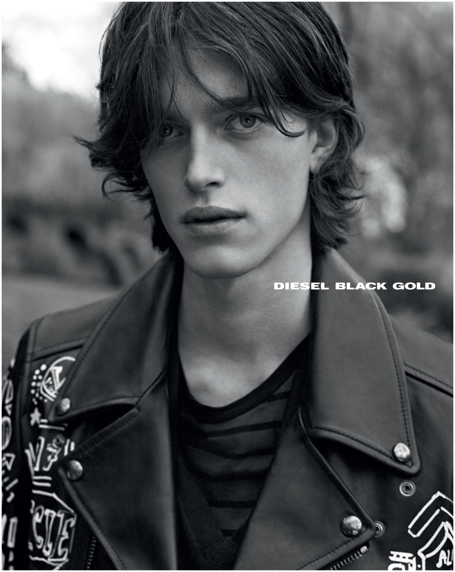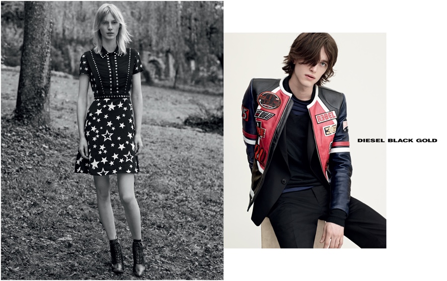 Diesel calls on French fashion photographer Karim Sadli to shoot its spring-summer 2015 advertising campaign starring models Reuben Ramacher and Julia Nobis. Discussing Sadli’s work, Diesel Black Gold creative director Andres Melbostad shares, “Karim Sadli has perfectly represented the Diesel Black Gold Spring ’15 attitude embodied by Julia and Reuben. I love the earnest and direct mood of the images.” Bringing a certain edge to the outing, Reuben’s motocross-inspired wardrobe features graphics that were applied to leather jackets using white on white graffiti. / Makeup by Christelle Cocquet. Hair by Damien Boissinot.