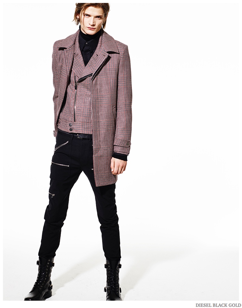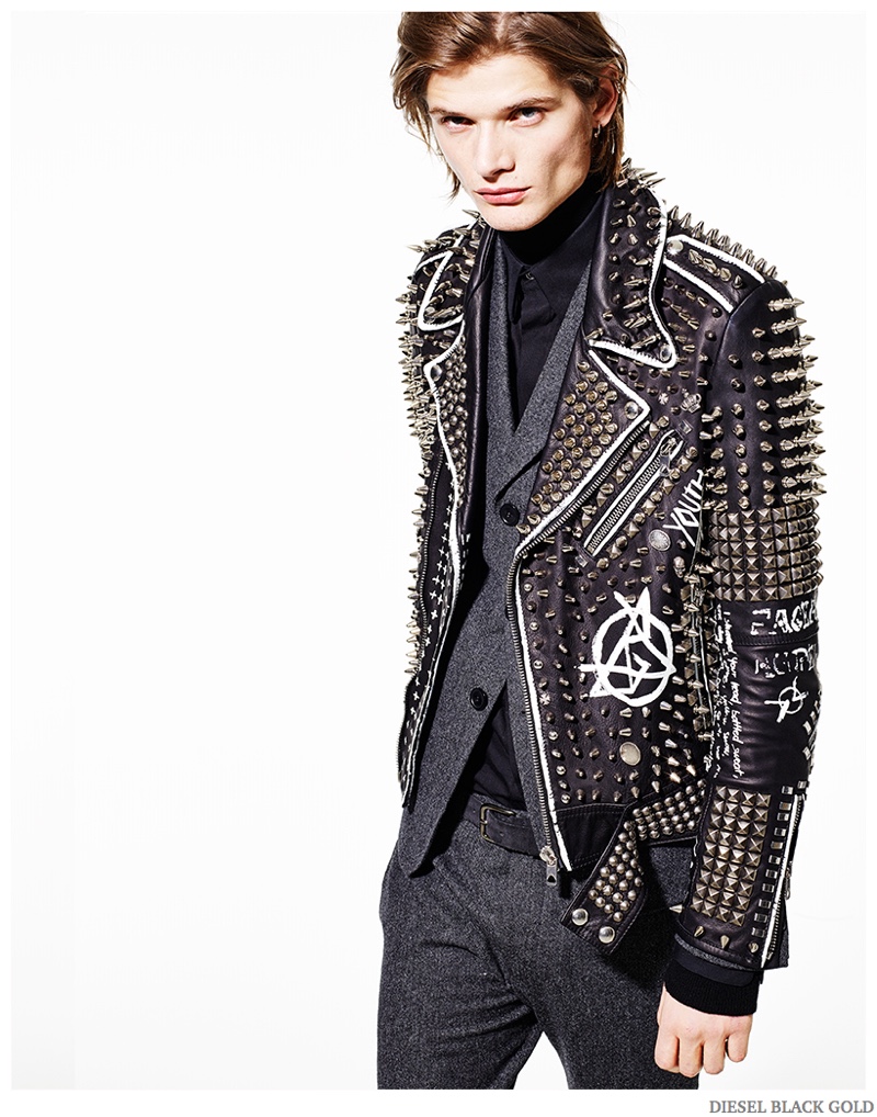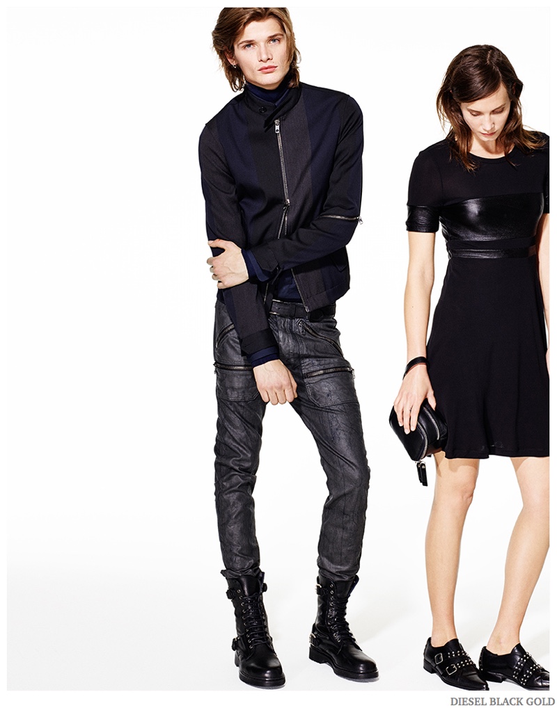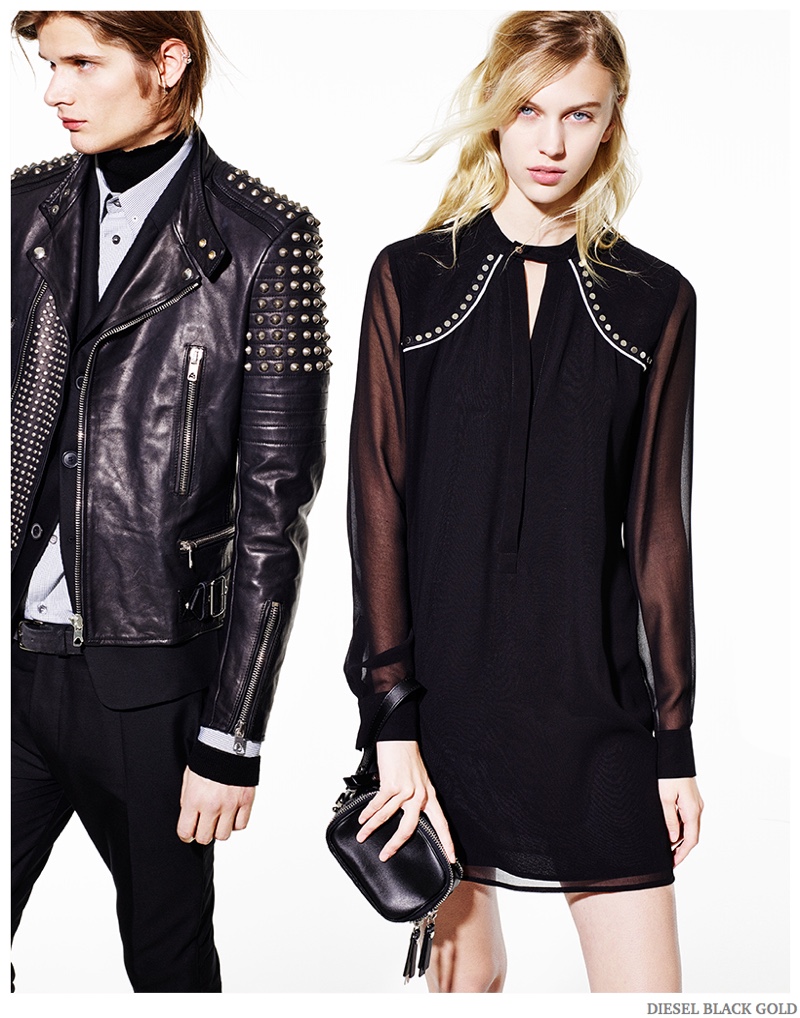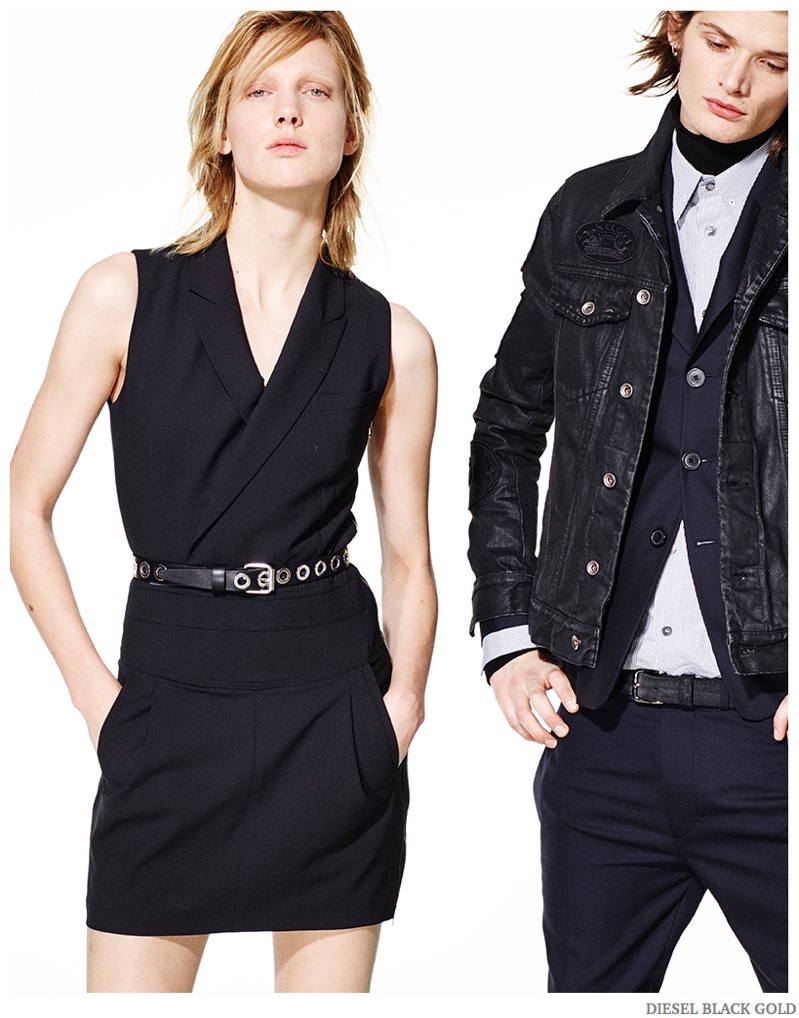 Diesel Pre-Fall 2015 Collection–Diesel Black Gold unveils a look at its upcoming pre-fall 2014 collection. Photographed by Kevin Sinclair, models Annely Bouma, Drake Burnette, Haarvard Keleppe and Juliana Schurig hit the photo studio. Clad in dark hues, Diesel Black Gold’s latest outing revolves around a rocker cool. Slim-cut leather pants join denim jackets, studded leather outerwear pieces and traditional suits revisited with a rebellious attitude. / Creative direction by Andreas Melbostad. Hair by Rutger Van. Makeup by Sil Bruinsma.