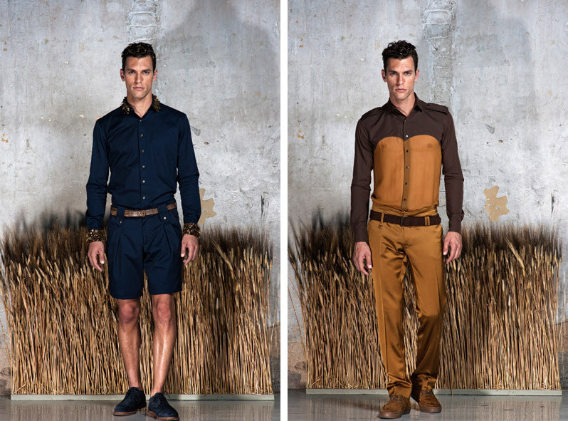 Draped with Love–Toting the perfect color palette to transition into the fall season, Dimitris Petrou’s spring/summer 2011 collection takes draping to an earthy place in hues of brown and navy. Juxtaposed with the imagery of a summer wheat field, silk, linen and other fine fabrics come together for an easy showing of contemporary classics taken in a stylized direction–shifting proportions and shapes for a new look. From the leather t-shirt to the incorporation of scarf detailing, Petrou creates a fun collection with luxe tendencies.