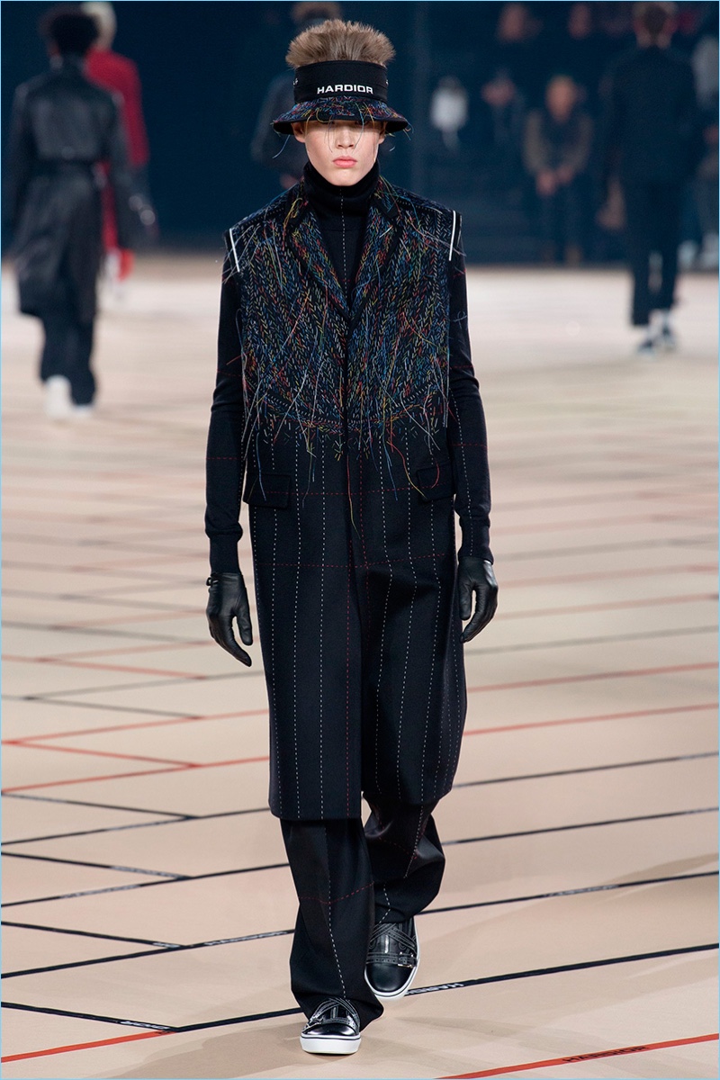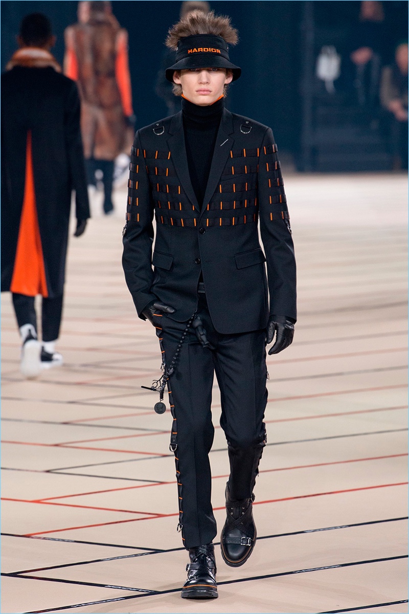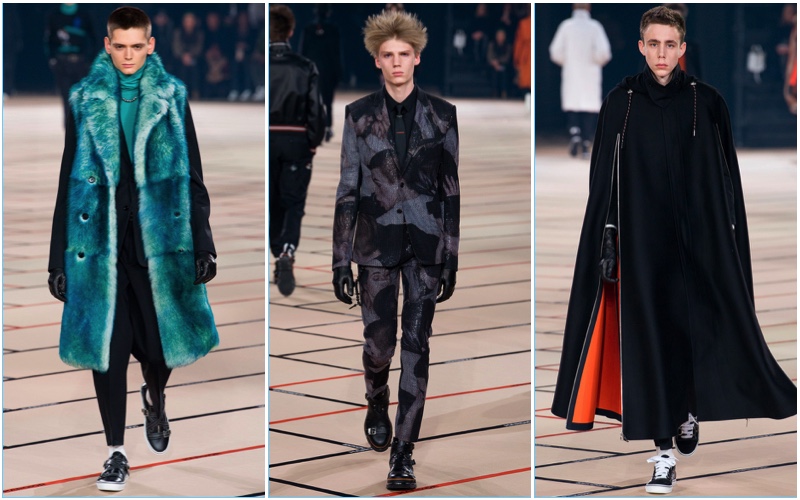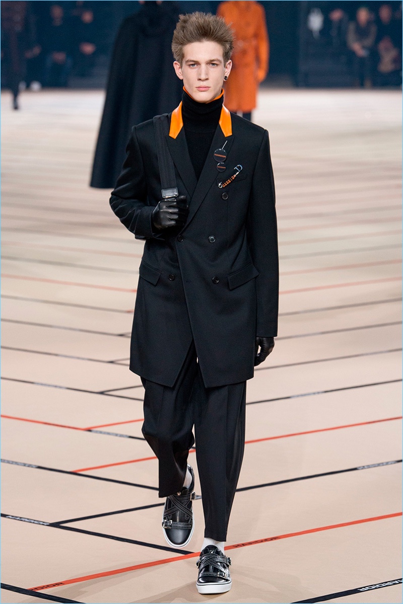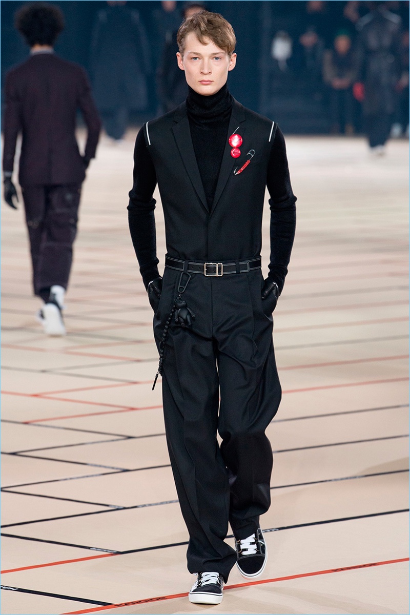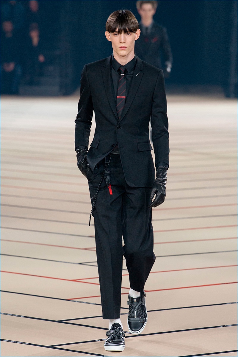Belgian designer Kris Van Assche continues to play a youthful hand at Dior Homme with the brand’s fall-winter 2017 collection. The new range captures a tailored take on teenage days and rave parties. Here, Van Assche employs a lineup of black fashions with sporadic pops of color.