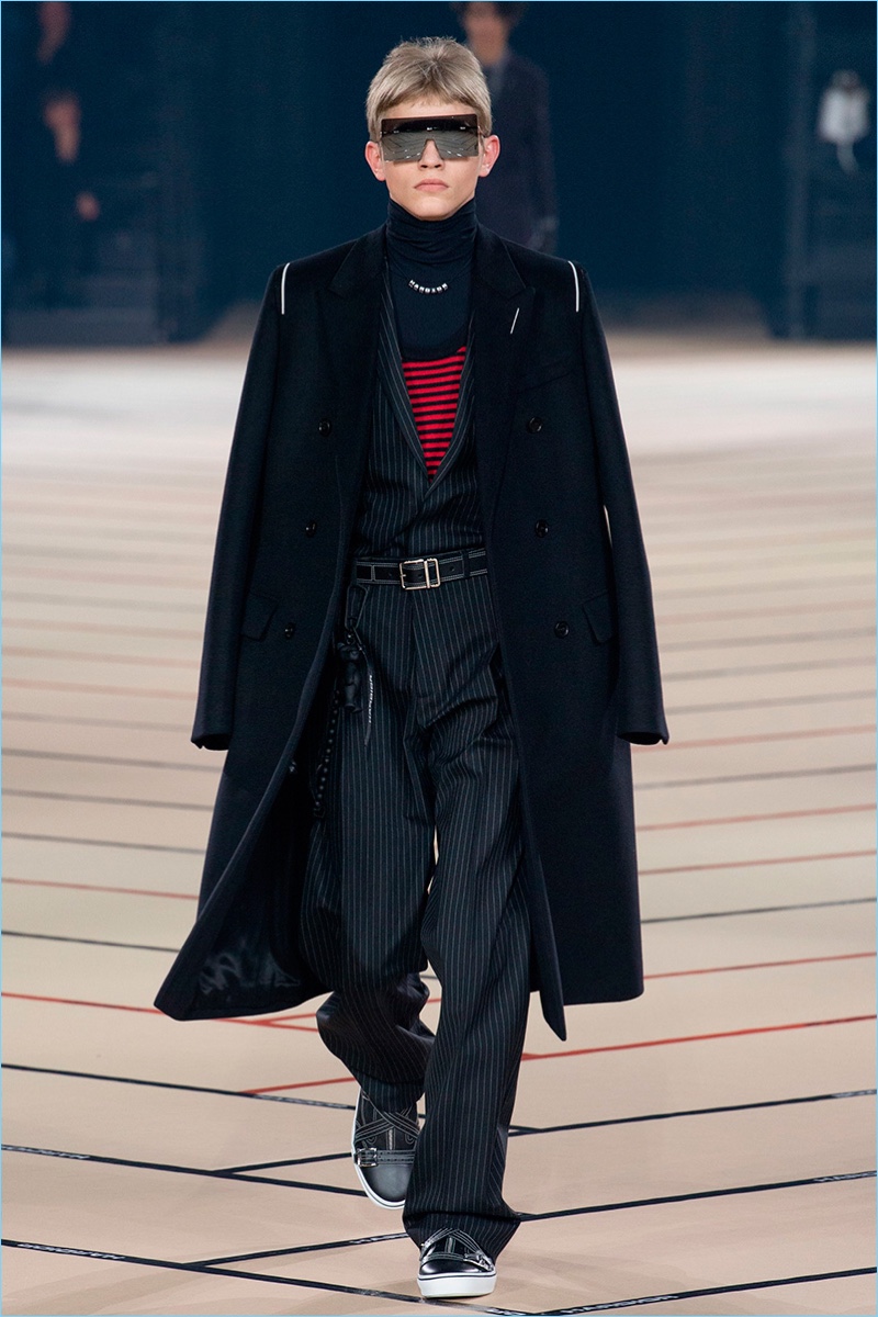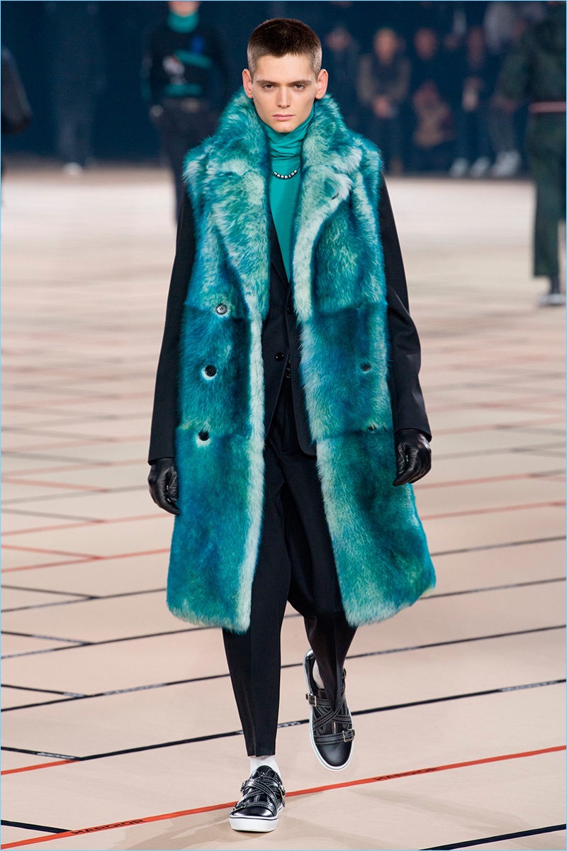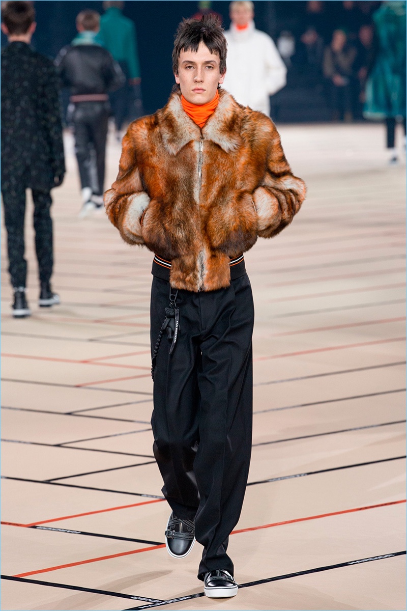 Pinstripe suits give way to splashes of black and red stripes, juxtaposed with safety pins and key rings. Baggy trousers and skate-style sneakers add to the season’s youthful progression. Marrying a young narrative with the luxury of Dior, Van Assche offers contemporary staples such as the bomber jacket in leather. Colored fur and rave graphics also contribute to the outing.