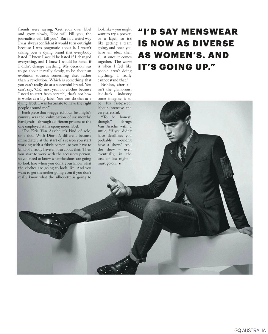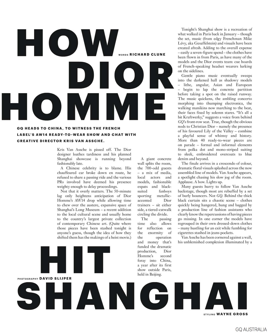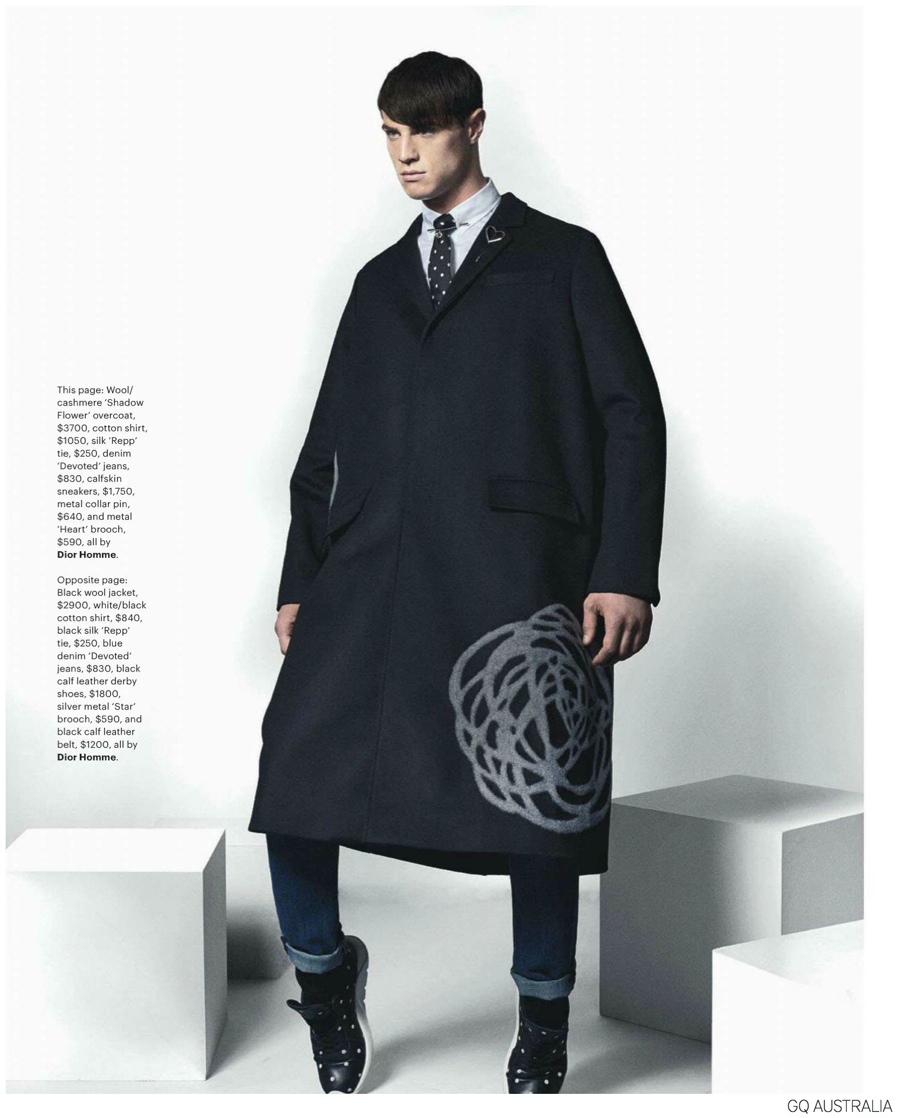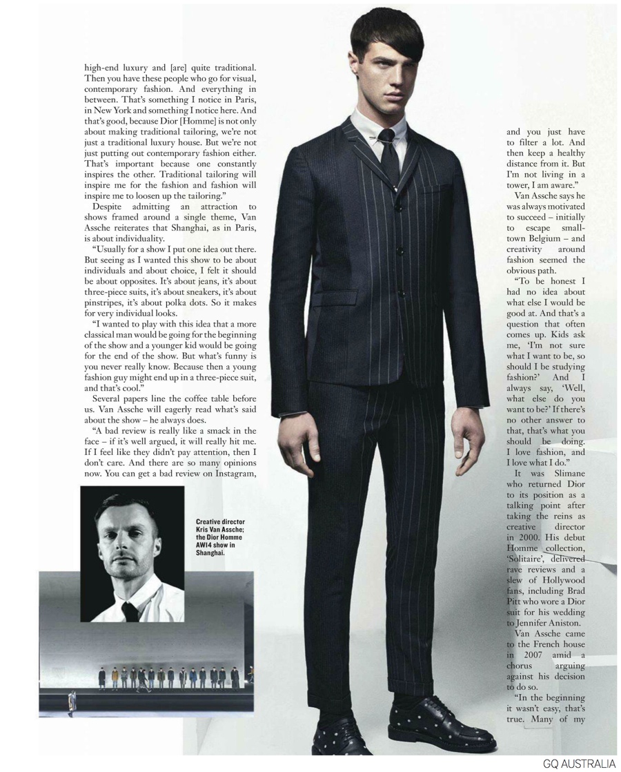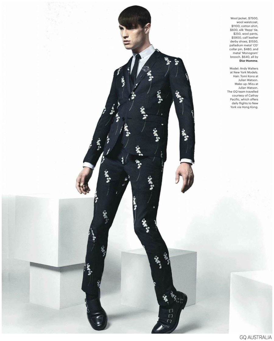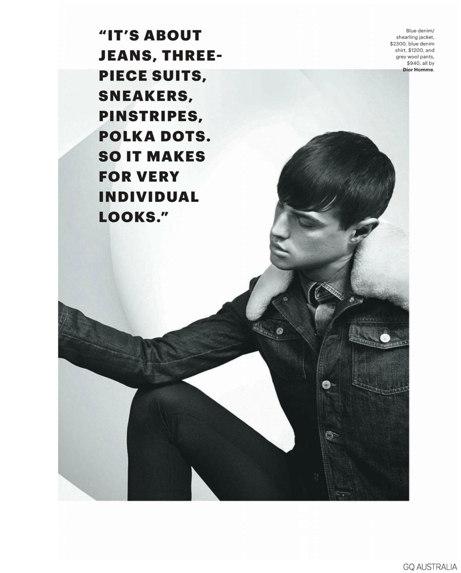 Tailoring & Polka Dots–GQ Australia highlights Kris Van Assche’s fall 2014 collection for Dior Homme in its September/October 2014 issue. The designer’s penchant for smart tailoring with charming details is on display as model Andy Walters is styled by fashion editor Wayne Gross. Captured in a clean white photo studio by photographer David Slijper, Andy is a dapper vision in pinstripe and polka dot suiting, contrasted against contemporary denim ensembles.