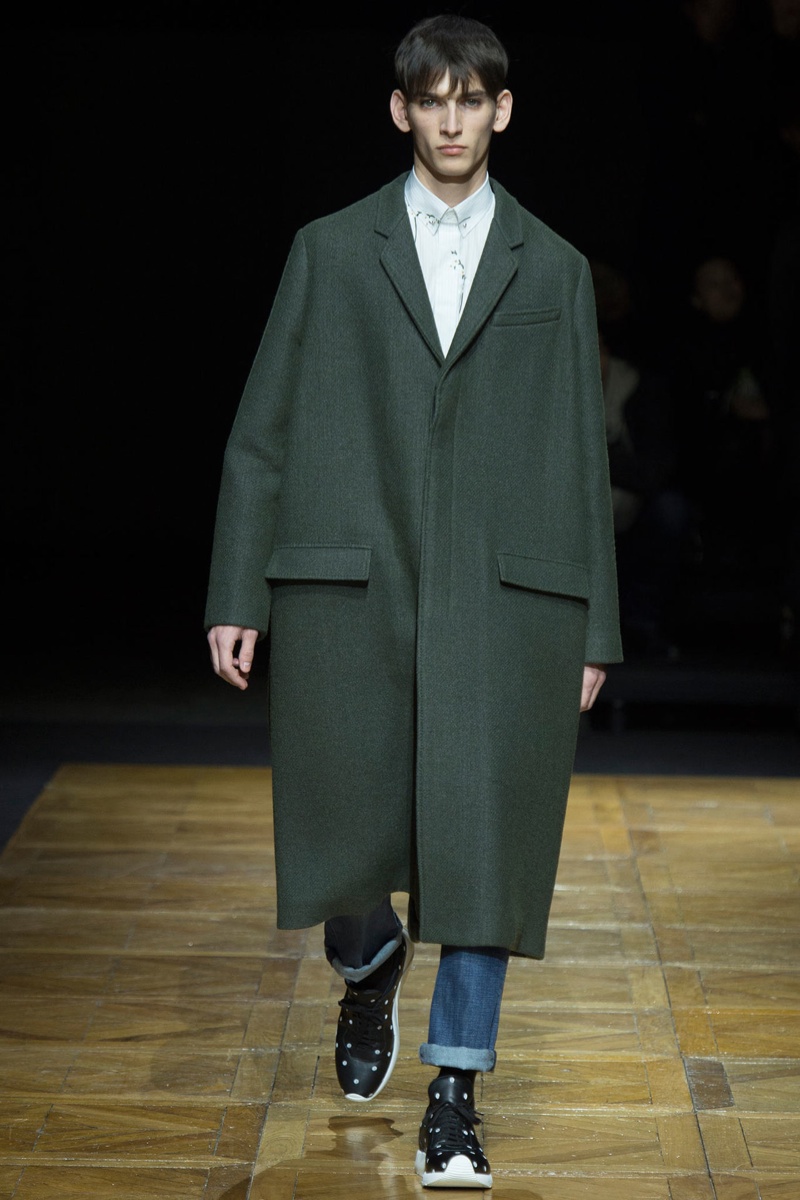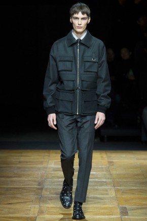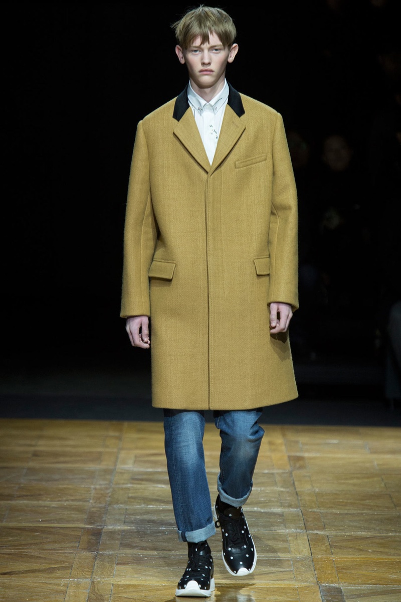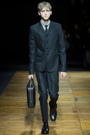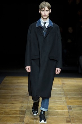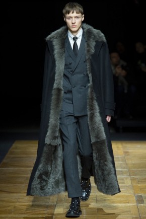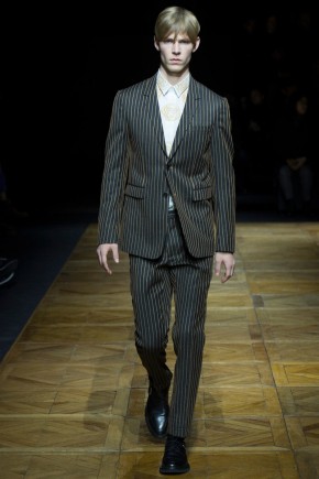 Dior Homme Fall/Winter 2014–Manipulating a formal attitude for the man who knows how to dress to the nines, but also values confident casual essentials, Dior Homme creative director Kris Van Assche sent a well-rounded fall/winter 2014 collection down the runway. With sprigs of Lily of the Valley worn in suit pockets, later to become a significant graphic, pinstripes dressed the season’s initial tailored selection, transitioning into a fun divergence of polka dots. Introducing fur in the form of outerwear, a luxe element was upset by the use of denim, reinterpreting classic items such as the duffle coat. Mixing in more casual garments such as a field jacket or distressed sweatshirt, Van Assche cemented a smart collection.