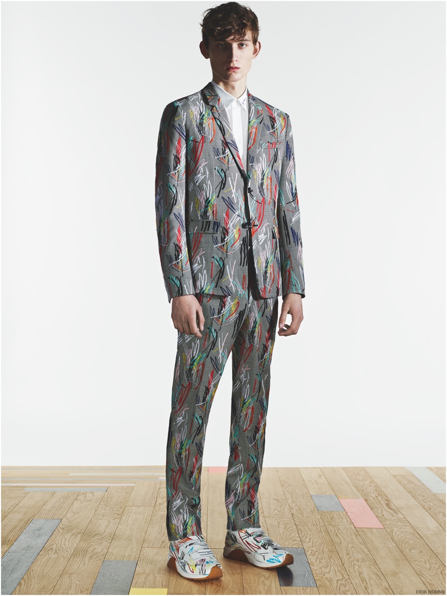 In Between Visions–Dior Homme creative director Kris Van Assche embraces the all-over print for spring as a way to inject instant modernity into timeless styles such as the two-button suit. Colorful in nature, the explosive print makes its presence known, covering everything from the denim jacket and sneakers to the tailored suit.