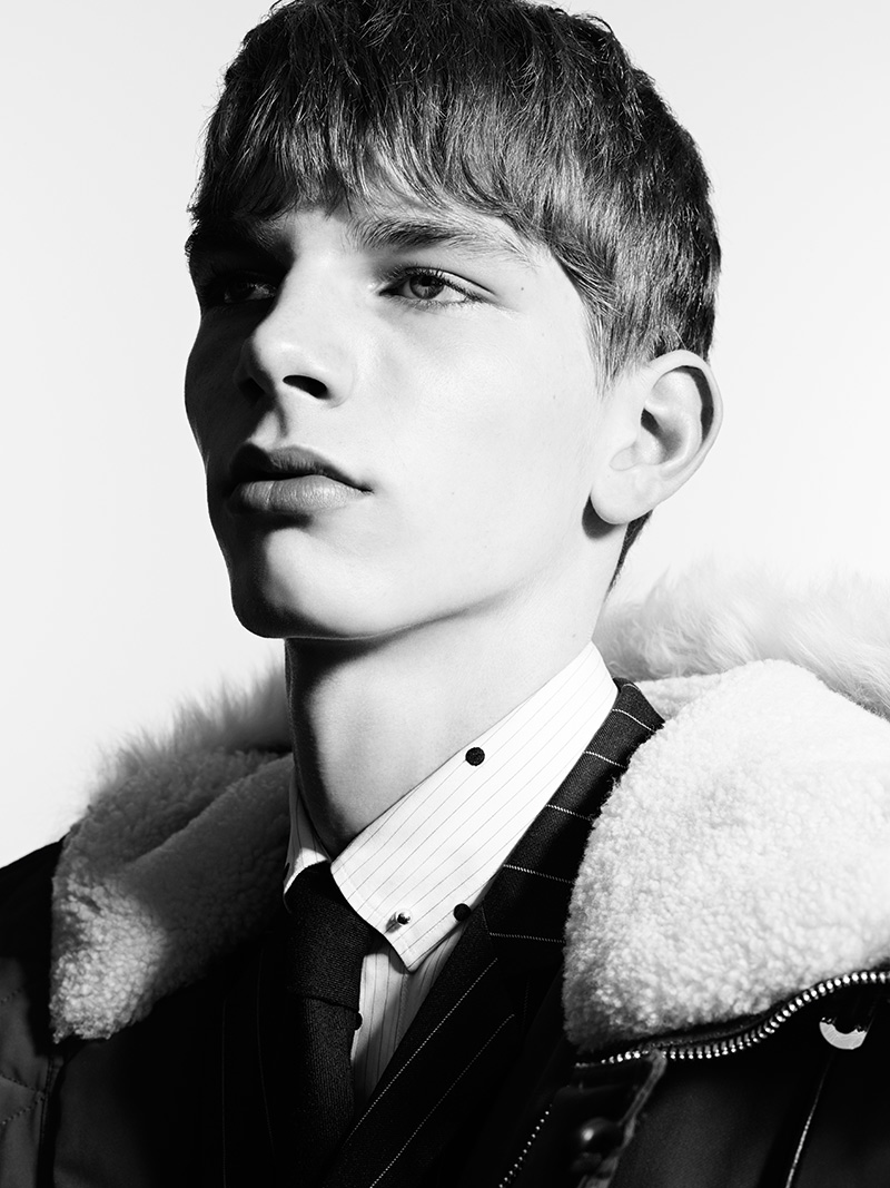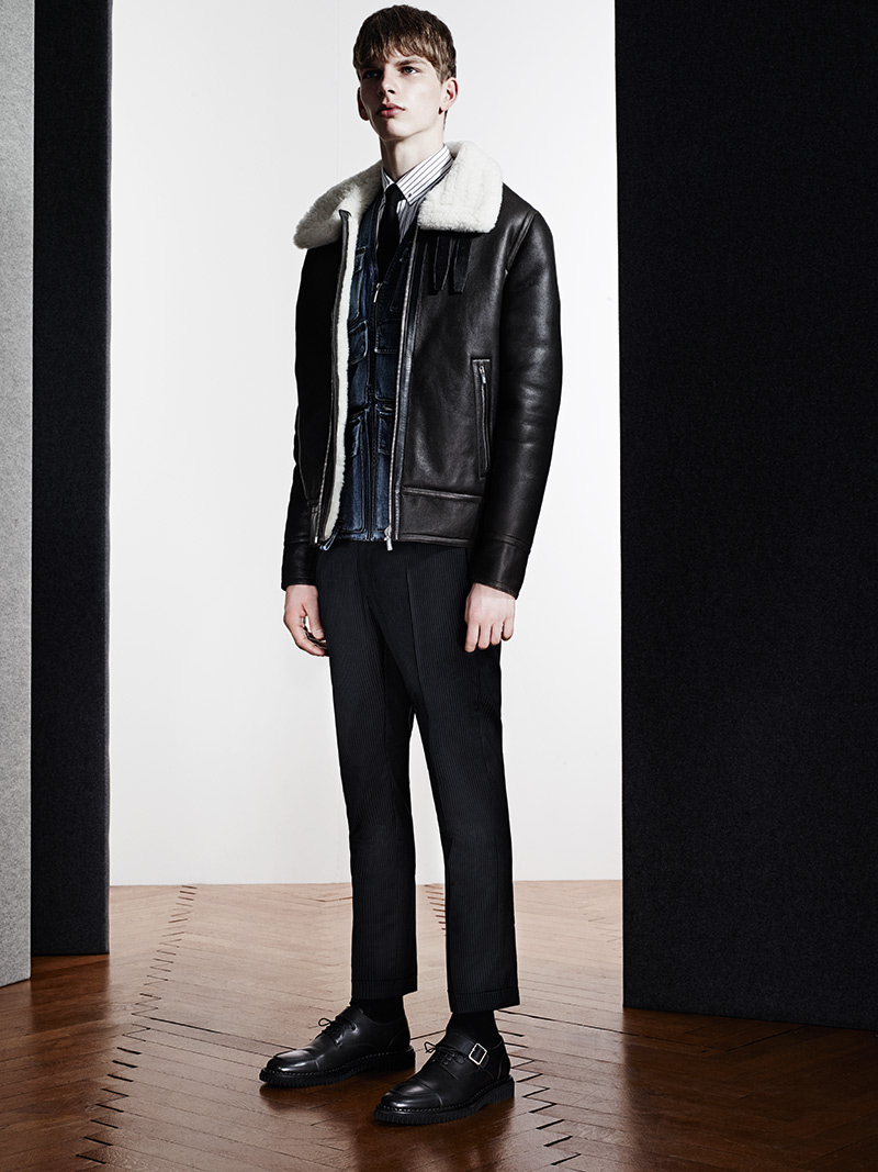 Sportswear–For winter 2014/15, French fashion label Dior Homme returns with its ‘Les Essentiels’. For the first round of Kris Van Assche designs, the bomber jacket is championed. Pictured with denim as well as a pinstripe suit from the fall/winter 2014 collection, the leather bomber jacket stands out with luxe craftsmanship and precise modern proportions.