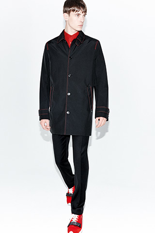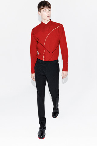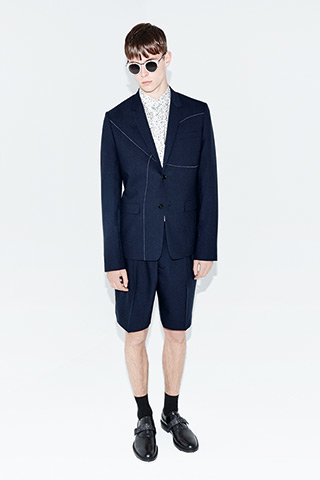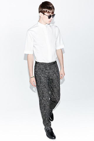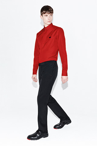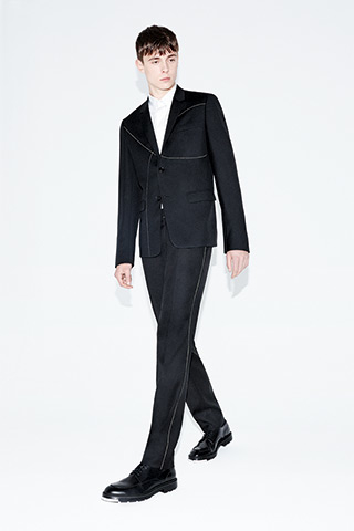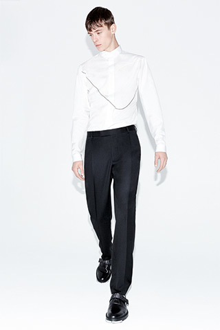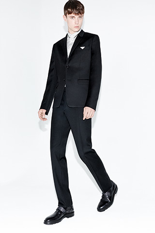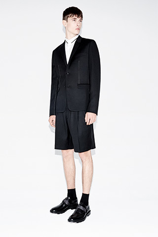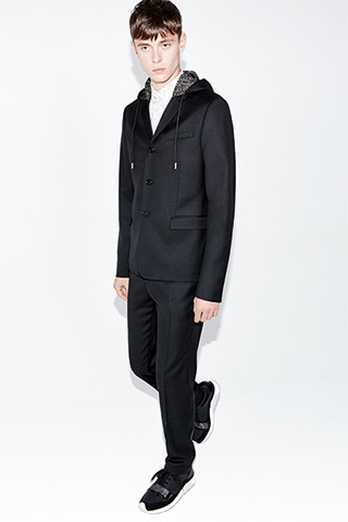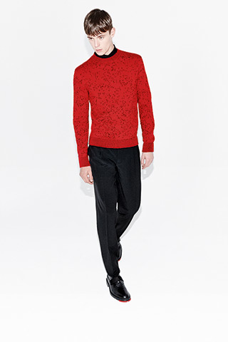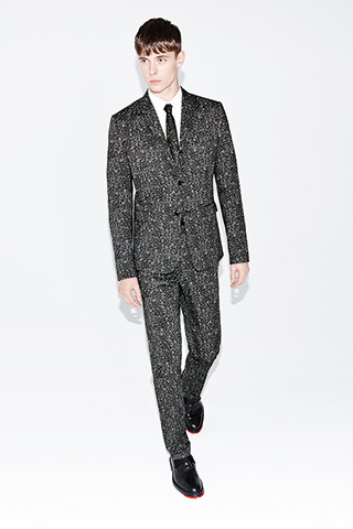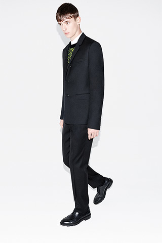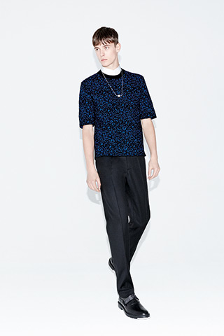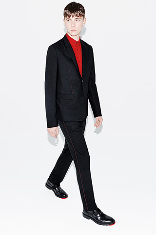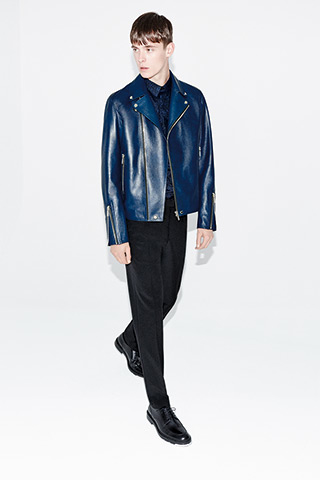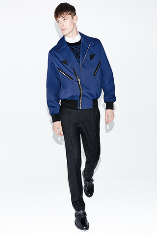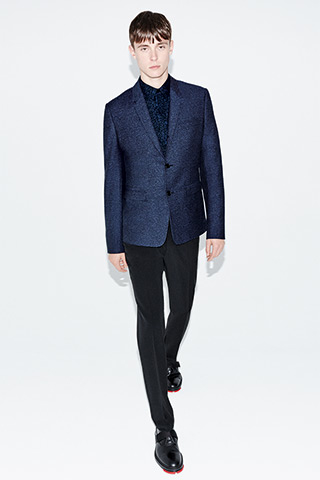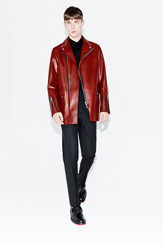 Dior-Homme-Spring-2015-Collection-026PinDior Homme Spring 2015–Approaching his first collection of 2015, Dior Homme creative director Kris Van Assche continued signature traits of his sartorial man with sharp tailoring, graphic lines and a precise use of color. Talking to Style.com, Van Assche shared that in between collections, “Pieces from one season respond to pieces from another season. It is a natural movement since it reflects the evolution of my research on a men’s wardrobe.” For the Belgian designer’s latest collection, this means the subtle finesse of his winter 2014 range and the graphic punch of fall/winter 2013. Displaying an elevated sense of casual wear, bomber jackets, printed pullovers, open-weave knitwear and leather jackets are juxtaposed with fine suiting.