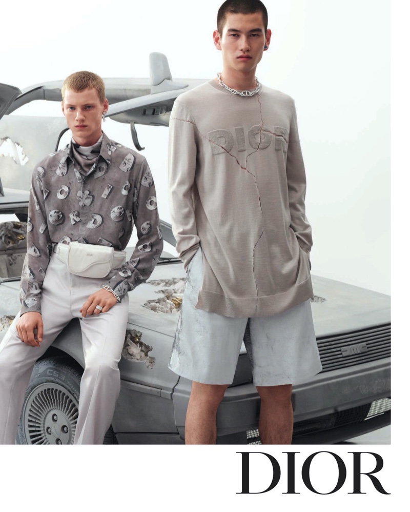 Paying a nod to the Back to the Future film series, the advertisement features a sculpture entitled “Archaeologist of the Future,” which is based on the iconic DeLorean car. Meanwhile, Steven Meisel collaborates with stylist Melanie Ward for the occasion. Meisel captures Dior Men’s campaign stars in chic monochromatic looks for the season.