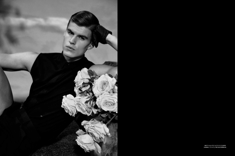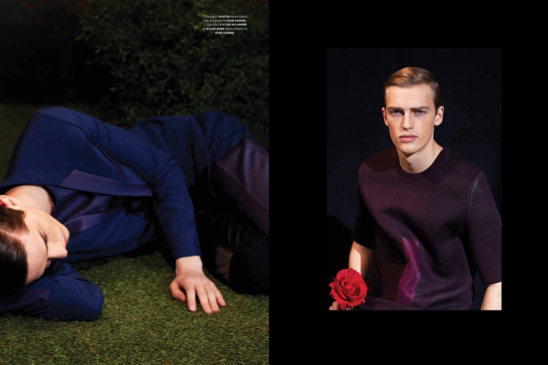 Grace & Discipline–It’s off to the park for models Laurie Harding (Fusion), Martin Conte, Matt Woodhouse, Stephen James and Victor Nylander as they appear in a story for the latest issue of Document Journal. Styled by James Valeri in the spring/summer 2014 collection of Dior Homme, the models pose for the lens of Collier Schorr. Here, the sleek modern designs of Dior Homme creative director Kris Van Assche are highlighted against a hyper-reality.