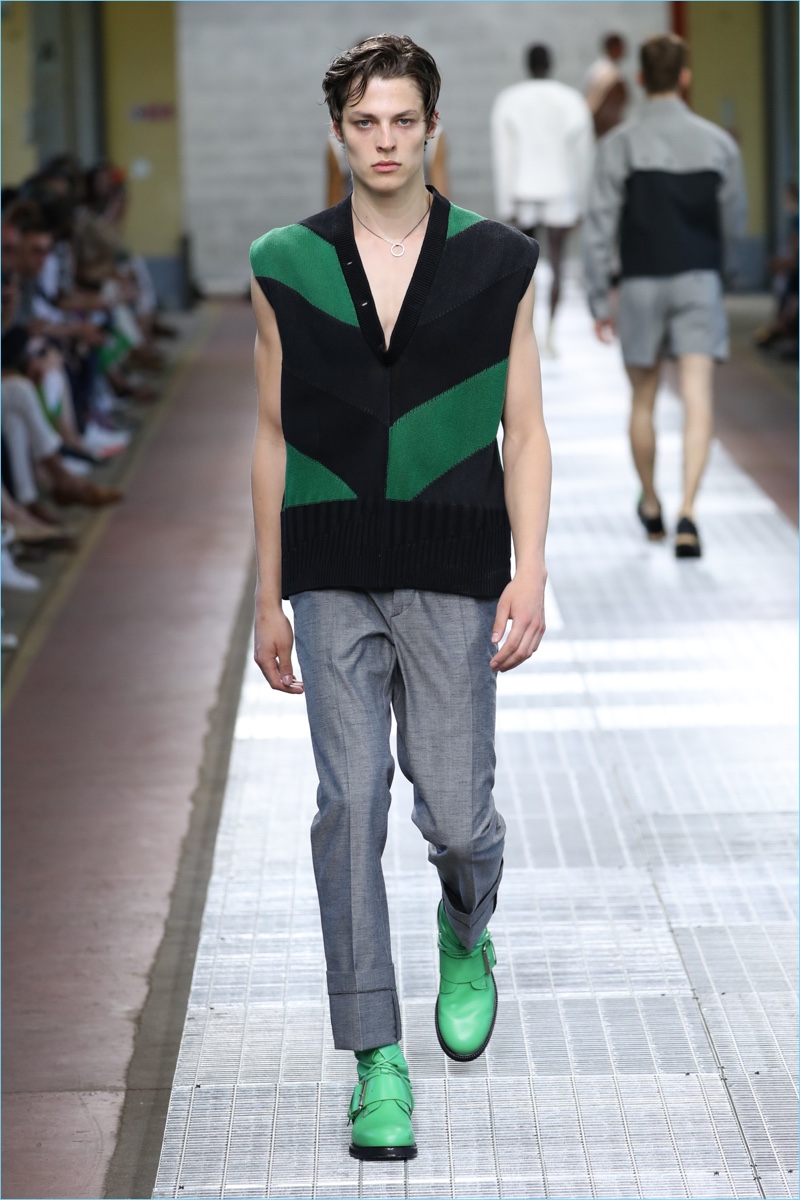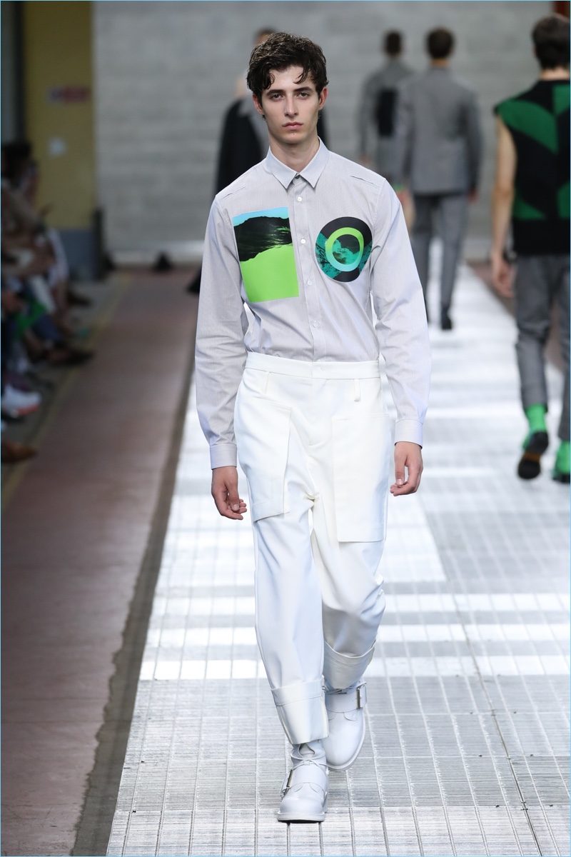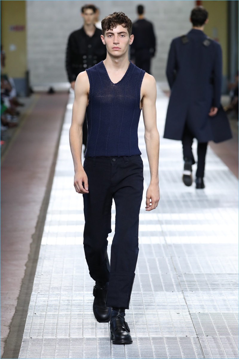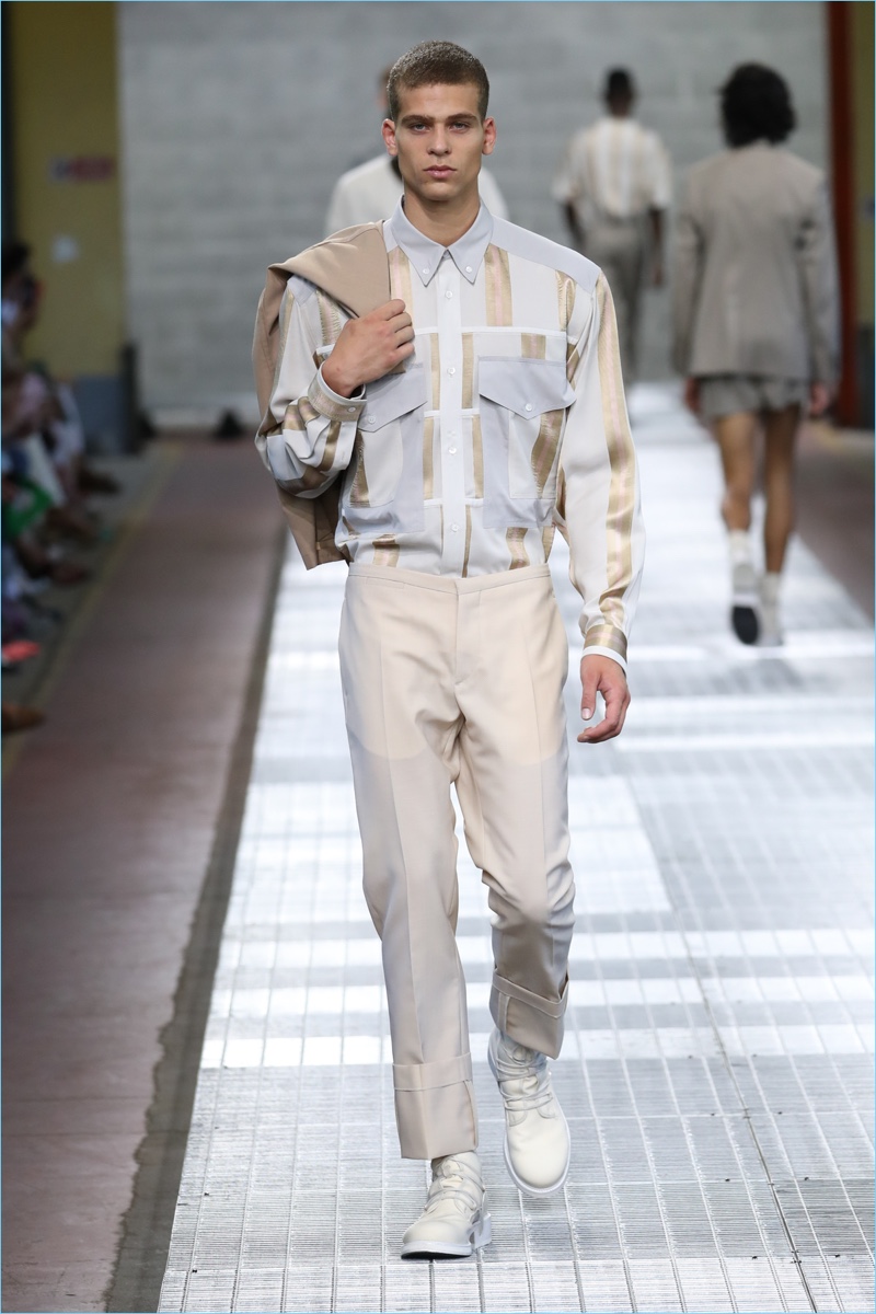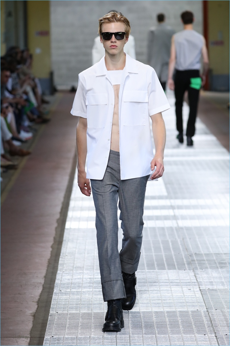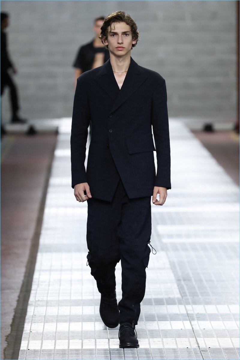 Dirk Bikkembergs tackles a minimal point of reference for spring. The fashion brand turns out a sleek collection with clean lines and fresh details. Creative director Lee Wood modifies the house’s athletic code with a sophisticated approach towards masculinity. Picture-perfect tailoring and a chic practicality come together. Hero pieces range from cropped jackets and sweater vests to dashing suits.