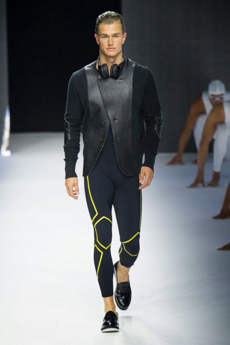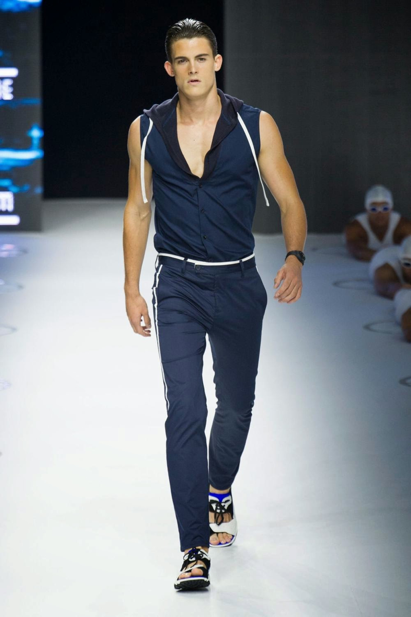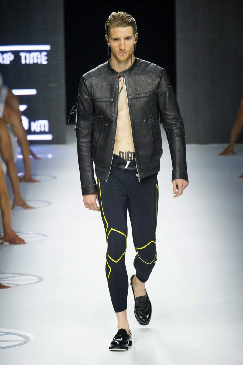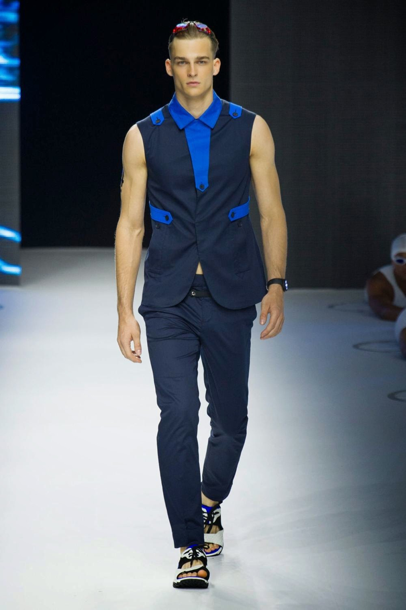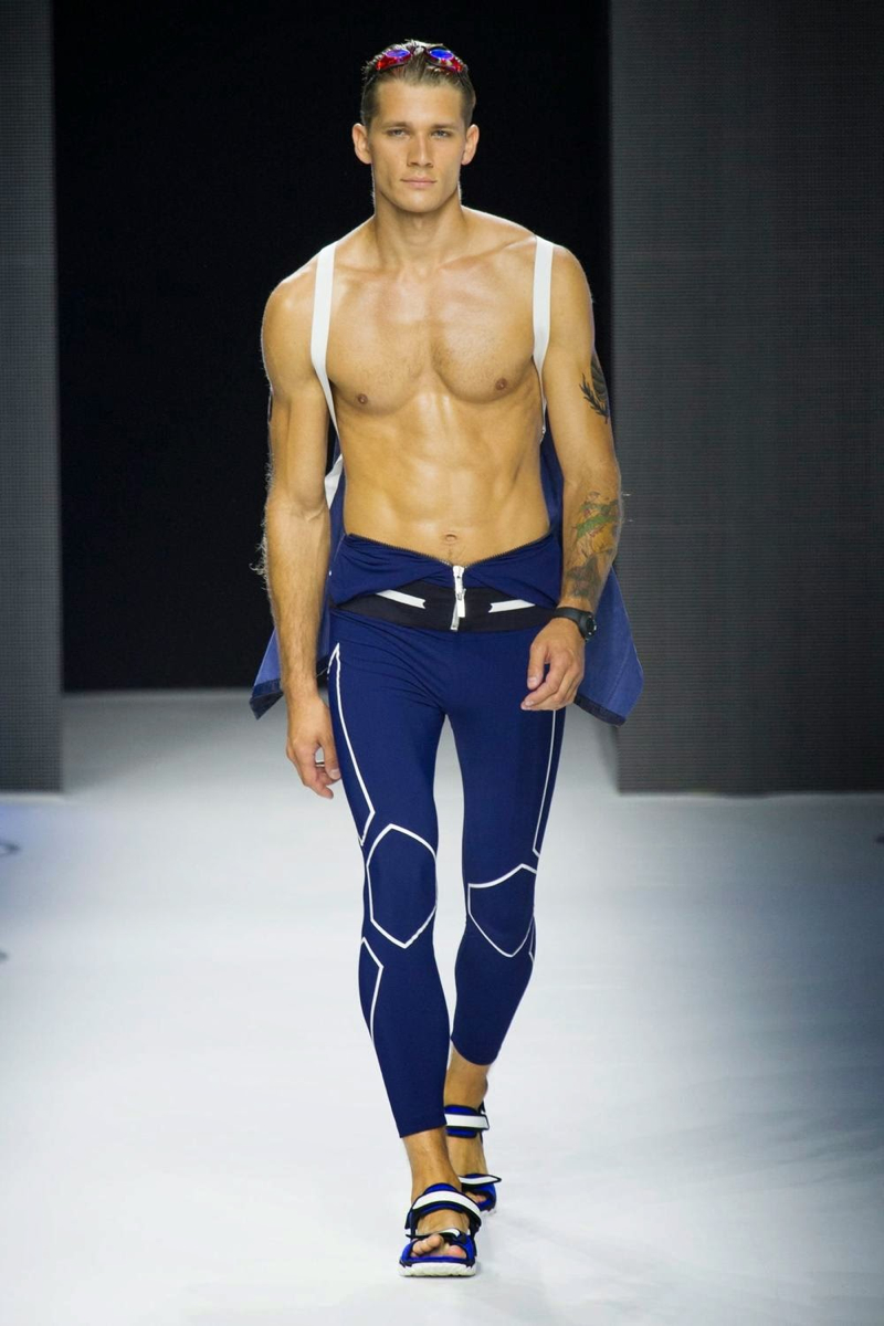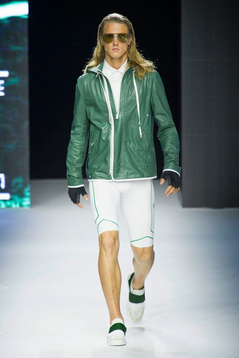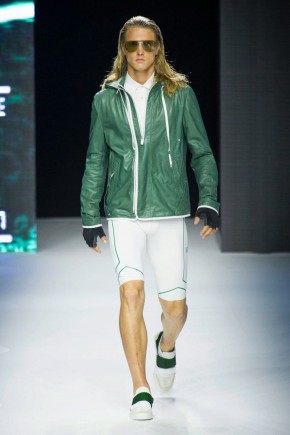 Dirk Bikkembergs Spring/Summer 2015–A fashion label that has always been about the athletic man, Dirk Bikkembergs fits right in this season. For spring/summer 2015, the swimmer and his long torso were the stars of the show. Embracing aquatic blues, leggings, open shirts and sporty blazers were right at home. Take a detour with cycling and the shorts were tight and tops relaxed. Stopping off in Shanghai, Dirk Bikkembergs’ collection got playful with biker’s jackets, mesh tops and more mixing in with the sporty essentials already established. Altogether, the collection hit a relevant note for the athlete, marrying style and function.