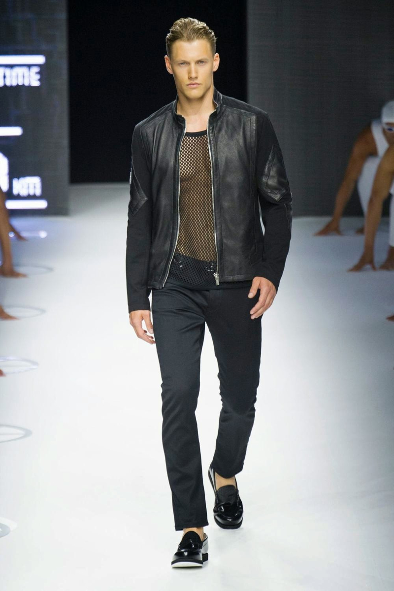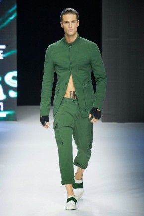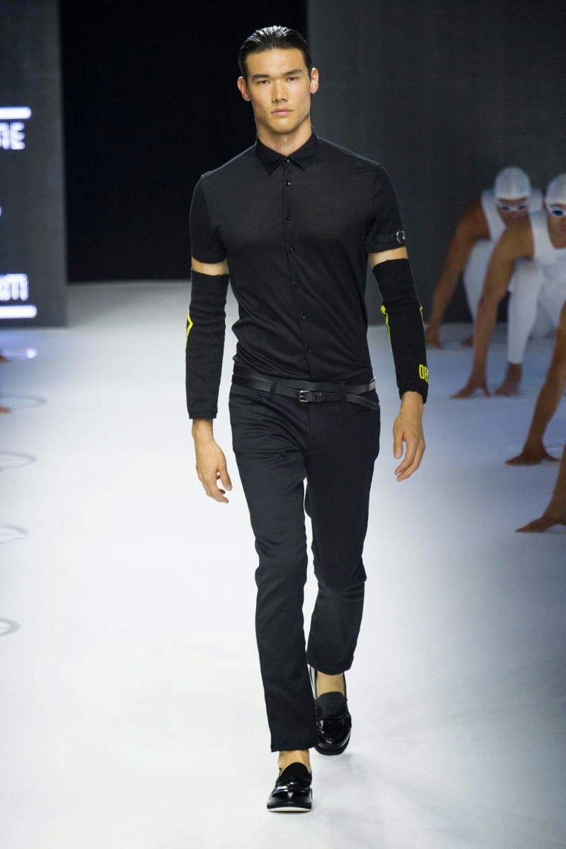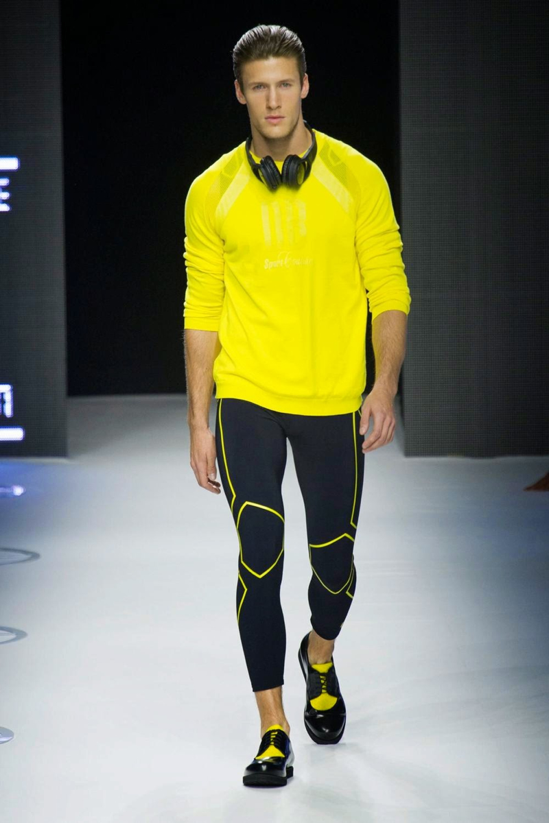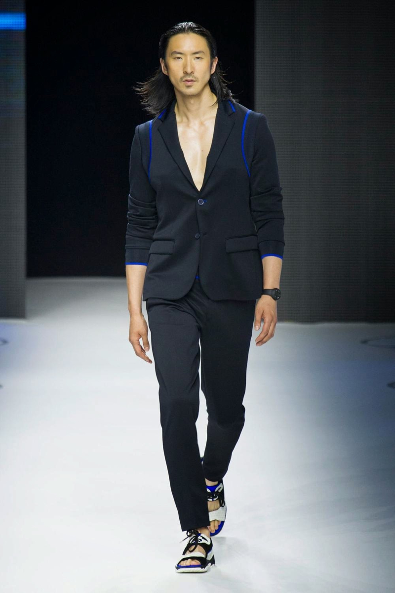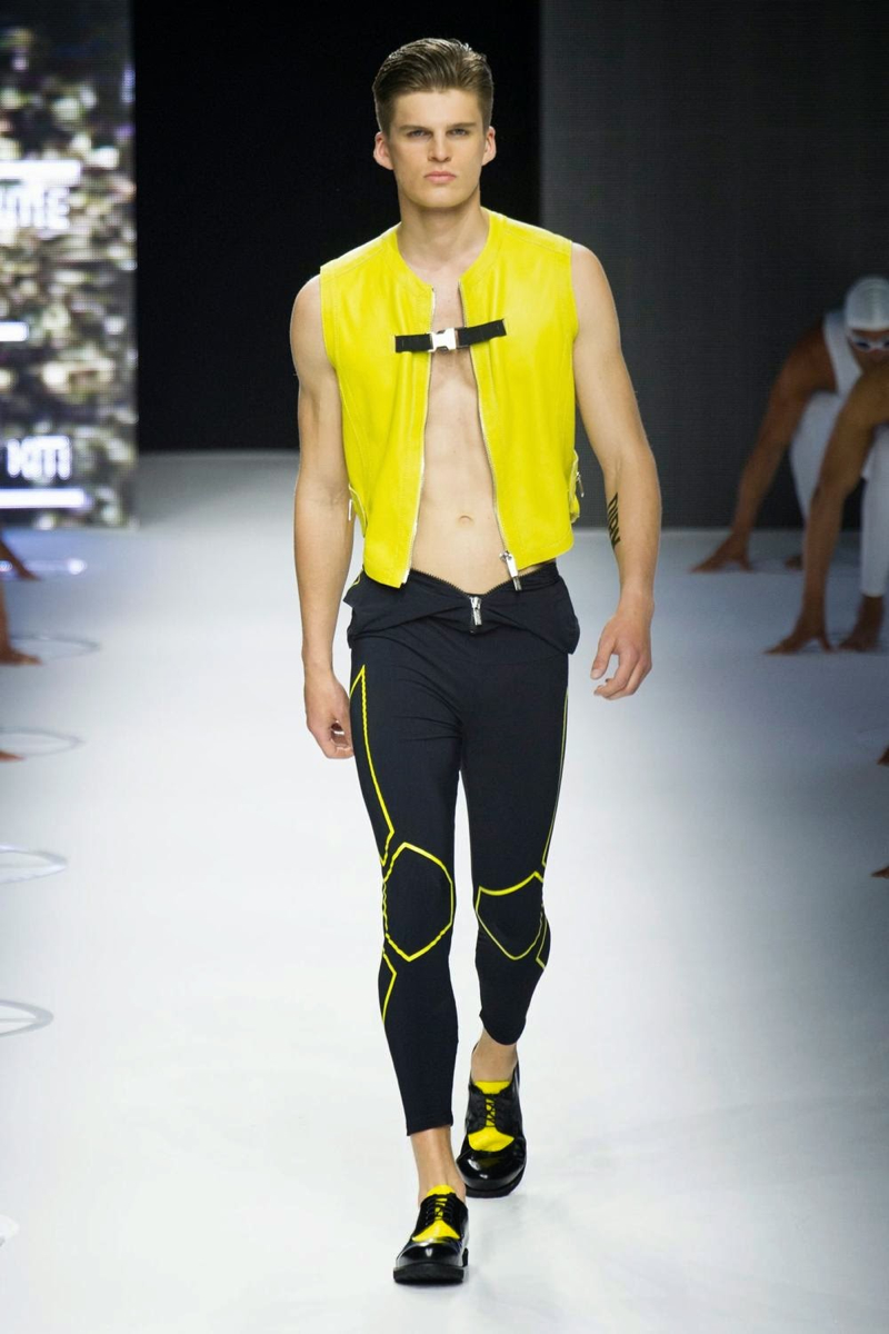 Dirk Bikkembergs Spring/Summer 2015–A fashion label that has always been about the athletic man, Dirk Bikkembergs fits right in this season. For spring/summer 2015, the swimmer and his long torso were the stars of the show. Embracing aquatic blues, leggings, open shirts and sporty blazers were right at home. Take a detour with cycling and the shorts were tight and tops relaxed. Stopping off in Shanghai, Dirk Bikkembergs’ collection got playful with biker’s jackets, mesh tops and more mixing in with the sporty essentials already established. Altogether, the collection hit a relevant note for the athlete, marrying style and function.