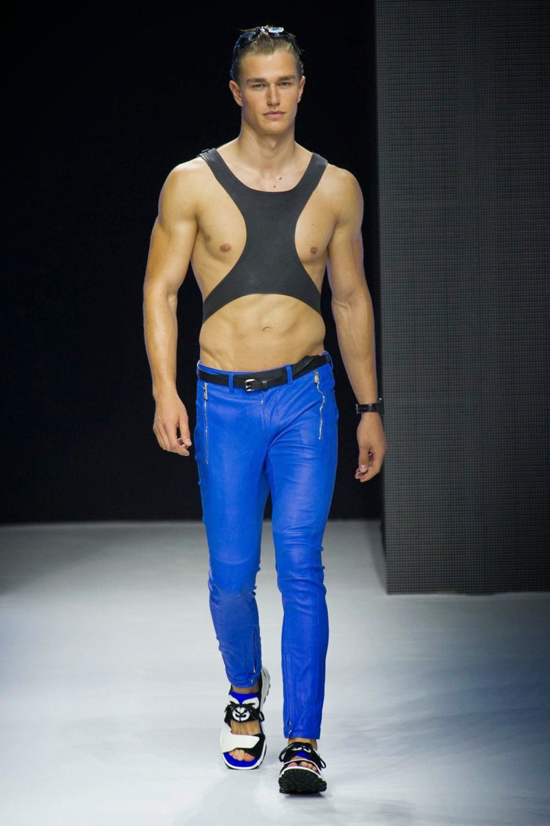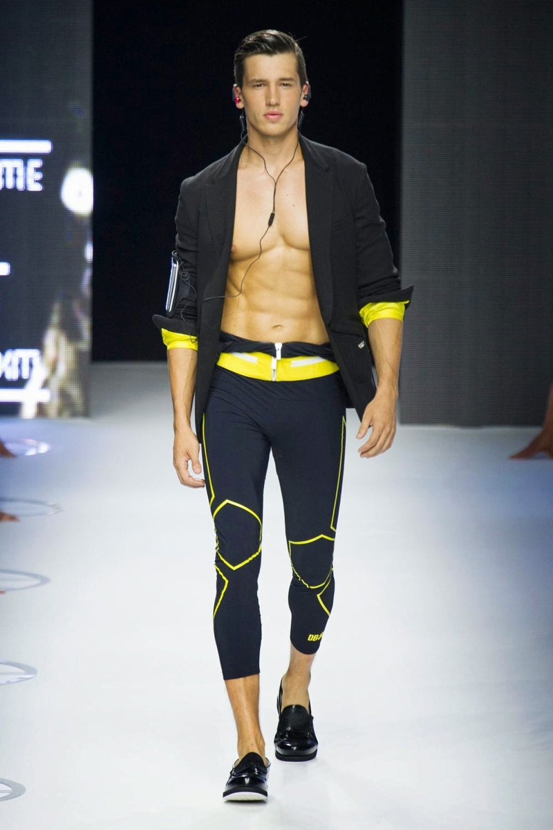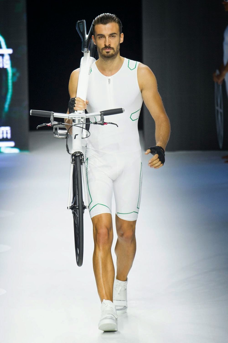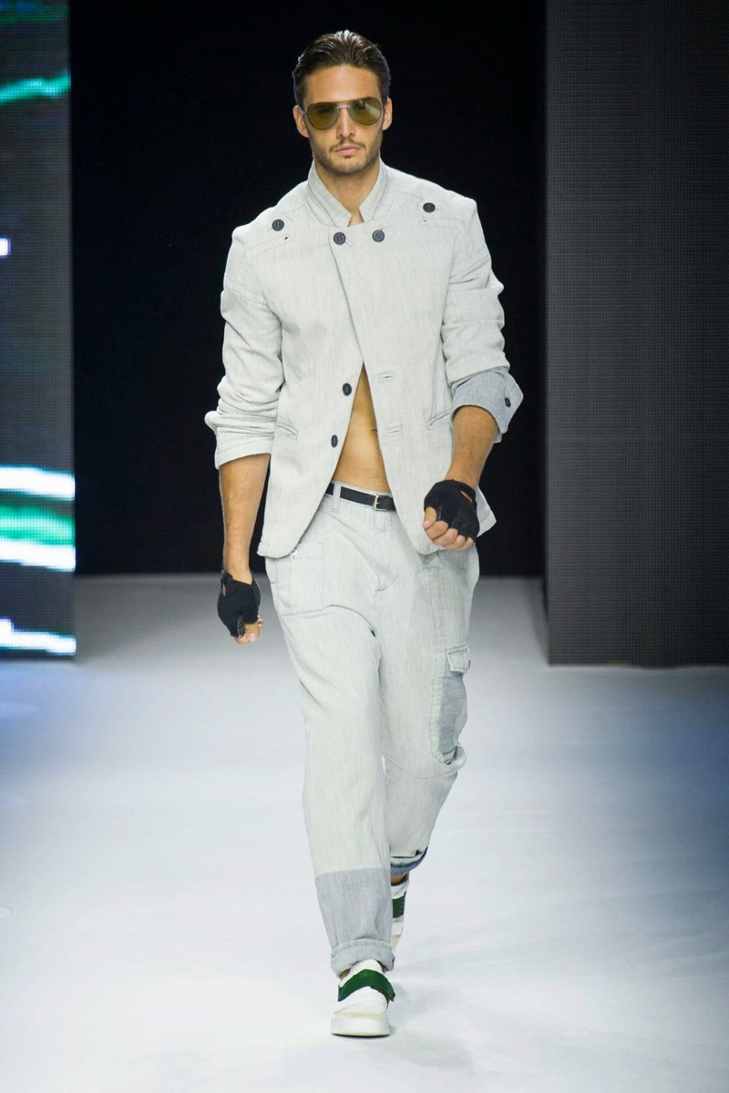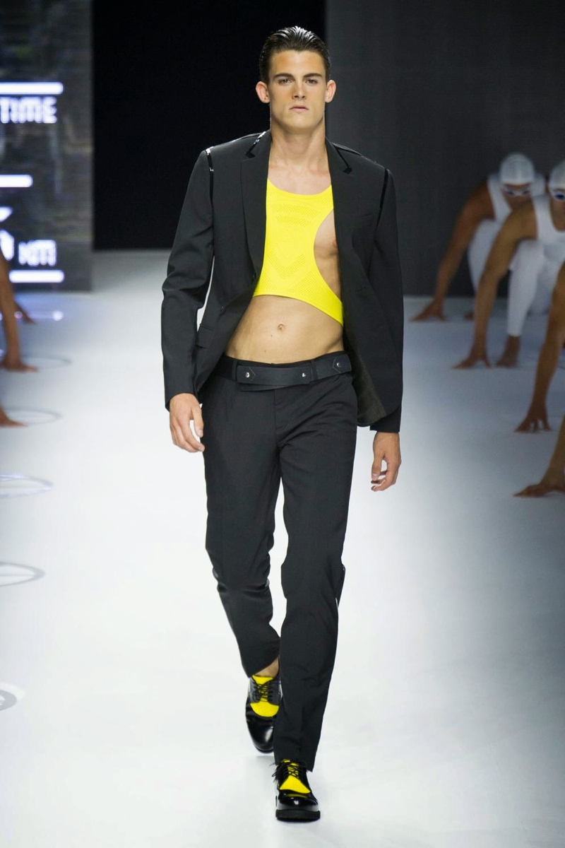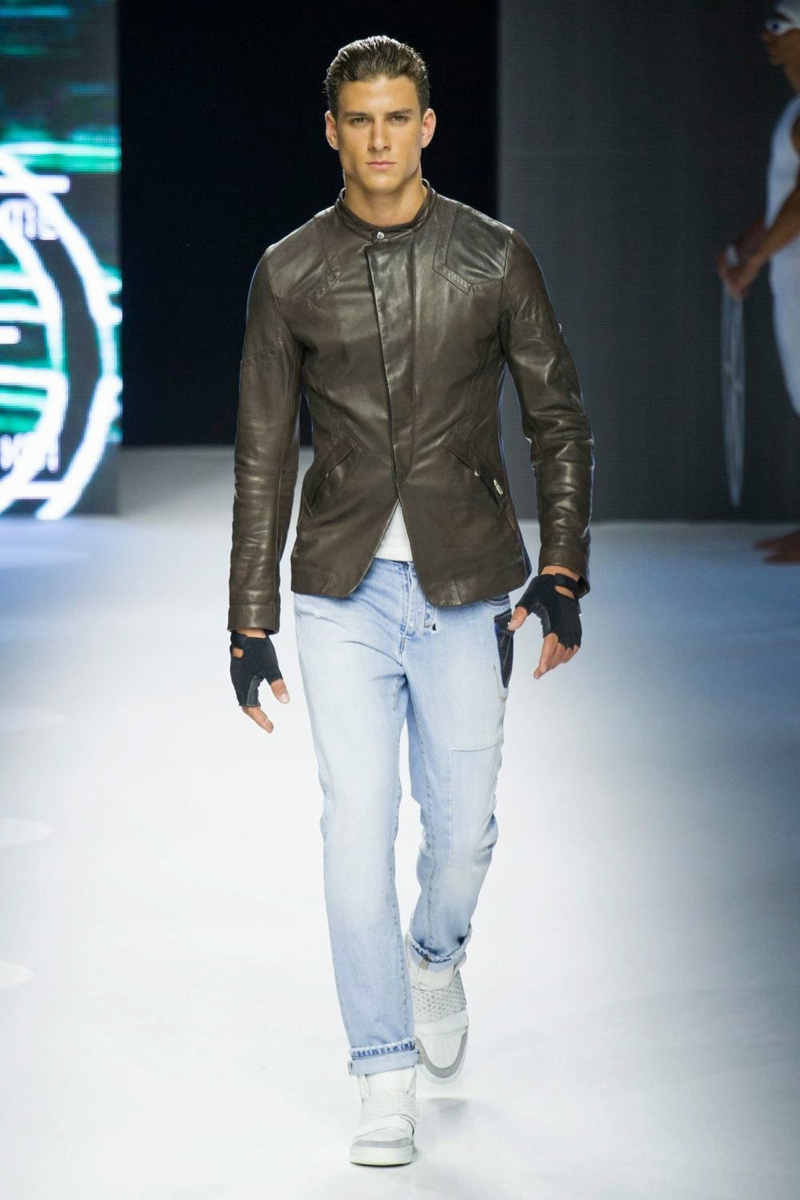 Dirk Bikkembergs Spring/Summer 2015–A fashion label that has always been about the athletic man, Dirk Bikkembergs fits right in this season. For spring/summer 2015, the swimmer and his long torso were the stars of the show. Embracing aquatic blues, leggings, open shirts and sporty blazers were right at home. Take a detour with cycling and the shorts were tight and tops relaxed. Stopping off in Shanghai, Dirk Bikkembergs’ collection got playful with biker’s jackets, mesh tops and more mixing in with the sporty essentials already established. Altogether, the collection hit a relevant note for the athlete, marrying style and function.