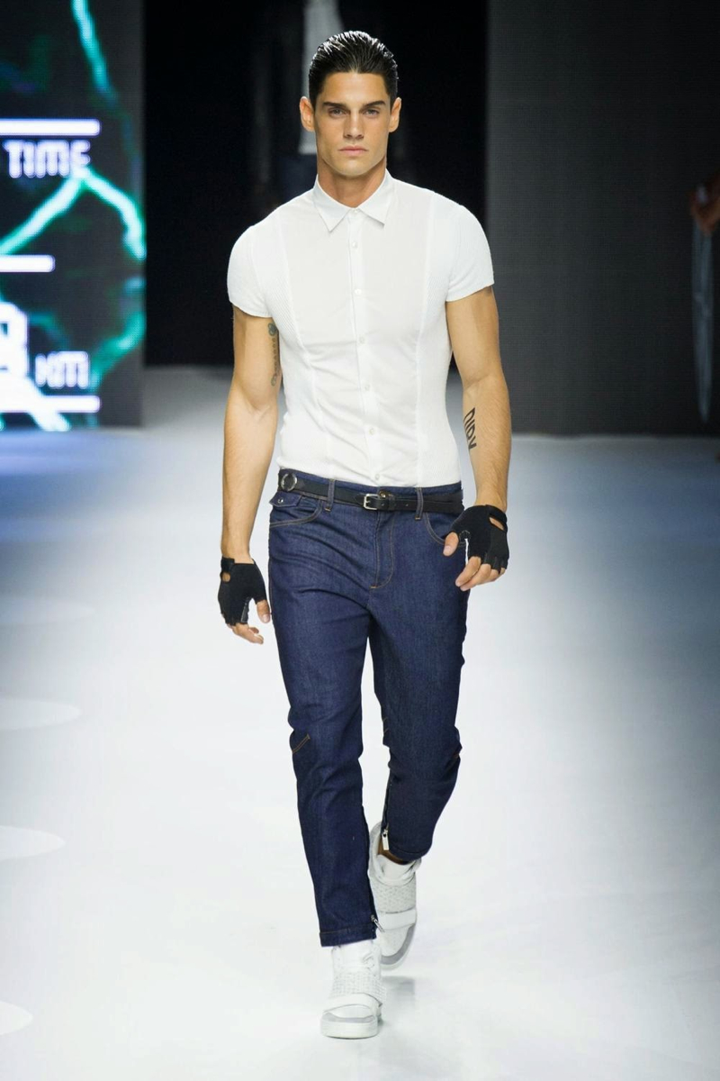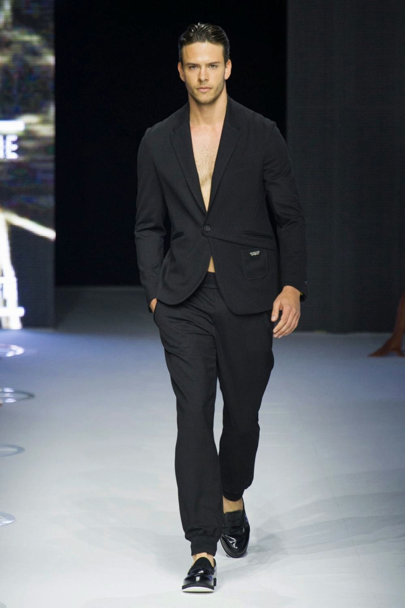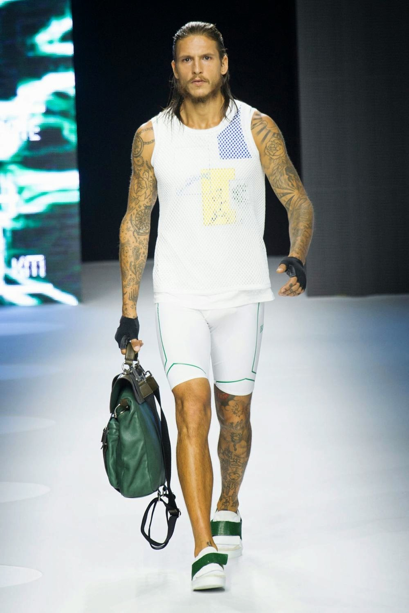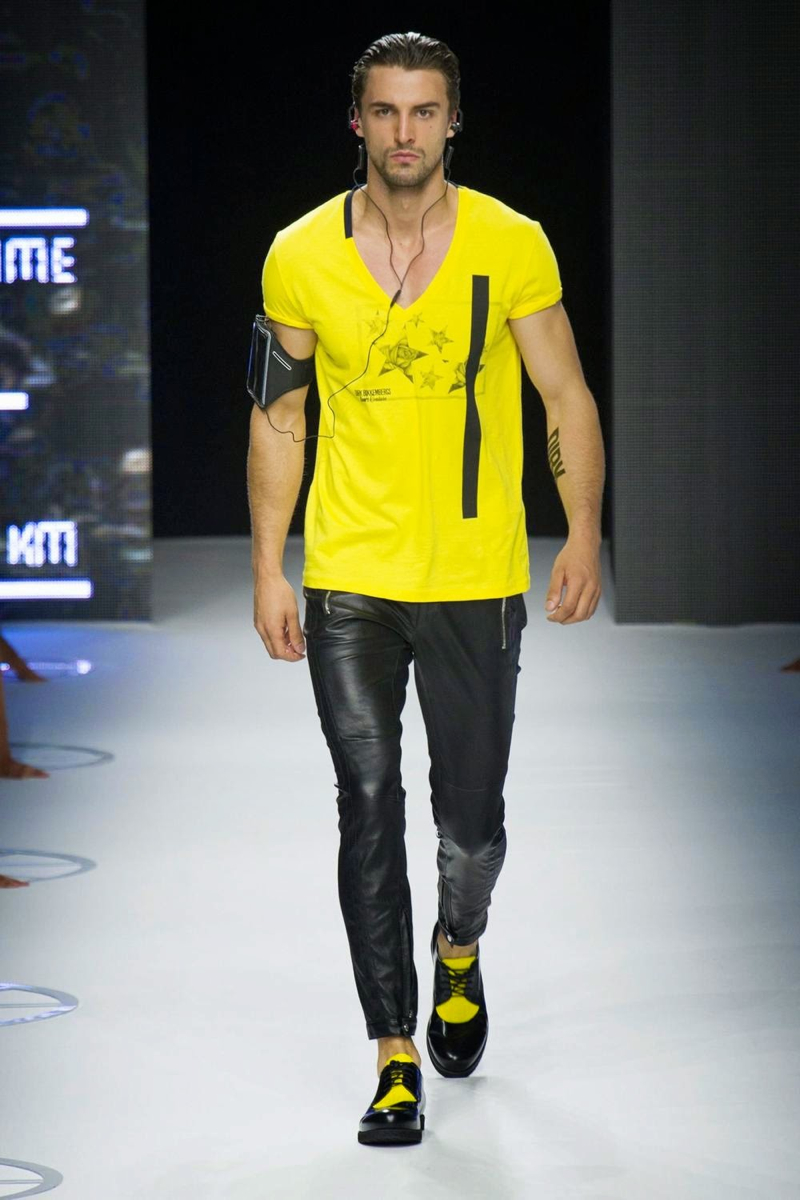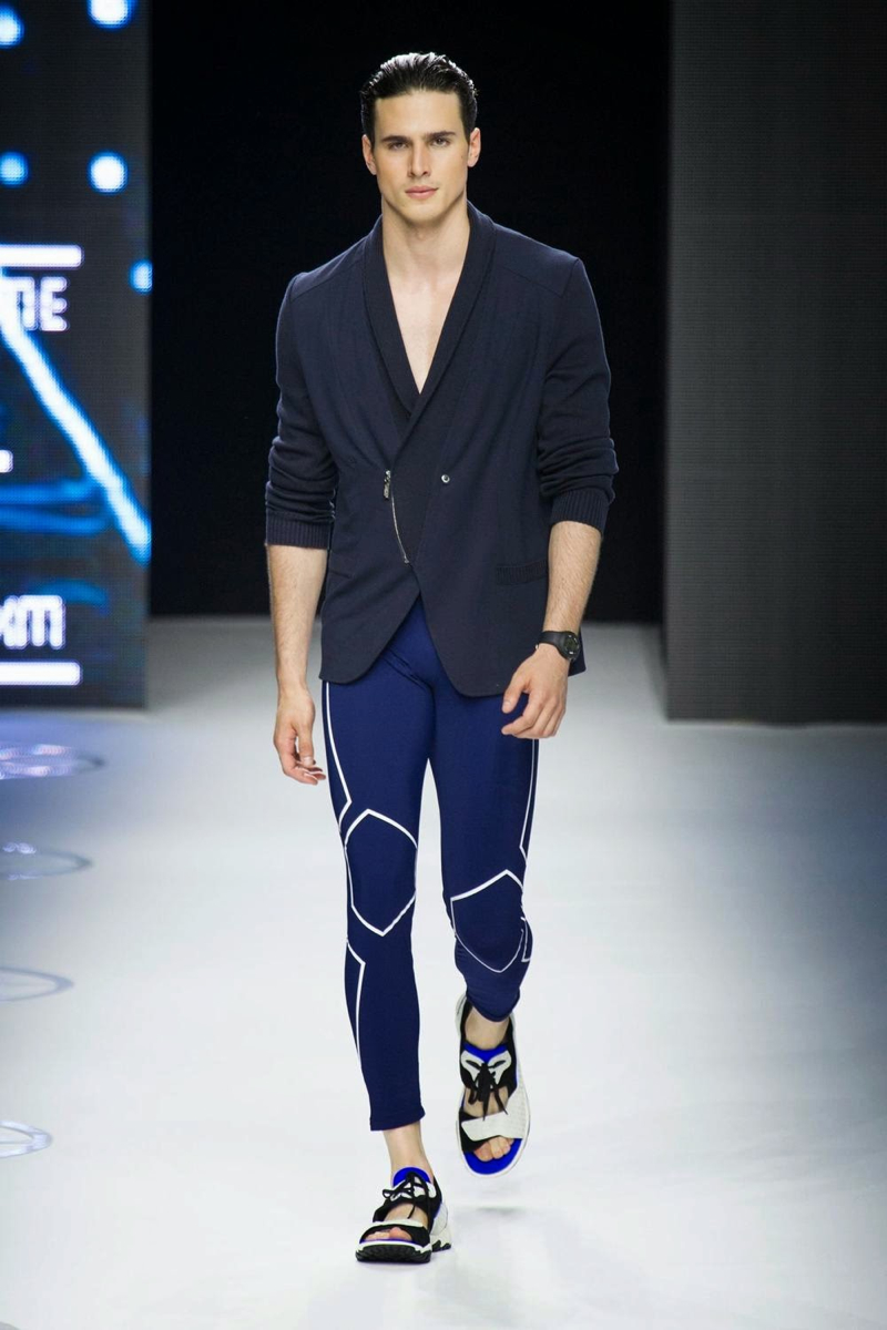 Dirk Bikkembergs Spring/Summer 2015–A fashion label that has always been about the athletic man, Dirk Bikkembergs fits right in this season. For spring/summer 2015, the swimmer and his long torso were the stars of the show. Embracing aquatic blues, leggings, open shirts and sporty blazers were right at home. Take a detour with cycling and the shorts were tight and tops relaxed. Stopping off in Shanghai, Dirk Bikkembergs’ collection got playful with biker’s jackets, mesh tops and more mixing in with the sporty essentials already established. Altogether, the collection hit a relevant note for the athlete, marrying style and function.