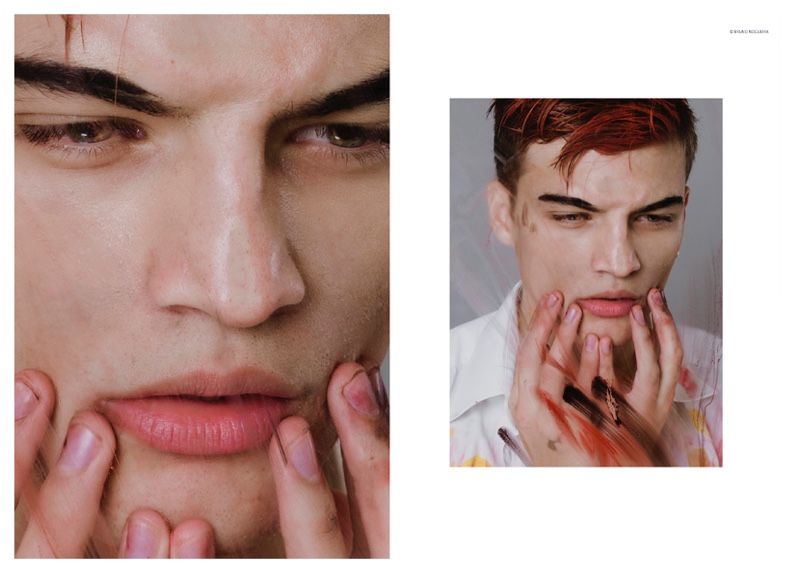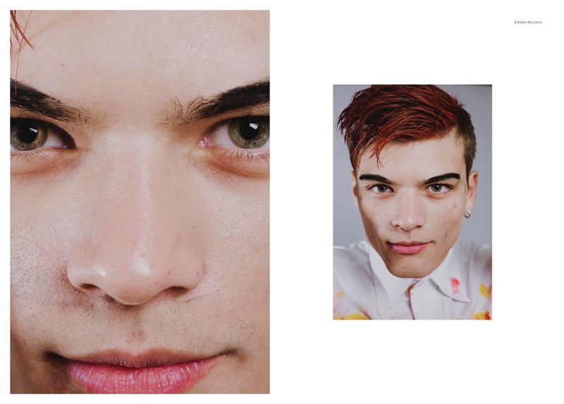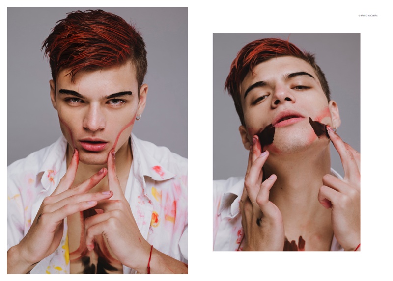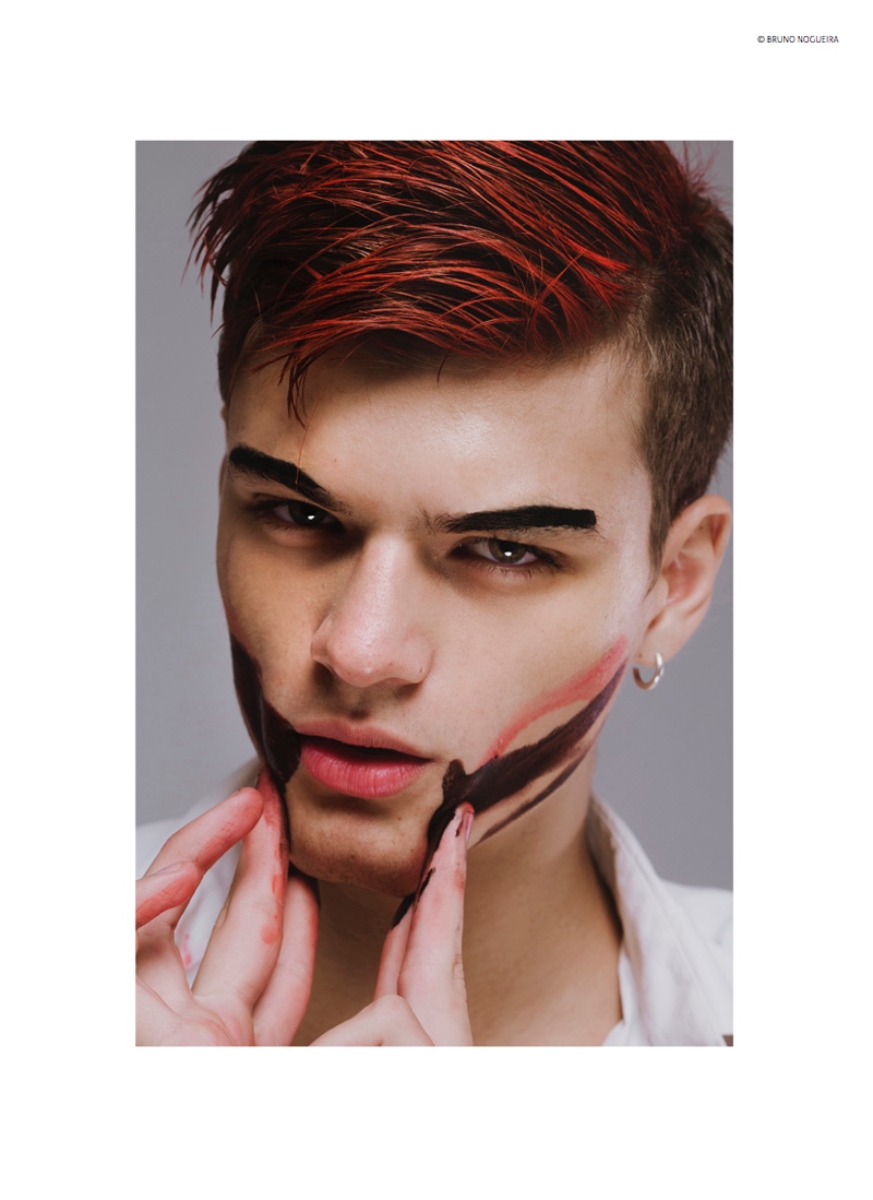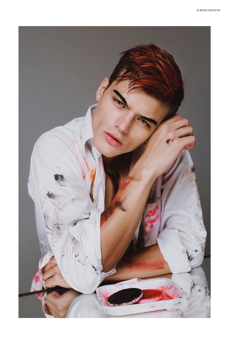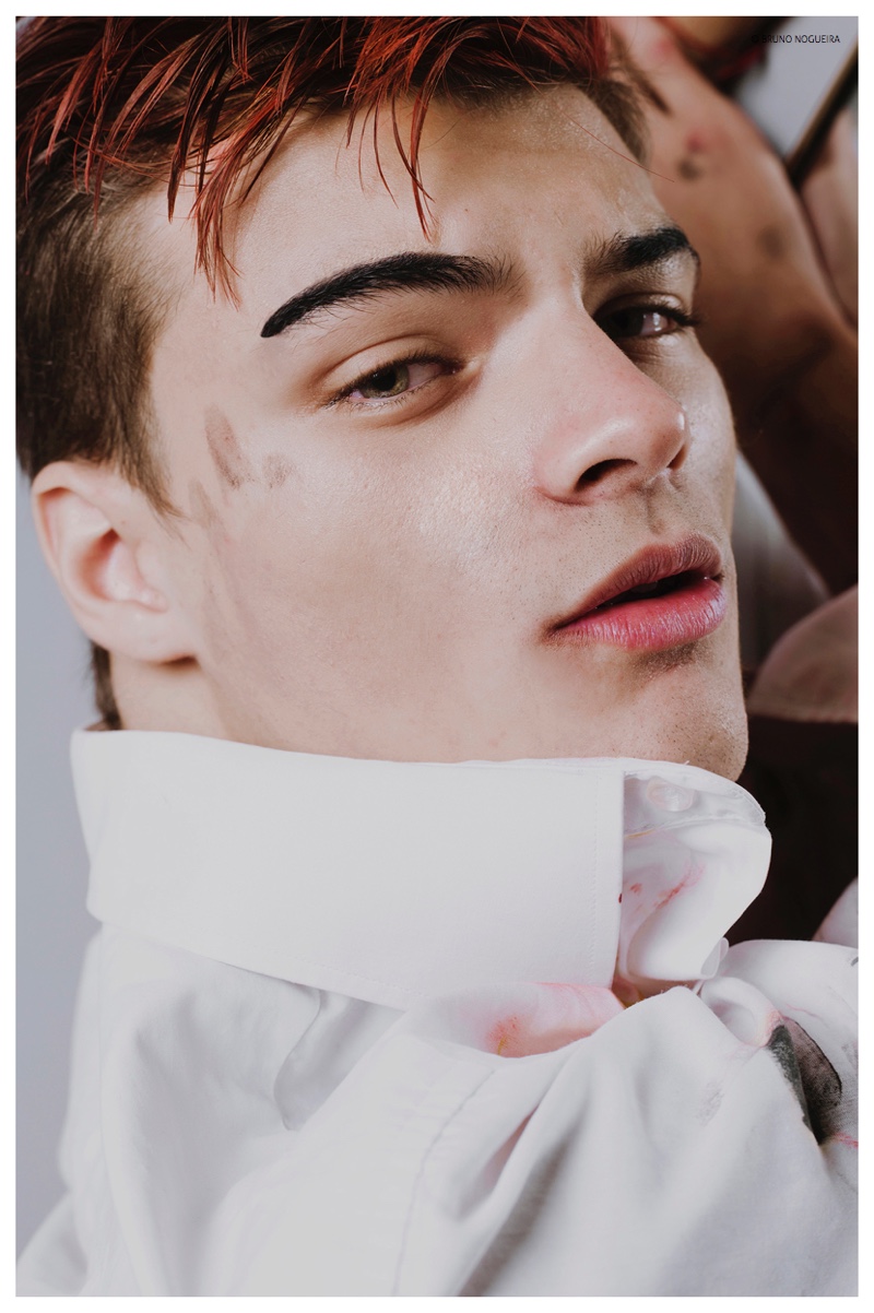 Photographer Bruno Nogueira reunites with model Juan Cruz Núñez following a photo shoot earlier this year. Heading back to the studio, Juan is front and center as he gets a trendy new do featuring red streaks. Dressed in white, the Montevideo model acts as a canvas, painted for stunning results.