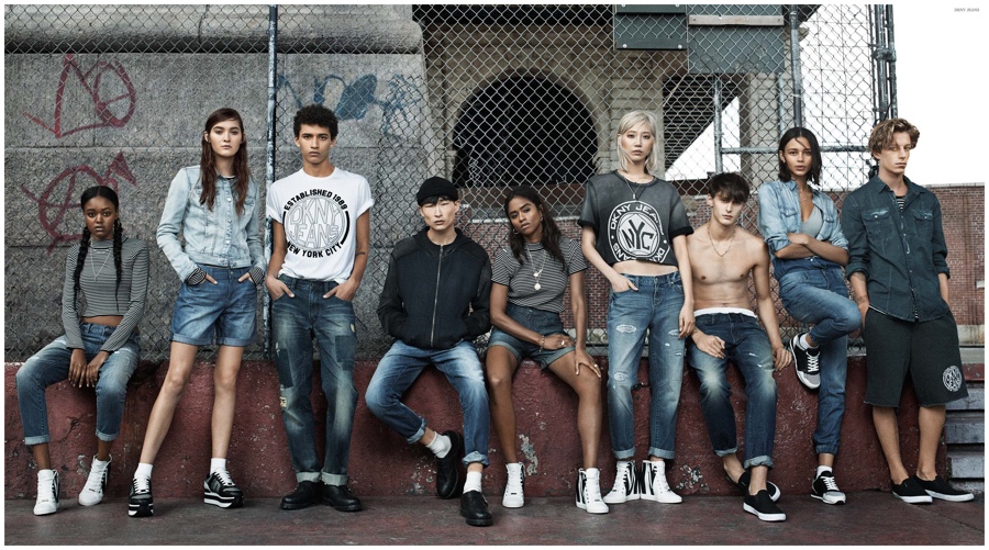 DKNY Jeans embraces a gritty New York environment for the set of its spring-summer 2015 campaign. Models Ben Nordberg, Emma Waldo, Jackson Hale, Jeremy Matos, Sang Kim and Soo Joo Park star in the laid-back advertisement, which was photographed by Greg Harris. Outfitted by stylist Jay Massacret, the lot model distressed denim jeans, paired with graphic t-shirts and slim-fit denim shirts.