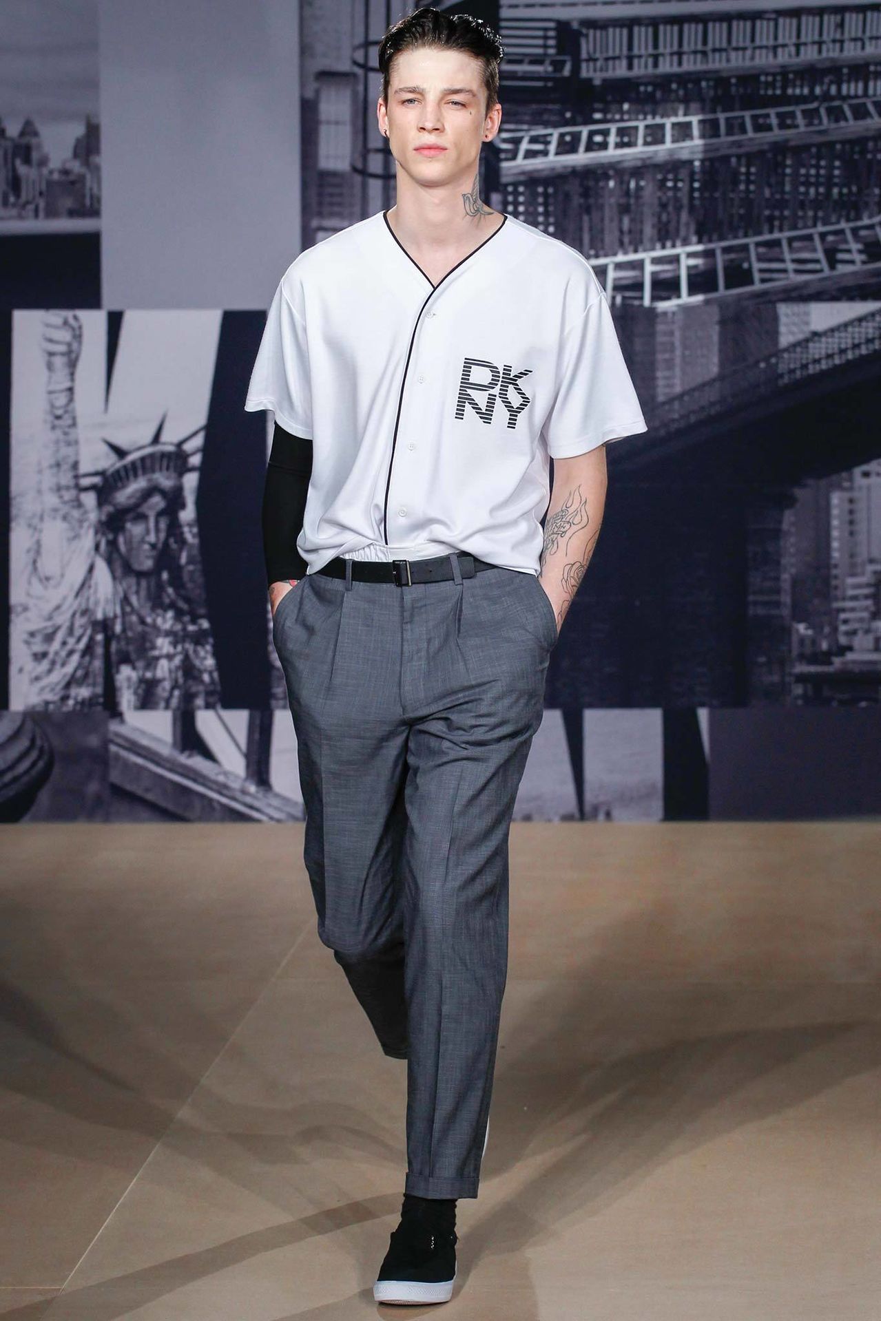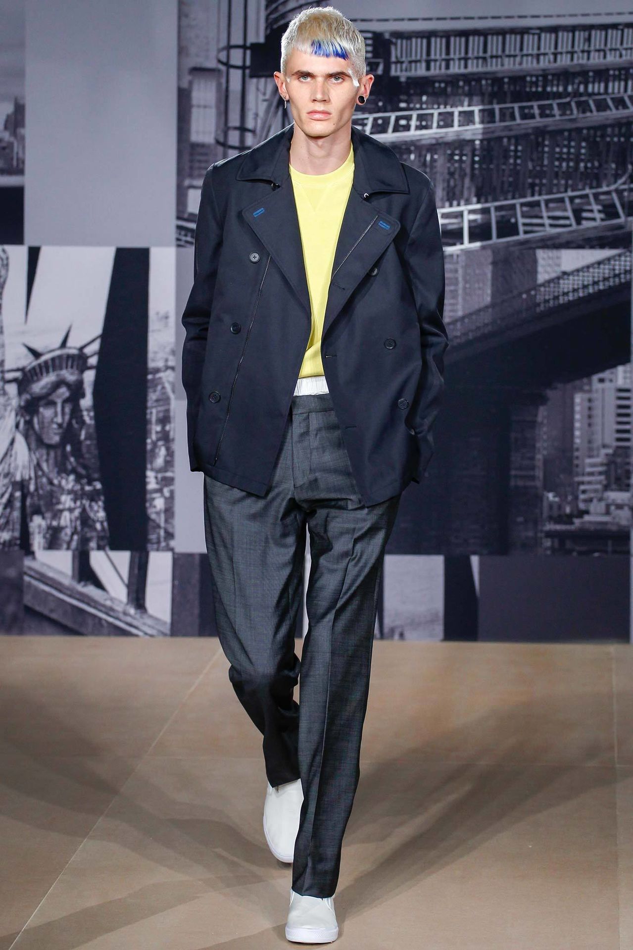 DKNY Spring/Summer 2015–Taking its show across the pond this season, DKNY provided London Collections: Men with an American touch. Baseball served as a sporty backdrop for the DKNY man, aiming to take the great American pastime international. Baseball shirts with the DKNY logo were paired with relaxed pleated trousers and boxy mid-length sleeve tops layered over button-downs. Continuing the fluid lineup, outerwear had a loose structure. Maintaining a relatively safe color palette, pops of orange made a splash against a sea of navy and white.