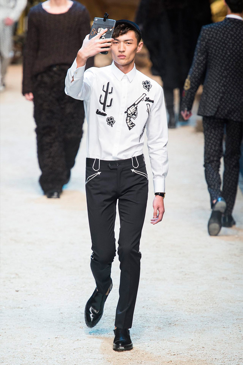 Dolce & Gabbana embraced a western style motif for its fall-winter 2016 men’s collection. Going against the grain of expectations, the Italian label’s spin on the timeless fashion inspiration was firmly rooted in its familiarity with sartorial suiting and casual denim. Relying heavily on embellishments to cement the season’s theme, horses, cowboys, revolvers and shoe horses dressed fitted shirts, double-breasted coats, slim-cut trousers and pullovers.