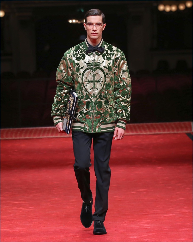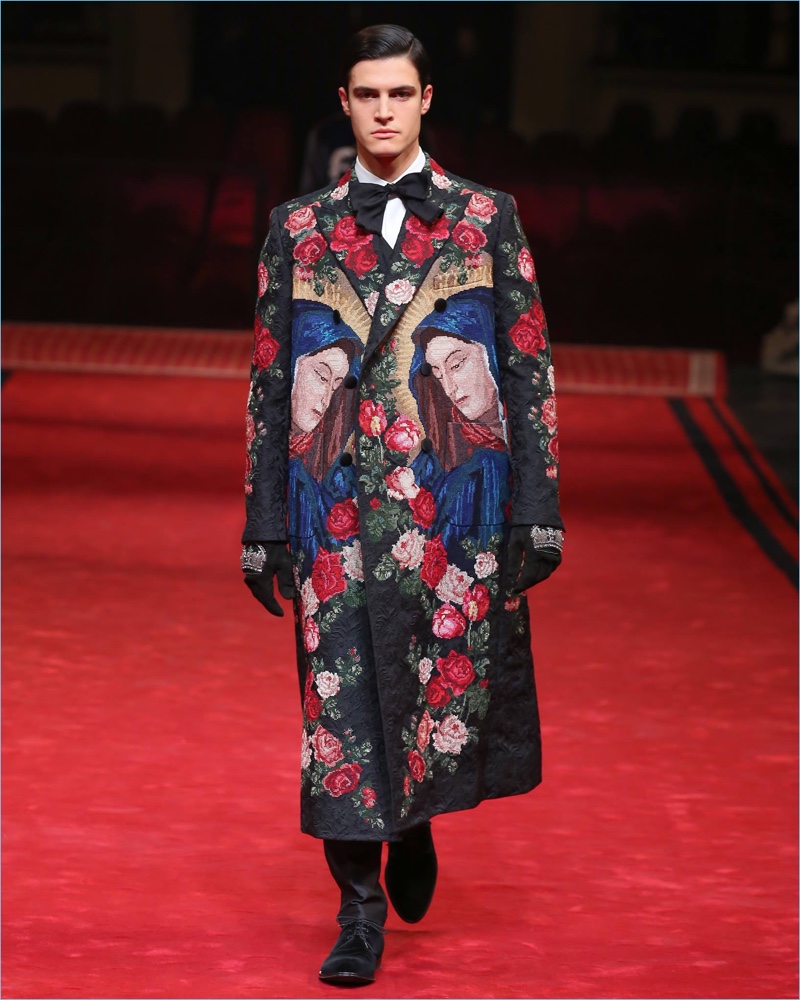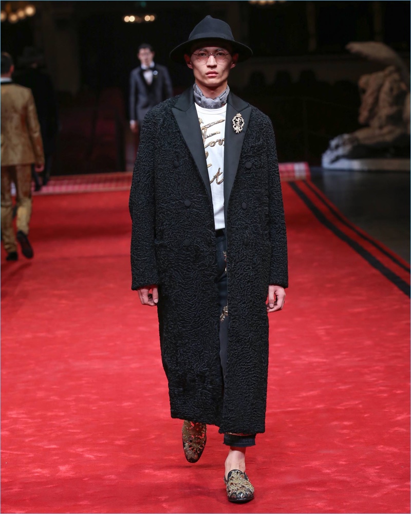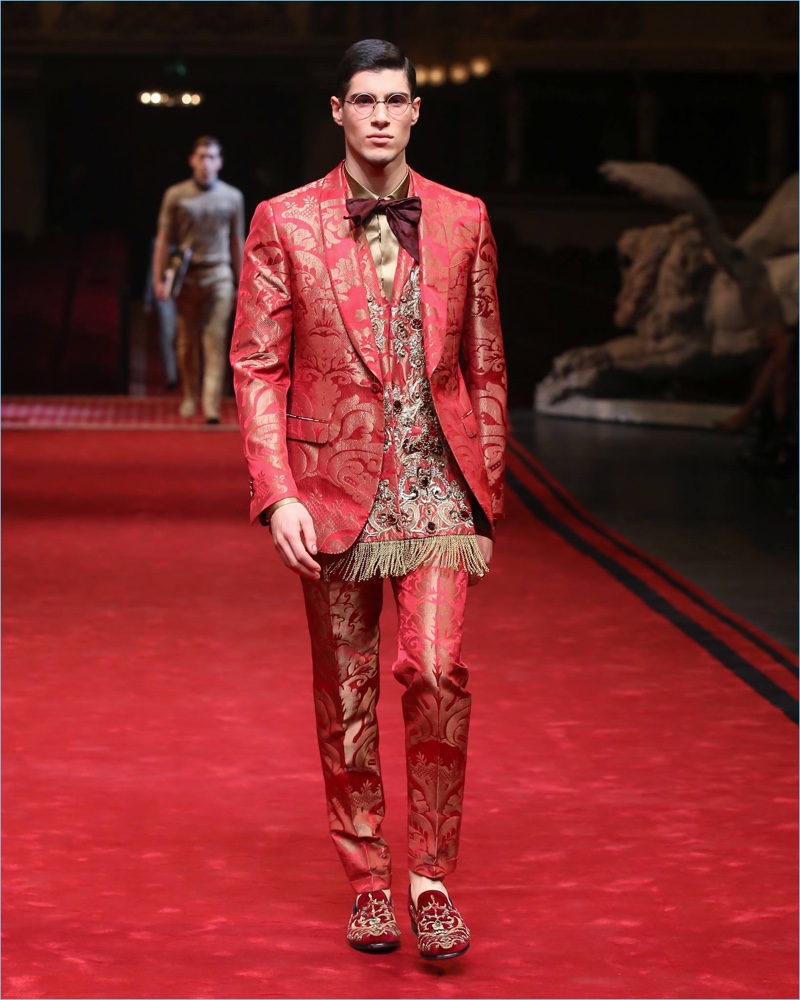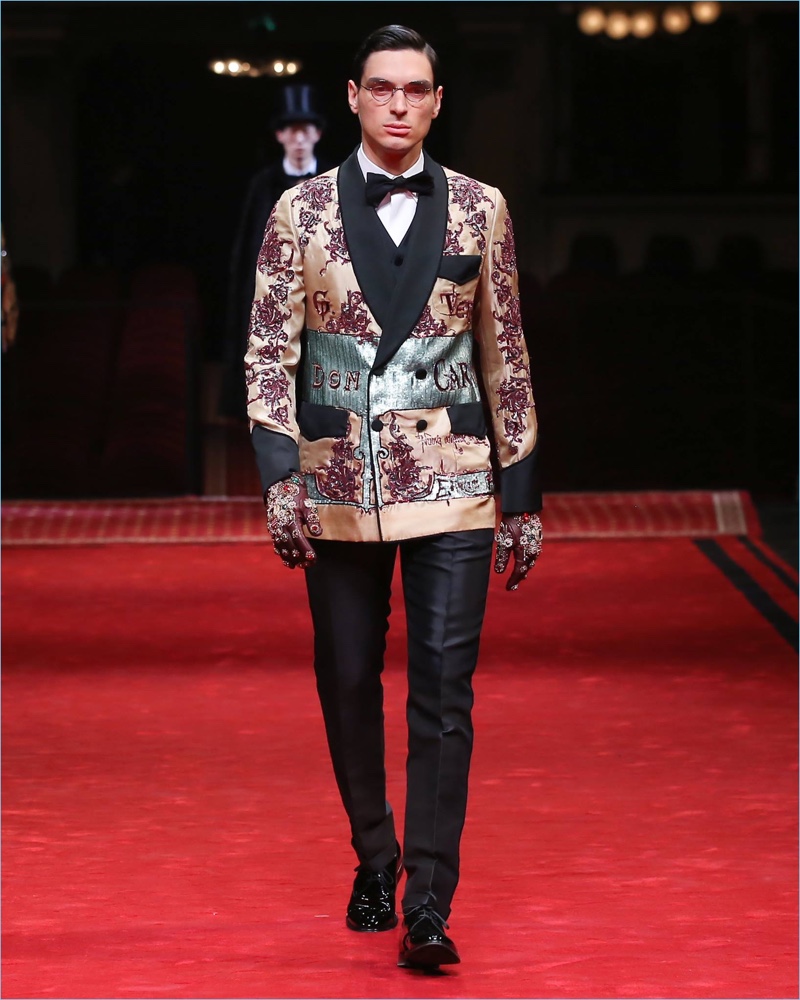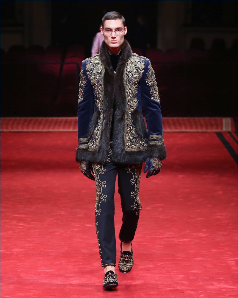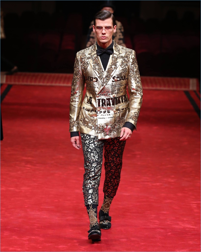 Luxurious topcoats, tailored waistcoats, fur adorned bombers, and graphic tuxedo jackets contribute to an extravagant showing. Exploring La Scala’s archives, several of Dolce & Gabbana’s bold prints referenced storied programs. Sparing no expense, the collection also featured gorgeous brocades, lavish velvets, and floral embellishments.