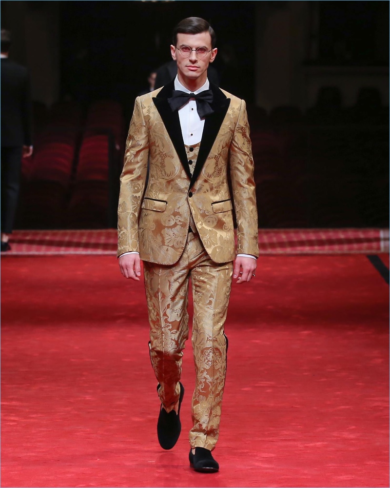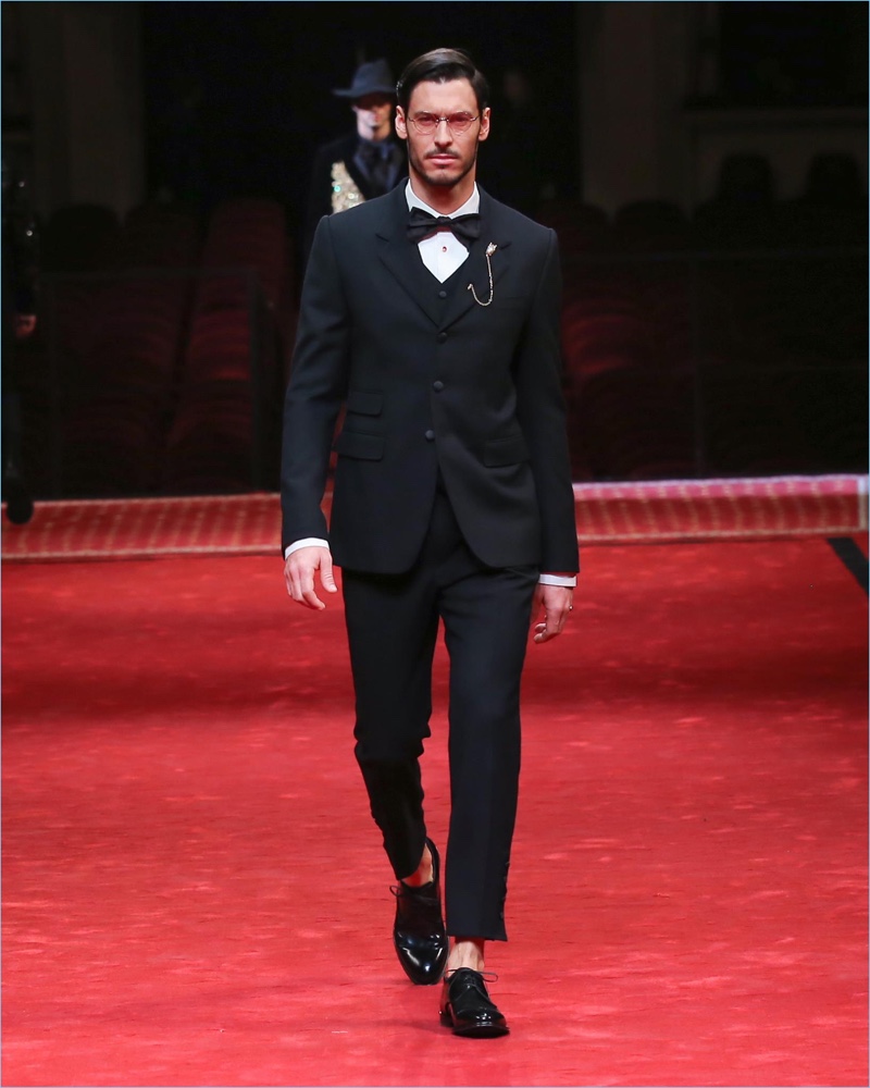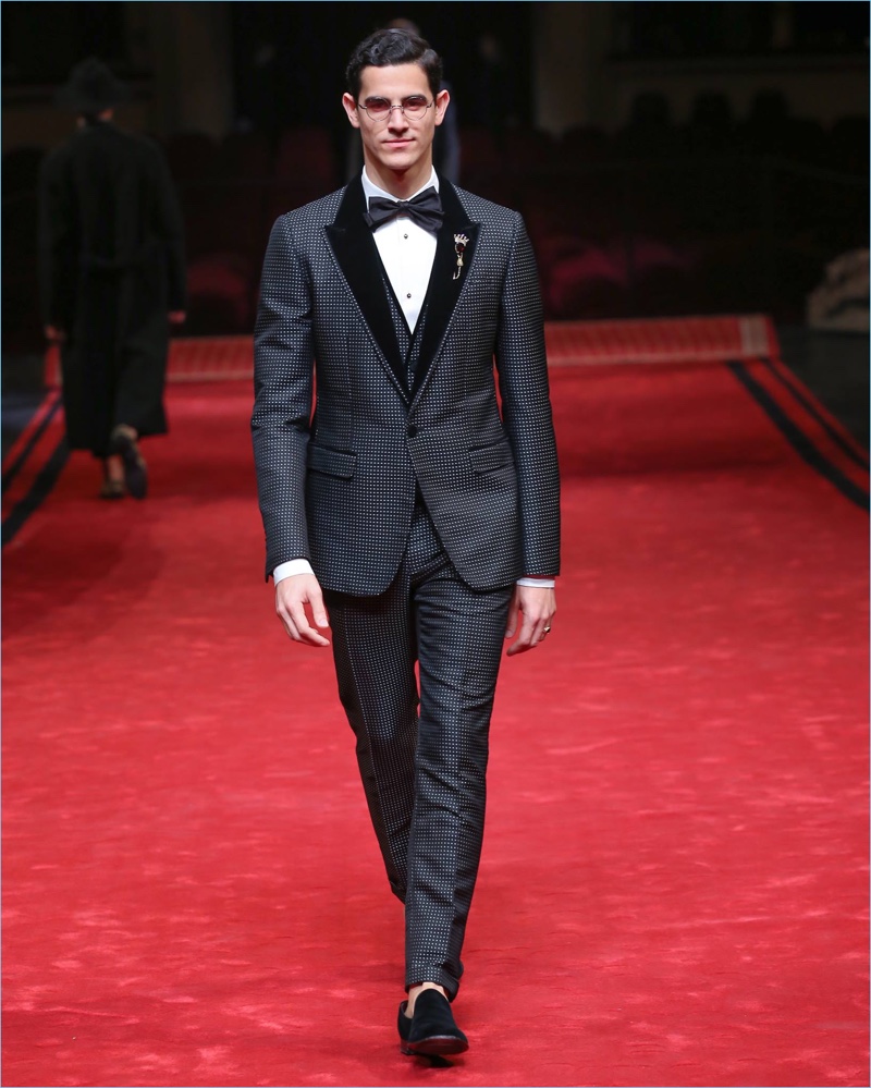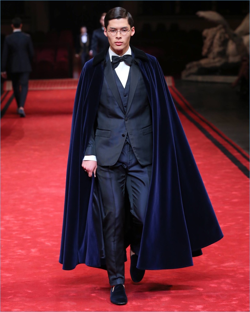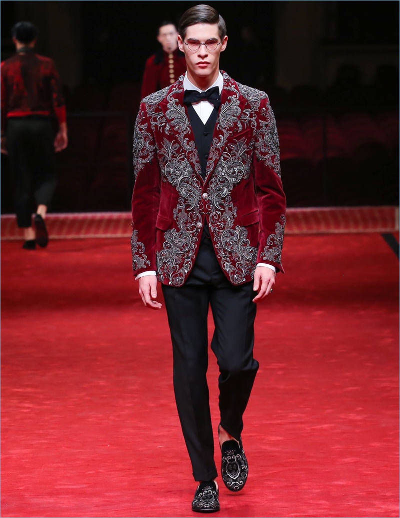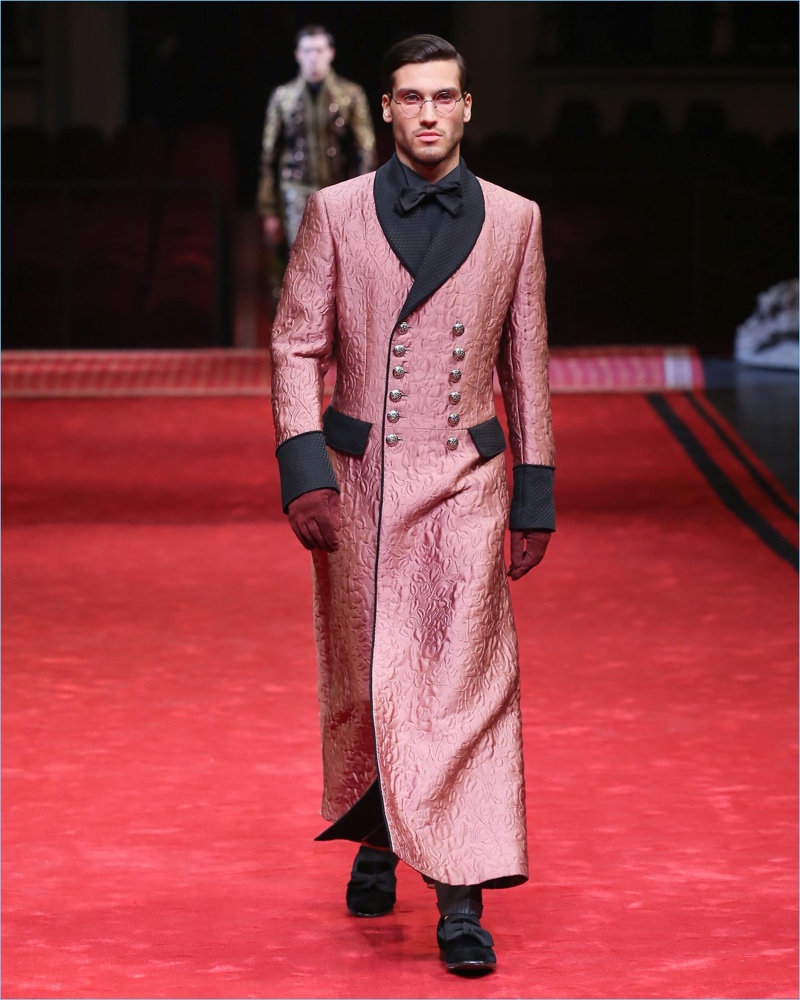 Luxurious topcoats, tailored waistcoats, fur adorned bombers, and graphic tuxedo jackets contribute to an extravagant showing. Exploring La Scala’s archives, several of Dolce & Gabbana’s bold prints referenced storied programs. Sparing no expense, the collection also featured gorgeous brocades, lavish velvets, and floral embellishments.
